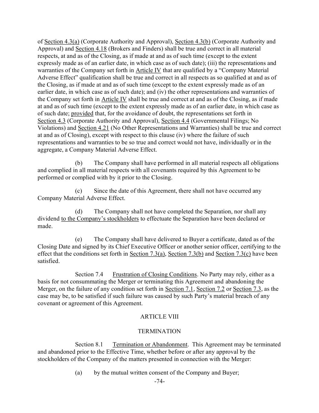-74- of Section 4.3(a) (Corporate Authority and Approval), Section 4.3(b) (Corporate Authority and Approval) and Section 4.18 (Brokers and Finders) shall be true and correct in all material respects, at and as of the Closing, as if made at and as of such time (except to the extent expressly made as of an earlier date, in which case as of such date); (iii) the representations and warranties of the Company set forth in Article IV that are qualified by a “Company Material Adverse Effect” qualification shall be true and correct in all respects as so qualified at and as of the Closing, as if made at and as of such time (except to the extent expressly made as of an earlier date, in which case as of such date); and (iv) the other representations and warranties of the Company set forth in Article IV shall be true and correct at and as of the Closing, as if made at and as of such time (except to the extent expressly made as of an earlier date, in which case as of such date; provided that, for the avoidance of doubt, the representations set forth in Section 4.3 (Corporate Authority and Approval), Section 4.4 (Governmental Filings; No Violations) and Section 4.21 (No Other Representations and Warranties) shall be true and correct at and as of Closing), except with respect to this clause (iv) where the failure of such representations and warranties to be so true and correct would not have, individually or in the aggregate, a Company Material Adverse Effect. (b) The Company shall have performed in all material respects all obligations and complied in all material respects with all covenants required by this Agreement to be performed or complied with by it prior to the Closing. (c) Since the date of this Agreement, there shall not have occurred any Company Material Adverse Effect. (d) The Company shall not have completed the Separation, nor shall any dividend to the Company’s stockholders to effectuate the Separation have been declared or made. (e) The Company shall have delivered to Buyer a certificate, dated as of the Closing Date and signed by its Chief Executive Officer or another senior officer, certifying to the effect that the conditions set forth in Section 7.3(a), Section 7.3(b) and Section 7.3(c) have been satisfied. Section 7.4 Frustration of Closing Conditions. No Party may rely, either as a basis for not consummating the Merger or terminating this Agreement and abandoning the Merger, on the failure of any condition set forth in Section 7.1, Section 7.2 or Section 7.3, as the case may be, to be satisfied if such failure was caused by such Party’s material breach of any covenant or agreement of this Agreement. ARTICLE VIII TERMINATION Section 8.1 Termination or Abandonment. This Agreement may be terminated and abandoned prior to the Effective Time, whether before or after any approval by the stockholders of the Company of the matters presented in connection with the Merger: (a) by the mutual written consent of the Company and Buyer;