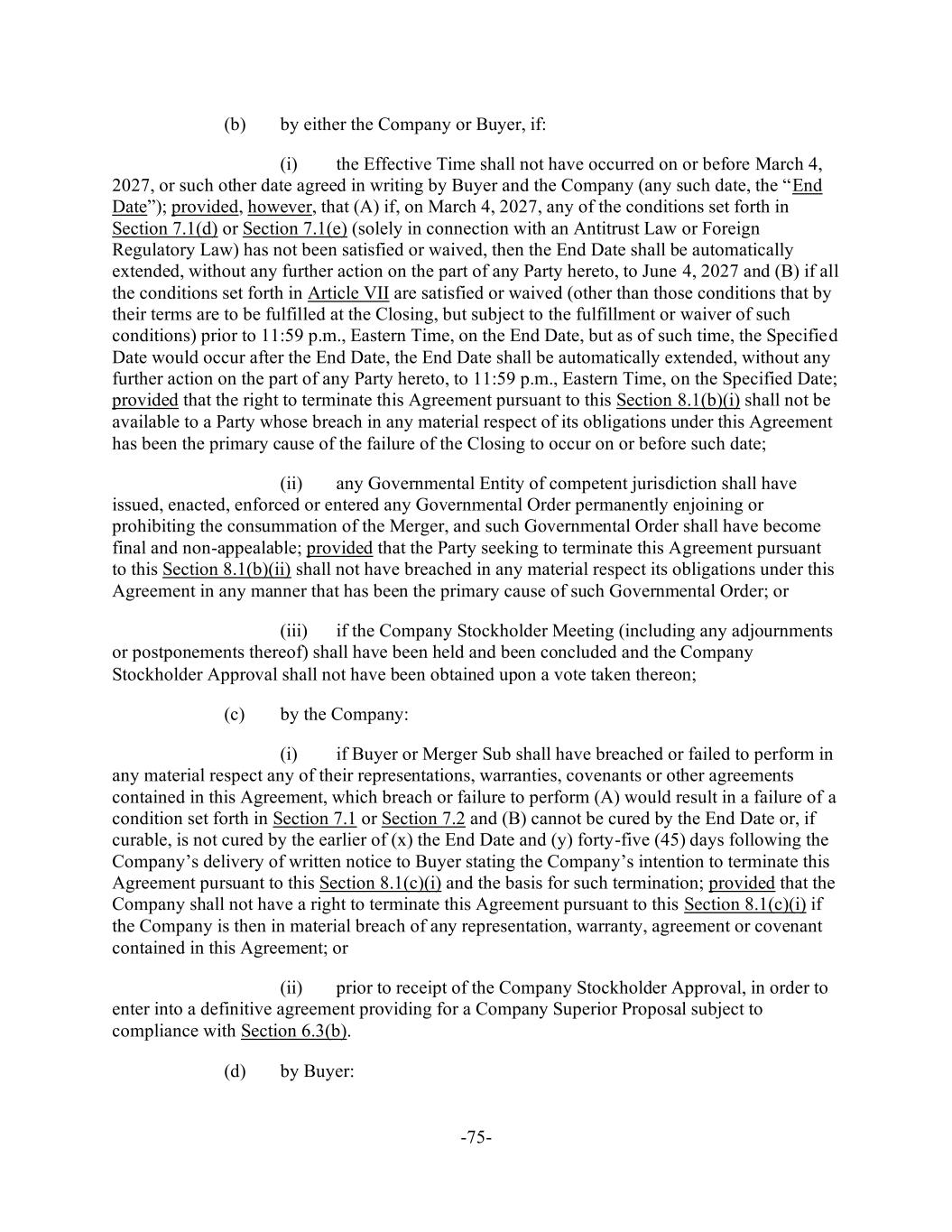-75- (b) by either the Company or Buyer, if: (i) the Effective Time shall not have occurred on or before March 4, 2027, or such other date agreed in writing by Buyer and the Company (any such date, the “End Date”); provided, however, that (A) if, on March 4, 2027, any of the conditions set forth in Section 7.1(d) or Section 7.1(e) (solely in connection with an Antitrust Law or Foreign Regulatory Law) has not been satisfied or waived, then the End Date shall be automatically extended, without any further action on the part of any Party hereto, to June 4, 2027 and (B) if all the conditions set forth in Article VII are satisfied or waived (other than those conditions that by their terms are to be fulfilled at the Closing, but subject to the fulfillment or waiver of such conditions) prior to 11:59 p.m., Eastern Time, on the End Date, but as of such time, the Specified Date would occur after the End Date, the End Date shall be automatically extended, without any further action on the part of any Party hereto, to 11:59 p.m., Eastern Time, on the Specified Date; provided that the right to terminate this Agreement pursuant to this Section 8.1(b)(i) shall not be available to a Party whose breach in any material respect of its obligations under this Agreement has been the primary cause of the failure of the Closing to occur on or before such date; (ii) any Governmental Entity of competent jurisdiction shall have issued, enacted, enforced or entered any Governmental Order permanently enjoining or prohibiting the consummation of the Merger, and such Governmental Order shall have become final and non-appealable; provided that the Party seeking to terminate this Agreement pursuant to this Section 8.1(b)(ii) shall not have breached in any material respect its obligations under this Agreement in any manner that has been the primary cause of such Governmental Order; or (iii) if the Company Stockholder Meeting (including any adjournments or postponements thereof) shall have been held and been concluded and the Company Stockholder Approval shall not have been obtained upon a vote taken thereon; (c) by the Company: (i) if Buyer or Merger Sub shall have breached or failed to perform in any material respect any of their representations, warranties, covenants or other agreements contained in this Agreement, which breach or failure to perform (A) would result in a failure of a condition set forth in Section 7.1 or Section 7.2 and (B) cannot be cured by the End Date or, if curable, is not cured by the earlier of (x) the End Date and (y) forty-five (45) days following the Company’s delivery of written notice to Buyer stating the Company’s intention to terminate this Agreement pursuant to this Section 8.1(c)(i) and the basis for such termination; provided that the Company shall not have a right to terminate this Agreement pursuant to this Section 8.1(c)(i) if the Company is then in material breach of any representation, warranty, agreement or covenant contained in this Agreement; or (ii) prior to receipt of the Company Stockholder Approval, in order to enter into a definitive agreement providing for a Company Superior Proposal subject to compliance with Section 6.3(b). (d) by Buyer: