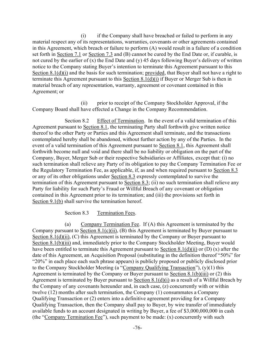 -76- (i) if the Company shall have breached or failed to perform in any material respect any of its representations, warranties, covenants or other agreements contained in this Agreement, which breach or failure to perform (A) would result in a failure of a condition set forth in Section 7.1 or Section 7.3 and (B) cannot be cured by the End Date or, if curable, is not cured by the earlier of (x) the End Date and (y) 45 days following Buyer’s delivery of written notice to the Company stating Buyer’s intention to terminate this Agreement pursuant to this Section 8.1(d)(i) and the basis for such termination; provided, that Buyer shall not have a right to terminate this Agreement pursuant to this Section 8.1(d)(i) if Buyer or Merger Sub is then in material breach of any representation, warranty, agreement or covenant contained in this Agreement; or (ii) prior to receipt of the Company Stockholder Approval, if the Company Board shall have effected a Change in the Company Recommendation. Section 8.2 Effect of Termination. In the event of a valid termination of this Agreement pursuant to Section 8.1, the terminating Party shall forthwith give written notice thereof to the other Party or Parties and this Agreement shall terminate, and the transactions contemplated hereby shall be abandoned, without further action by any of the Parties. In the event of a valid termination of this Agreement pursuant to Section 8.1, this Agreement shall forthwith become null and void and there shall be no liability or obligation on the part of the Company, Buyer, Merger Sub or their respective Subsidiaries or Affiliates, except that: (i) no such termination shall relieve any Party of its obligation to pay the Company Termination Fee or the Regulatory Termination Fee, as applicable, if, as and when required pursuant to Section 8.3 or any of its other obligations under Section 8.3 expressly contemplated to survive the termination of this Agreement pursuant to Section 8.3; (ii) no such termination shall relieve any Party for liability for such Party’s Fraud or Willful Breach of any covenant or obligation contained in this Agreement prior to its termination; and (iii) the provisions set forth in Section 9.1(b) shall survive the termination hereof. Section 8.3 Termination Fees. (a) Company Termination Fee. If (A) this Agreement is terminated by the Company pursuant to Section 8.1(c)(ii), (B) this Agreement is terminated by Buyer pursuant to Section 8.1(d)(ii), (C) this Agreement is terminated by the Company or Buyer pursuant to Section 8.1(b)(iii) and, immediately prior to the Company Stockholder Meeting, Buyer would have been entitled to terminate this Agreement pursuant to Section 8.1(d)(ii) or (D) (x) after the date of this Agreement, an Acquisition Proposal (substituting in the definition thereof “50%” for “20%” in each place each such phrase appears) is publicly proposed or publicly disclosed prior to the Company Stockholder Meeting (a “Company Qualifying Transaction”), (y)(1) this Agreement is terminated by the Company or Buyer pursuant to Section 8.1(b)(iii) or (2) this Agreement is terminated by Buyer pursuant to Section 8.1(d)(i) as a result of a Willful Breach by the Company of any covenants hereunder and, in each case, (z) concurrently with or within twelve (12) months after such termination, the Company (1) consummates a Company Qualifying Transaction or (2) enters into a definitive agreement providing for a Company Qualifying Transaction, then the Company shall pay to Buyer, by wire transfer of immediately available funds to an account designated in writing by Buyer, a fee of $3,000,000,000 in cash (the “Company Termination Fee”), such payment to be made: (x) concurrently with such