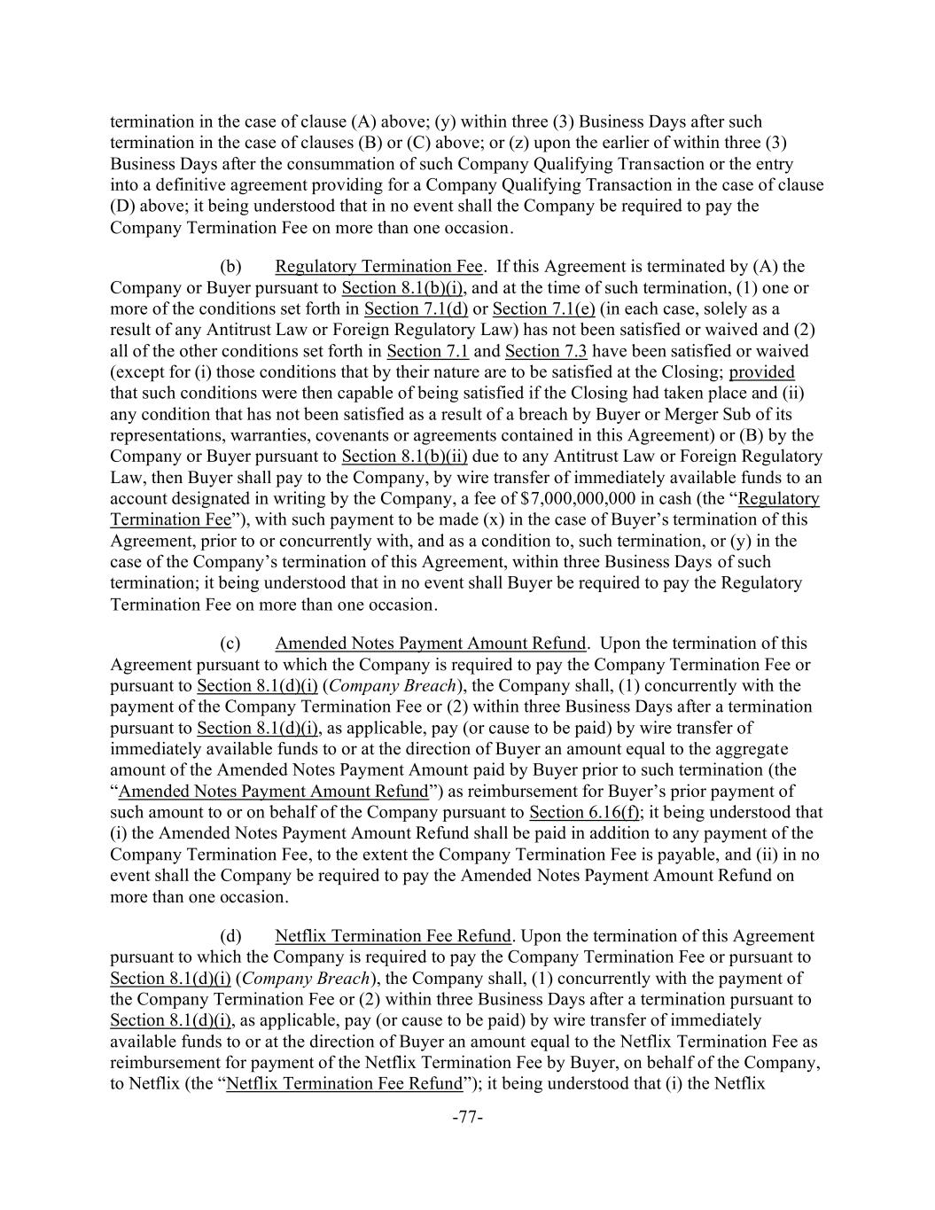 -77- termination in the case of clause (A) above; (y) within three (3) Business Days after such termination in the case of clauses (B) or (C) above; or (z) upon the earlier of within three (3) Business Days after the consummation of such Company Qualifying Transaction or the entry into a definitive agreement providing for a Company Qualifying Transaction in the case of clause (D) above; it being understood that in no event shall the Company be required to pay the Company Termination Fee on more than one occasion. (b) Regulatory Termination Fee. If this Agreement is terminated by (A) the Company or Buyer pursuant to Section 8.1(b)(i), and at the time of such termination, (1) one or more of the conditions set forth in Section 7.1(d) or Section 7.1(e) (in each case, solely as a result of any Antitrust Law or Foreign Regulatory Law) has not been satisfied or waived and (2) all of the other conditions set forth in Section 7.1 and Section 7.3 have been satisfied or waived (except for (i) those conditions that by their nature are to be satisfied at the Closing; provided that such conditions were then capable of being satisfied if the Closing had taken place and (ii) any condition that has not been satisfied as a result of a breach by Buyer or Merger Sub of its representations, warranties, covenants or agreements contained in this Agreement) or (B) by the Company or Buyer pursuant to Section 8.1(b)(ii) due to any Antitrust Law or Foreign Regulatory Law, then Buyer shall pay to the Company, by wire transfer of immediately available funds to an account designated in writing by the Company, a fee of $7,000,000,000 in cash (the “Regulatory Termination Fee”), with such payment to be made (x) in the case of Buyer’s termination of this Agreement, prior to or concurrently with, and as a condition to, such termination, or (y) in the case of the Company’s termination of this Agreement, within three Business Days of such termination; it being understood that in no event shall Buyer be required to pay the Regulatory Termination Fee on more than one occasion. (c) Amended Notes Payment Amount Refund. Upon the termination of this Agreement pursuant to which the Company is required to pay the Company Termination Fee or pursuant to Section 8.1(d)(i) (Company Breach), the Company shall, (1) concurrently with the payment of the Company Termination Fee or (2) within three Business Days after a termination pursuant to Section 8.1(d)(i), as applicable, pay (or cause to be paid) by wire transfer of immediately available funds to or at the direction of Buyer an amount equal to the aggregate amount of the Amended Notes Payment Amount paid by Buyer prior to such termination (the “Amended Notes Payment Amount Refund”) as reimbursement for Buyer’s prior payment of such amount to or on behalf of the Company pursuant to Section 6.16(f); it being understood that (i) the Amended Notes Payment Amount Refund shall be paid in addition to any payment of the Company Termination Fee, to the extent the Company Termination Fee is payable, and (ii) in no event shall the Company be required to pay the Amended Notes Payment Amount Refund on more than one occasion. (d) Netflix Termination Fee Refund. Upon the termination of this Agreement pursuant to which the Company is required to pay the Company Termination Fee or pursuant to Section 8.1(d)(i) (Company Breach), the Company shall, (1) concurrently with the payment of the Company Termination Fee or (2) within three Business Days after a termination pursuant to Section 8.1(d)(i), as applicable, pay (or cause to be paid) by wire transfer of immediately available funds to or at the direction of Buyer an amount equal to the Netflix Termination Fee as reimbursement for payment of the Netflix Termination Fee by Buyer, on behalf of the Company, to Netflix (the “Netflix Termination Fee Refund”); it being understood that (i) the Netflix
