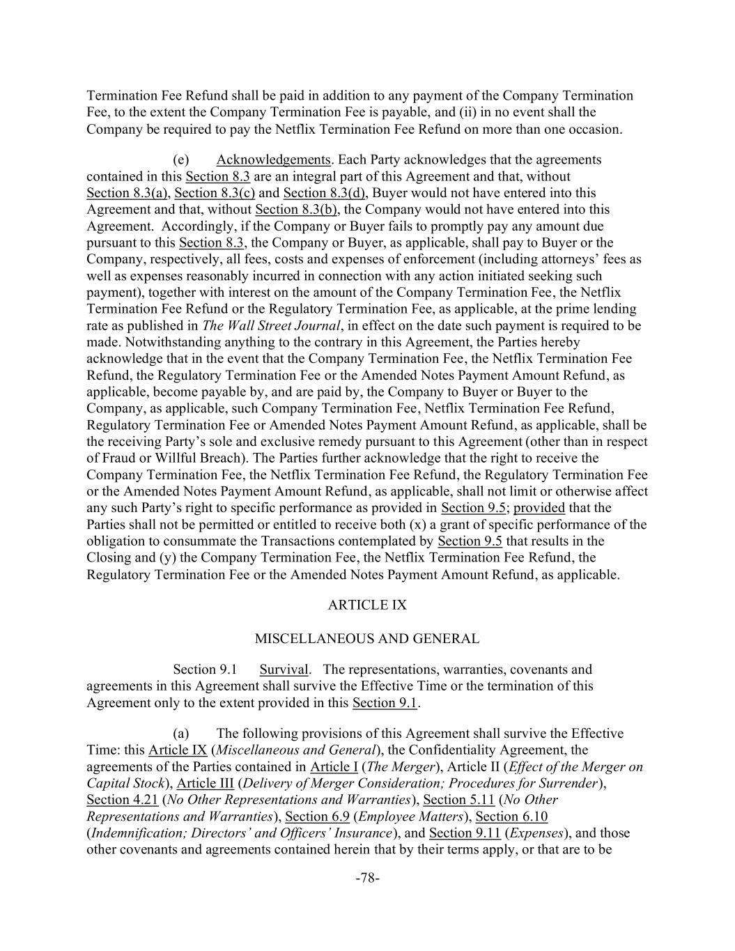 -78- Termination Fee Refund shall be paid in addition to any payment of the Company Termination Fee, to the extent the Company Termination Fee is payable, and (ii) in no event shall the Company be required to pay the Netflix Termination Fee Refund on more than one occasion. (e) Acknowledgements. Each Party acknowledges that the agreements contained in this Section 8.3 are an integral part of this Agreement and that, without Section 8.3(a), Section 8.3(c) and Section 8.3(d), Buyer would not have entered into this Agreement and that, without Section 8.3(b), the Company would not have entered into this Agreement. Accordingly, if the Company or Buyer fails to promptly pay any amount due pursuant to this Section 8.3, the Company or Buyer, as applicable, shall pay to Buyer or the Company, respectively, all fees, costs and expenses of enforcement (including attorneys’ fees as well as expenses reasonably incurred in connection with any action initiated seeking such payment), together with interest on the amount of the Company Termination Fee, the Netflix Termination Fee Refund or the Regulatory Termination Fee, as applicable, at the prime lending rate as published in The Wall Street Journal, in effect on the date such payment is required to be made. Notwithstanding anything to the contrary in this Agreement, the Parties hereby acknowledge that in the event that the Company Termination Fee, the Netflix Termination Fee Refund, the Regulatory Termination Fee or the Amended Notes Payment Amount Refund, as applicable, become payable by, and are paid by, the Company to Buyer or Buyer to the Company, as applicable, such Company Termination Fee, Netflix Termination Fee Refund, Regulatory Termination Fee or Amended Notes Payment Amount Refund, as applicable, shall be the receiving Party’s sole and exclusive remedy pursuant to this Agreement (other than in respect of Fraud or Willful Breach). The Parties further acknowledge that the right to receive the Company Termination Fee, the Netflix Termination Fee Refund, the Regulatory Termination Fee or the Amended Notes Payment Amount Refund, as applicable, shall not limit or otherwise affect any such Party’s right to specific performance as provided in Section 9.5; provided that the Parties shall not be permitted or entitled to receive both (x) a grant of specific performance of the obligation to consummate the Transactions contemplated by Section 9.5 that results in the Closing and (y) the Company Termination Fee, the Netflix Termination Fee Refund, the Regulatory Termination Fee or the Amended Notes Payment Amount Refund, as applicable. ARTICLE IX MISCELLANEOUS AND GENERAL Section 9.1 Survival. The representations, warranties, covenants and agreements in this Agreement shall survive the Effective Time or the termination of this Agreement only to the extent provided in this Section 9.1. (a) The following provisions of this Agreement shall survive the Effective Time: this Article IX (Miscellaneous and General), the Confidentiality Agreement, the agreements of the Parties contained in Article I (The Merger), Article II (Effect of the Merger on Capital Stock), Article III (Delivery of Merger Consideration; Procedures for Surrender), Section 4.21 (No Other Representations and Warranties), Section 5.11 (No Other Representations and Warranties), Section 6.9 (Employee Matters), Section 6.10 (Indemnification; Directors’ and Officers’ Insurance), and Section 9.11 (Expenses), and those other covenants and agreements contained herein that by their terms apply, or that are to be