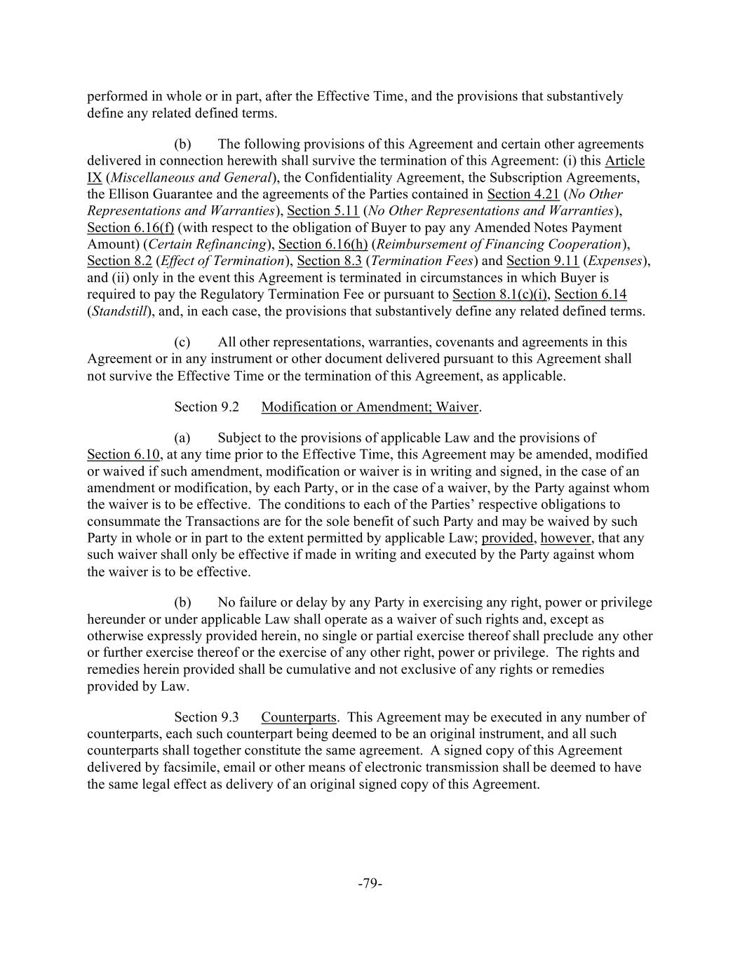 -79- performed in whole or in part, after the Effective Time, and the provisions that substantively define any related defined terms. (b) The following provisions of this Agreement and certain other agreements delivered in connection herewith shall survive the termination of this Agreement: (i) this Article IX (Miscellaneous and General), the Confidentiality Agreement, the Subscription Agreements, the Ellison Guarantee and the agreements of the Parties contained in Section 4.21 (No Other Representations and Warranties), Section 5.11 (No Other Representations and Warranties), Section 6.16(f) (with respect to the obligation of Buyer to pay any Amended Notes Payment Amount) (Certain Refinancing), Section 6.16(h) (Reimbursement of Financing Cooperation), Section 8.2 (Effect of Termination), Section 8.3 (Termination Fees) and Section 9.11 (Expenses), and (ii) only in the event this Agreement is terminated in circumstances in which Buyer is required to pay the Regulatory Termination Fee or pursuant to Section 8.1(c)(i), Section 6.14 (Standstill), and, in each case, the provisions that substantively define any related defined terms. (c) All other representations, warranties, covenants and agreements in this Agreement or in any instrument or other document delivered pursuant to this Agreement shall not survive the Effective Time or the termination of this Agreement, as applicable. Section 9.2 Modification or Amendment; Waiver. (a) Subject to the provisions of applicable Law and the provisions of Section 6.10, at any time prior to the Effective Time, this Agreement may be amended, modified or waived if such amendment, modification or waiver is in writing and signed, in the case of an amendment or modification, by each Party, or in the case of a waiver, by the Party against whom the waiver is to be effective. The conditions to each of the Parties’ respective obligations to consummate the Transactions are for the sole benefit of such Party and may be waived by such Party in whole or in part to the extent permitted by applicable Law; provided, however, that any such waiver shall only be effective if made in writing and executed by the Party against whom the waiver is to be effective. (b) No failure or delay by any Party in exercising any right, power or privilege hereunder or under applicable Law shall operate as a waiver of such rights and, except as otherwise expressly provided herein, no single or partial exercise thereof shall preclude any other or further exercise thereof or the exercise of any other right, power or privilege. The rights and remedies herein provided shall be cumulative and not exclusive of any rights or remedies provided by Law. Section 9.3 Counterparts. This Agreement may be executed in any number of counterparts, each such counterpart being deemed to be an original instrument, and all such counterparts shall together constitute the same agreement. A signed copy of this Agreement delivered by facsimile, email or other means of electronic transmission shall be deemed to have the same legal effect as delivery of an original signed copy of this Agreement.