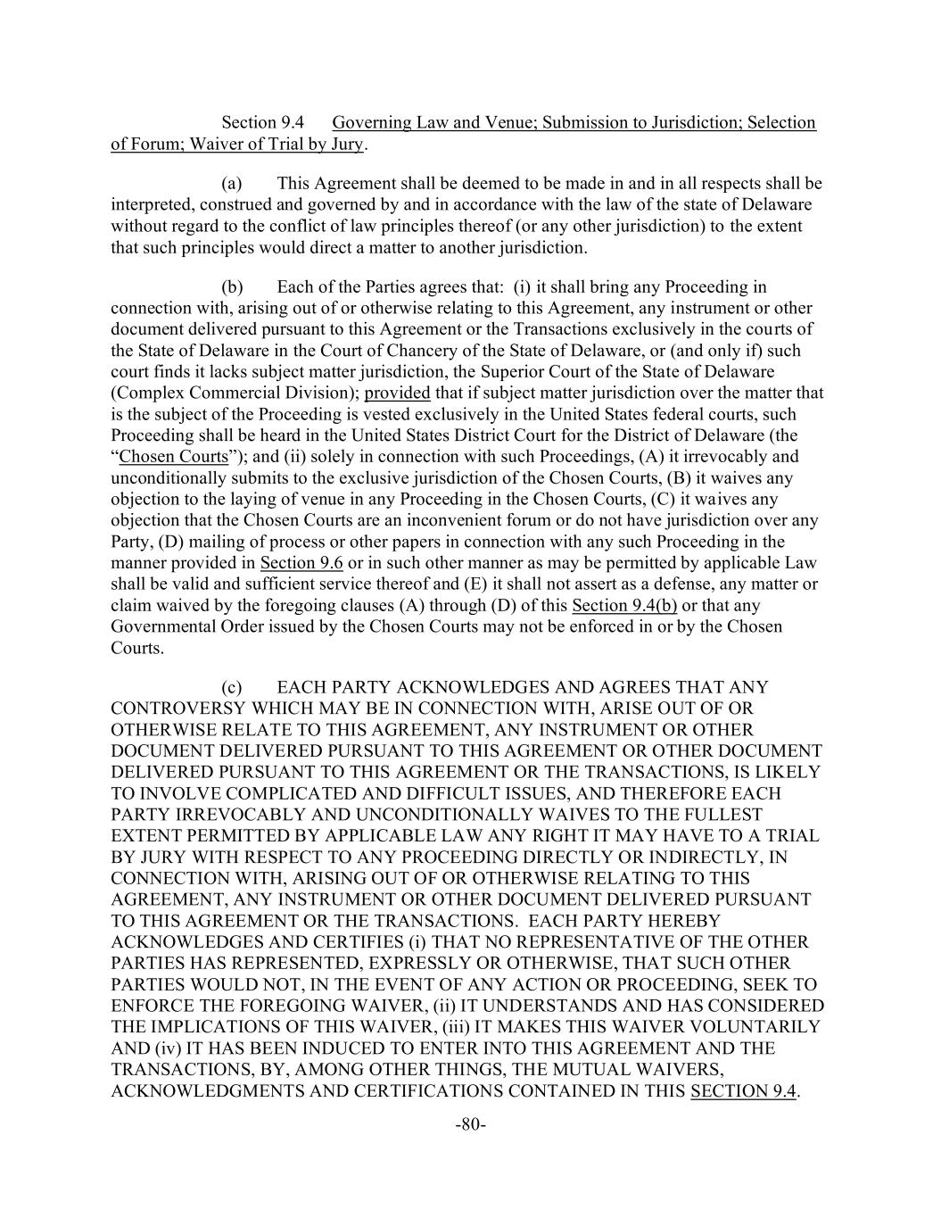 -80- Section 9.4 Governing Law and Venue; Submission to Jurisdiction; Selection of Forum; Waiver of Trial by Jury. (a) This Agreement shall be deemed to be made in and in all respects shall be interpreted, construed and governed by and in accordance with the law of the state of Delaware without regard to the conflict of law principles thereof (or any other jurisdiction) to the extent that such principles would direct a matter to another jurisdiction. (b) Each of the Parties agrees that: (i) it shall bring any Proceeding in connection with, arising out of or otherwise relating to this Agreement, any instrument or other document delivered pursuant to this Agreement or the Transactions exclusively in the courts of the State of Delaware in the Court of Chancery of the State of Delaware, or (and only if) such court finds it lacks subject matter jurisdiction, the Superior Court of the State of Delaware (Complex Commercial Division); provided that if subject matter jurisdiction over the matter that is the subject of the Proceeding is vested exclusively in the United States federal courts, such Proceeding shall be heard in the United States District Court for the District of Delaware (the “Chosen Courts”); and (ii) solely in connection with such Proceedings, (A) it irrevocably and unconditionally submits to the exclusive jurisdiction of the Chosen Courts, (B) it waives any objection to the laying of venue in any Proceeding in the Chosen Courts, (C) it waives any objection that the Chosen Courts are an inconvenient forum or do not have jurisdiction over any Party, (D) mailing of process or other papers in connection with any such Proceeding in the manner provided in Section 9.6 or in such other manner as may be permitted by applicable Law shall be valid and sufficient service thereof and (E) it shall not assert as a defense, any matter or claim waived by the foregoing clauses (A) through (D) of this Section 9.4(b) or that any Governmental Order issued by the Chosen Courts may not be enforced in or by the Chosen Courts. (c) EACH PARTY ACKNOWLEDGES AND AGREES THAT ANY CONTROVERSY WHICH MAY BE IN CONNECTION WITH, ARISE OUT OF OR OTHERWISE RELATE TO THIS AGREEMENT, ANY INSTRUMENT OR OTHER DOCUMENT DELIVERED PURSUANT TO THIS AGREEMENT OR OTHER DOCUMENT DELIVERED PURSUANT TO THIS AGREEMENT OR THE TRANSACTIONS, IS LIKELY TO INVOLVE COMPLICATED AND DIFFICULT ISSUES, AND THEREFORE EACH PARTY IRREVOCABLY AND UNCONDITIONALLY WAIVES TO THE FULLEST EXTENT PERMITTED BY APPLICABLE LAW ANY RIGHT IT MAY HAVE TO A TRIAL BY JURY WITH RESPECT TO ANY PROCEEDING DIRECTLY OR INDIRECTLY, IN CONNECTION WITH, ARISING OUT OF OR OTHERWISE RELATING TO THIS AGREEMENT, ANY INSTRUMENT OR OTHER DOCUMENT DELIVERED PURSUANT TO THIS AGREEMENT OR THE TRANSACTIONS. EACH PARTY HEREBY ACKNOWLEDGES AND CERTIFIES (i) THAT NO REPRESENTATIVE OF THE OTHER PARTIES HAS REPRESENTED, EXPRESSLY OR OTHERWISE, THAT SUCH OTHER PARTIES WOULD NOT, IN THE EVENT OF ANY ACTION OR PROCEEDING, SEEK TO ENFORCE THE FOREGOING WAIVER, (ii) IT UNDERSTANDS AND HAS CONSIDERED THE IMPLICATIONS OF THIS WAIVER, (iii) IT MAKES THIS WAIVER VOLUNTARILY AND (iv) IT HAS BEEN INDUCED TO ENTER INTO THIS AGREEMENT AND THE TRANSACTIONS, BY, AMONG OTHER THINGS, THE MUTUAL WAIVERS, ACKNOWLEDGMENTS AND CERTIFICATIONS CONTAINED IN THIS SECTION 9.4.