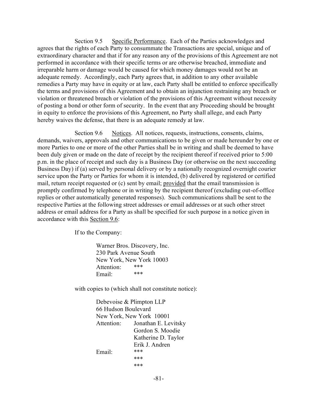 -81- Section 9.5 Specific Performance. Each of the Parties acknowledges and agrees that the rights of each Party to consummate the Transactions are special, unique and of extraordinary character and that if for any reason any of the provisions of this Agreement are not performed in accordance with their specific terms or are otherwise breached, immediate and irreparable harm or damage would be caused for which money damages would not be an adequate remedy. Accordingly, each Party agrees that, in addition to any other available remedies a Party may have in equity or at law, each Party shall be entitled to enforce specifically the terms and provisions of this Agreement and to obtain an injunction restraining any breach or violation or threatened breach or violation of the provisions of this Agreement without necessity of posting a bond or other form of security. In the event that any Proceeding should be brought in equity to enforce the provisions of this Agreement, no Party shall allege, and each Party hereby waives the defense, that there is an adequate remedy at law. Section 9.6 Notices. All notices, requests, instructions, consents, claims, demands, waivers, approvals and other communications to be given or made hereunder by one or more Parties to one or more of the other Parties shall be in writing and shall be deemed to have been duly given or made on the date of receipt by the recipient thereof if received prior to 5:00 p.m. in the place of receipt and such day is a Business Day (or otherwise on the next succeeding Business Day) if (a) served by personal delivery or by a nationally recognized overnight courier service upon the Party or Parties for whom it is intended, (b) delivered by registered or certified mail, return receipt requested or (c) sent by email; provided that the email transmission is promptly confirmed by telephone or in writing by the recipient thereof (excluding out-of-office replies or other automatically generated responses). Such communications shall be sent to the respective Parties at the following street addresses or email addresses or at such other street address or email address for a Party as shall be specified for such purpose in a notice given in accordance with this Section 9.6: If to the Company: Warner Bros. Discovery, Inc. 230 Park Avenue South New York, New York 10003 Attention: *** Email: *** with copies to (which shall not constitute notice): Debevoise & Plimpton LLP 66 Hudson Boulevard New York, New York 10001 Attention: Jonathan E. Levitsky Gordon S. Moodie Katherine D. Taylor Erik J. Andren Email: *** *** ***