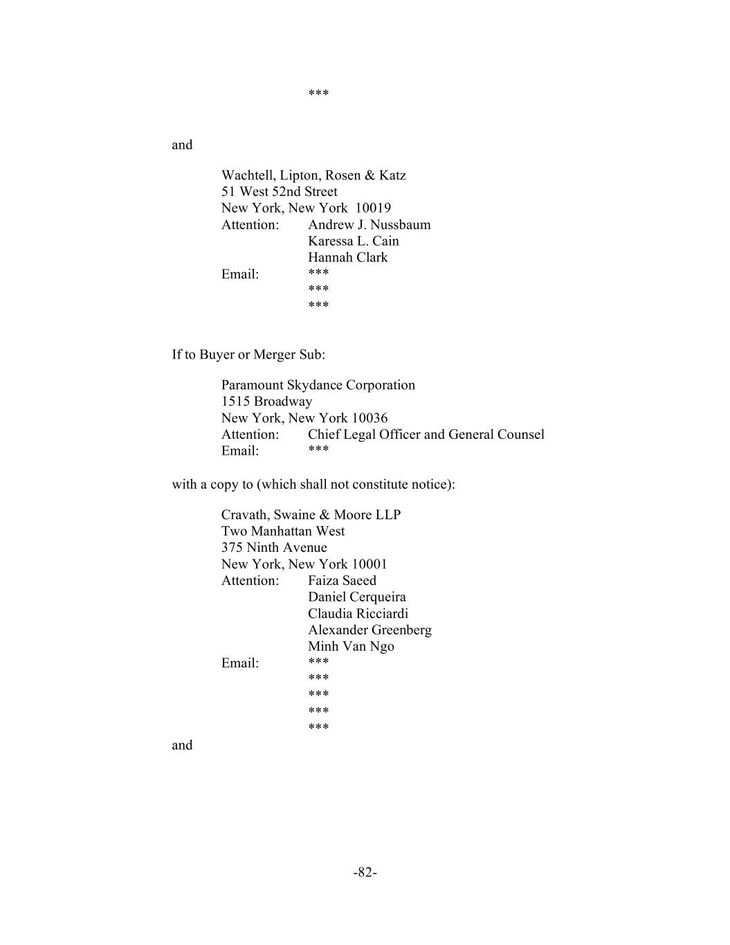 -82- *** and Wachtell, Lipton, Rosen & Katz 51 West 52nd Street New York, New York 10019 Attention: Andrew J. Nussbaum Karessa L. Cain Hannah Clark Email: *** *** *** If to Buyer or Merger Sub: Paramount Skydance Corporation 1515 Broadway New York, New York 10036 Attention: Chief Legal Officer and General Counsel Email: *** with a copy to (which shall not constitute notice): Cravath, Swaine & Moore LLP Two Manhattan West 375 Ninth Avenue New York, New York 10001 Attention: Faiza Saeed Daniel Cerqueira Claudia Ricciardi Alexander Greenberg Minh Van Ngo Email: *** *** *** *** *** and