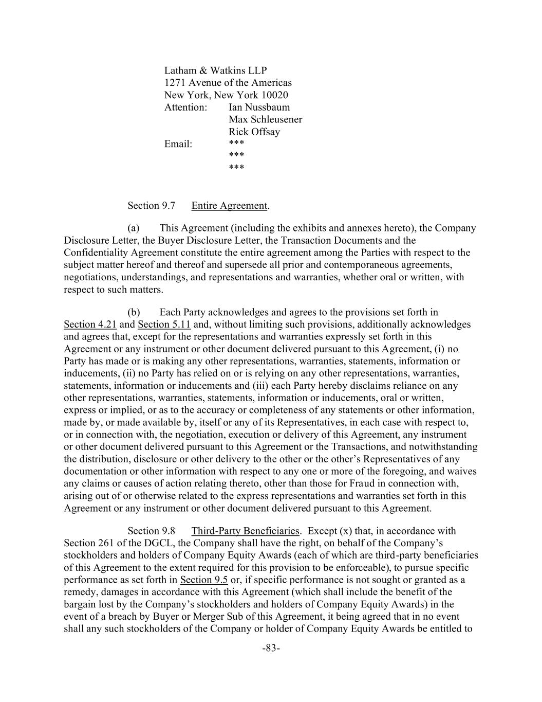 -83- Latham & Watkins LLP 1271 Avenue of the Americas New York, New York 10020 Attention: Ian Nussbaum Max Schleusener Rick Offsay Email: *** *** *** Section 9.7 Entire Agreement. (a) This Agreement (including the exhibits and annexes hereto), the Company Disclosure Letter, the Buyer Disclosure Letter, the Transaction Documents and the Confidentiality Agreement constitute the entire agreement among the Parties with respect to the subject matter hereof and thereof and supersede all prior and contemporaneous agreements, negotiations, understandings, and representations and warranties, whether oral or written, with respect to such matters. (b) Each Party acknowledges and agrees to the provisions set forth in Section 4.21 and Section 5.11 and, without limiting such provisions, additionally acknowledges and agrees that, except for the representations and warranties expressly set forth in this Agreement or any instrument or other document delivered pursuant to this Agreement, (i) no Party has made or is making any other representations, warranties, statements, information or inducements, (ii) no Party has relied on or is relying on any other representations, warranties, statements, information or inducements and (iii) each Party hereby disclaims reliance on any other representations, warranties, statements, information or inducements, oral or written, express or implied, or as to the accuracy or completeness of any statements or other information, made by, or made available by, itself or any of its Representatives, in each case with respect to, or in connection with, the negotiation, execution or delivery of this Agreement, any instrument or other document delivered pursuant to this Agreement or the Transactions, and notwithstanding the distribution, disclosure or other delivery to the other or the other’s Representatives of any documentation or other information with respect to any one or more of the foregoing, and waives any claims or causes of action relating thereto, other than those for Fraud in connection with, arising out of or otherwise related to the express representations and warranties set forth in this Agreement or any instrument or other document delivered pursuant to this Agreement. Section 9.8 Third-Party Beneficiaries. Except (x) that, in accordance with Section 261 of the DGCL, the Company shall have the right, on behalf of the Company’s stockholders and holders of Company Equity Awards (each of which are third-party beneficiaries of this Agreement to the extent required for this provision to be enforceable), to pursue specific performance as set forth in Section 9.5 or, if specific performance is not sought or granted as a remedy, damages in accordance with this Agreement (which shall include the benefit of the bargain lost by the Company’s stockholders and holders of Company Equity Awards) in the event of a breach by Buyer or Merger Sub of this Agreement, it being agreed that in no event shall any such stockholders of the Company or holder of Company Equity Awards be entitled to
