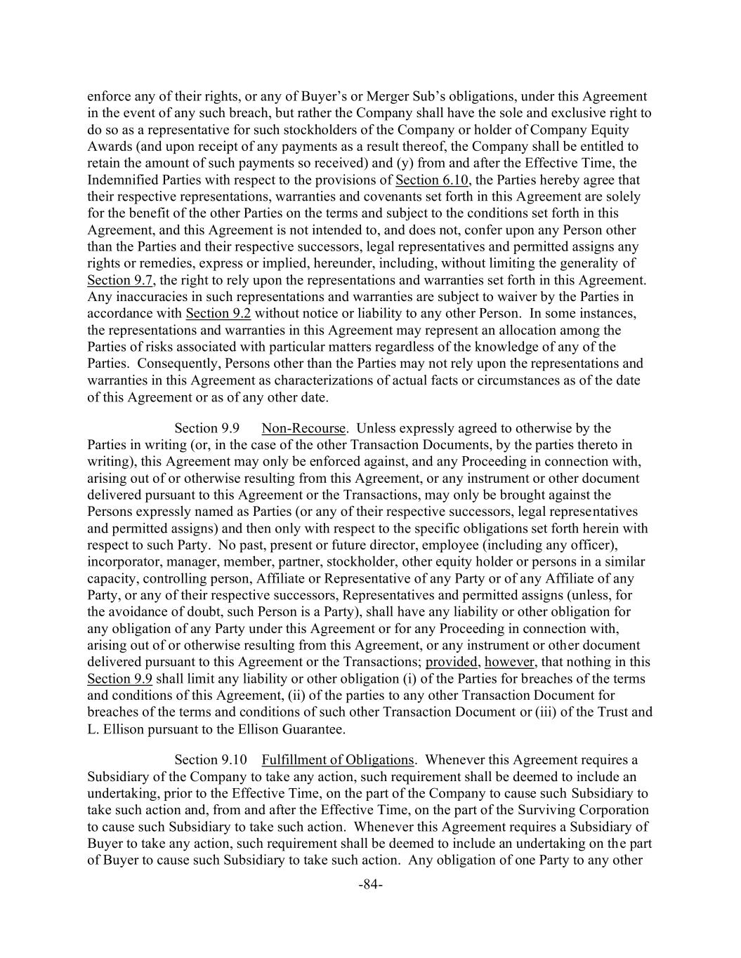 -84- enforce any of their rights, or any of Buyer’s or Merger Sub’s obligations, under this Agreement in the event of any such breach, but rather the Company shall have the sole and exclusive right to do so as a representative for such stockholders of the Company or holder of Company Equity Awards (and upon receipt of any payments as a result thereof, the Company shall be entitled to retain the amount of such payments so received) and (y) from and after the Effective Time, the Indemnified Parties with respect to the provisions of Section 6.10, the Parties hereby agree that their respective representations, warranties and covenants set forth in this Agreement are solely for the benefit of the other Parties on the terms and subject to the conditions set forth in this Agreement, and this Agreement is not intended to, and does not, confer upon any Person other than the Parties and their respective successors, legal representatives and permitted assigns any rights or remedies, express or implied, hereunder, including, without limiting the generality of Section 9.7, the right to rely upon the representations and warranties set forth in this Agreement. Any inaccuracies in such representations and warranties are subject to waiver by the Parties in accordance with Section 9.2 without notice or liability to any other Person. In some instances, the representations and warranties in this Agreement may represent an allocation among the Parties of risks associated with particular matters regardless of the knowledge of any of the Parties. Consequently, Persons other than the Parties may not rely upon the representations and warranties in this Agreement as characterizations of actual facts or circumstances as of the date of this Agreement or as of any other date. Section 9.9 Non-Recourse. Unless expressly agreed to otherwise by the Parties in writing (or, in the case of the other Transaction Documents, by the parties thereto in writing), this Agreement may only be enforced against, and any Proceeding in connection with, arising out of or otherwise resulting from this Agreement, or any instrument or other document delivered pursuant to this Agreement or the Transactions, may only be brought against the Persons expressly named as Parties (or any of their respective successors, legal representatives and permitted assigns) and then only with respect to the specific obligations set forth herein with respect to such Party. No past, present or future director, employee (including any officer), incorporator, manager, member, partner, stockholder, other equity holder or persons in a similar capacity, controlling person, Affiliate or Representative of any Party or of any Affiliate of any Party, or any of their respective successors, Representatives and permitted assigns (unless, for the avoidance of doubt, such Person is a Party), shall have any liability or other obligation for any obligation of any Party under this Agreement or for any Proceeding in connection with, arising out of or otherwise resulting from this Agreement, or any instrument or other document delivered pursuant to this Agreement or the Transactions; provided, however, that nothing in this Section 9.9 shall limit any liability or other obligation (i) of the Parties for breaches of the terms and conditions of this Agreement, (ii) of the parties to any other Transaction Document for breaches of the terms and conditions of such other Transaction Document or (iii) of the Trust and L. Ellison pursuant to the Ellison Guarantee. Section 9.10 Fulfillment of Obligations. Whenever this Agreement requires a Subsidiary of the Company to take any action, such requirement shall be deemed to include an undertaking, prior to the Effective Time, on the part of the Company to cause such Subsidiary to take such action and, from and after the Effective Time, on the part of the Surviving Corporation to cause such Subsidiary to take such action. Whenever this Agreement requires a Subsidiary of Buyer to take any action, such requirement shall be deemed to include an undertaking on the part of Buyer to cause such Subsidiary to take such action. Any obligation of one Party to any other