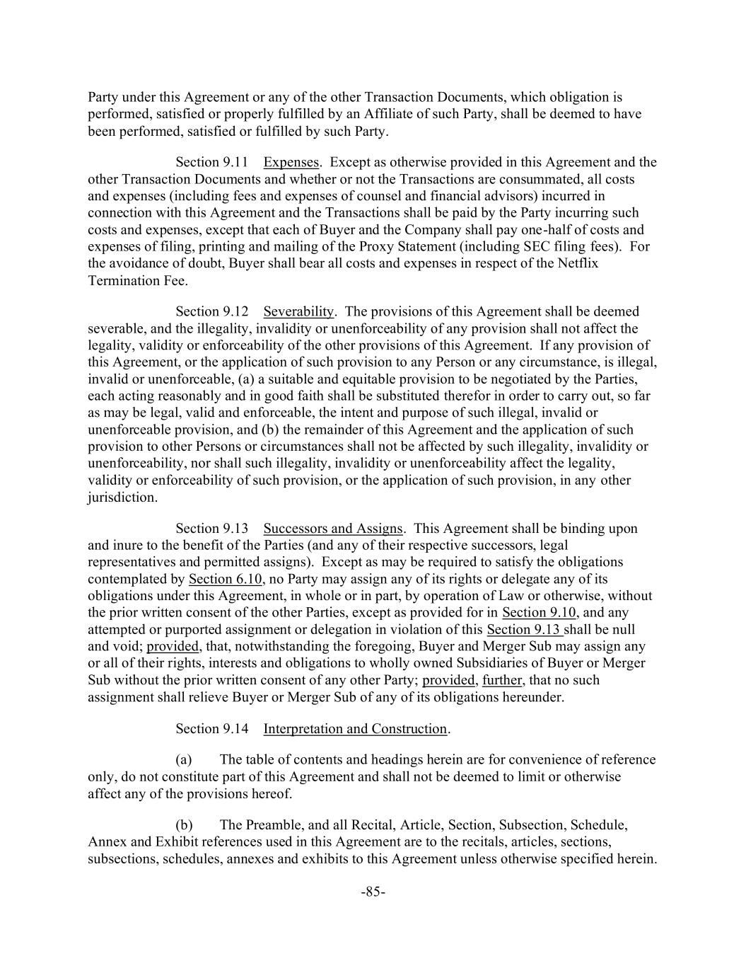 -85- Party under this Agreement or any of the other Transaction Documents, which obligation is performed, satisfied or properly fulfilled by an Affiliate of such Party, shall be deemed to have been performed, satisfied or fulfilled by such Party. Section 9.11 Expenses. Except as otherwise provided in this Agreement and the other Transaction Documents and whether or not the Transactions are consummated, all costs and expenses (including fees and expenses of counsel and financial advisors) incurred in connection with this Agreement and the Transactions shall be paid by the Party incurring such costs and expenses, except that each of Buyer and the Company shall pay one-half of costs and expenses of filing, printing and mailing of the Proxy Statement (including SEC filing fees). For the avoidance of doubt, Buyer shall bear all costs and expenses in respect of the Netflix Termination Fee. Section 9.12 Severability. The provisions of this Agreement shall be deemed severable, and the illegality, invalidity or unenforceability of any provision shall not affect the legality, validity or enforceability of the other provisions of this Agreement. If any provision of this Agreement, or the application of such provision to any Person or any circumstance, is illegal, invalid or unenforceable, (a) a suitable and equitable provision to be negotiated by the Parties, each acting reasonably and in good faith shall be substituted therefor in order to carry out, so far as may be legal, valid and enforceable, the intent and purpose of such illegal, invalid or unenforceable provision, and (b) the remainder of this Agreement and the application of such provision to other Persons or circumstances shall not be affected by such illegality, invalidity or unenforceability, nor shall such illegality, invalidity or unenforceability affect the legality, validity or enforceability of such provision, or the application of such provision, in any other jurisdiction. Section 9.13 Successors and Assigns. This Agreement shall be binding upon and inure to the benefit of the Parties (and any of their respective successors, legal representatives and permitted assigns). Except as may be required to satisfy the obligations contemplated by Section 6.10, no Party may assign any of its rights or delegate any of its obligations under this Agreement, in whole or in part, by operation of Law or otherwise, without the prior written consent of the other Parties, except as provided for in Section 9.10, and any attempted or purported assignment or delegation in violation of this Section 9.13 shall be null and void; provided, that, notwithstanding the foregoing, Buyer and Merger Sub may assign any or all of their rights, interests and obligations to wholly owned Subsidiaries of Buyer or Merger Sub without the prior written consent of any other Party; provided, further, that no such assignment shall relieve Buyer or Merger Sub of any of its obligations hereunder. Section 9.14 Interpretation and Construction. (a) The table of contents and headings herein are for convenience of reference only, do not constitute part of this Agreement and shall not be deemed to limit or otherwise affect any of the provisions hereof. (b) The Preamble, and all Recital, Article, Section, Subsection, Schedule, Annex and Exhibit references used in this Agreement are to the recitals, articles, sections, subsections, schedules, annexes and exhibits to this Agreement unless otherwise specified herein.