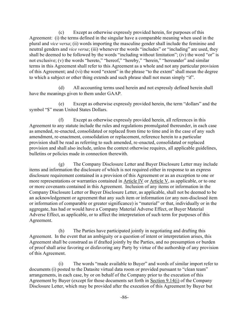 -86- (c) Except as otherwise expressly provided herein, for purposes of this Agreement: (i) the terms defined in the singular have a comparable meaning when used in the plural and vice versa; (ii) words importing the masculine gender shall include the feminine and neutral genders and vice versa; (iii) whenever the words “includes” or “including” are used, they shall be deemed to be followed by the words “including without limitation”; (iv) the word “or” is not exclusive; (v) the words “hereto,” “hereof,” “hereby,” “herein,” “hereunder” and similar terms in this Agreement shall refer to this Agreement as a whole and not any particular provision of this Agreement; and (vi) the word “extent” in the phrase “to the extent” shall mean the degree to which a subject or other thing extends and such phrase shall not mean simply “if”. (d) All accounting terms used herein and not expressly defined herein shall have the meanings given to them under GAAP. (e) Except as otherwise expressly provided herein, the term “dollars” and the symbol “$” mean United States Dollars. (f) Except as otherwise expressly provided herein, all references in this Agreement to any statute include the rules and regulations promulgated thereunder, in each case as amended, re-enacted, consolidated or replaced from time to time and in the case of any such amendment, re-enactment, consolidation or replacement, reference herein to a particular provision shall be read as referring to such amended, re-enacted, consolidated or replaced provision and shall also include, unless the context otherwise requires, all applicable guidelines, bulletins or policies made in connection therewith. (g) The Company Disclosure Letter and Buyer Disclosure Letter may include items and information the disclosure of which is not required either in response to an express disclosure requirement contained in a provision of this Agreement or as an exception to one or more representations or warranties contained in Article IV or Article V, as applicable, or to one or more covenants contained in this Agreement. Inclusion of any items or information in the Company Disclosure Letter or Buyer Disclosure Letter, as applicable, shall not be deemed to be an acknowledgement or agreement that any such item or information (or any non-disclosed item or information of comparable or greater significance) is “material” or that, individually or in the aggregate, has had or would have a Company Material Adverse Effect, or Buyer Material Adverse Effect, as applicable, or to affect the interpretation of such term for purposes of this Agreement. (h) The Parties have participated jointly in negotiating and drafting this Agreement. In the event that an ambiguity or a question of intent or interpretation arises, this Agreement shall be construed as if drafted jointly by the Parties, and no presumption or burden of proof shall arise favoring or disfavoring any Party by virtue of the authorship of any provision of this Agreement. (i) The words “made available to Buyer” and words of similar import refer to documents (i) posted to the Datasite virtual data room or provided pursuant to “clean team” arrangements, in each case, by or on behalf of the Company prior to the execution of this Agreement by Buyer (except for those documents set forth in Section 9.14(i) of the Company Disclosure Letter, which may be provided after the execution of this Agreement by Buyer but