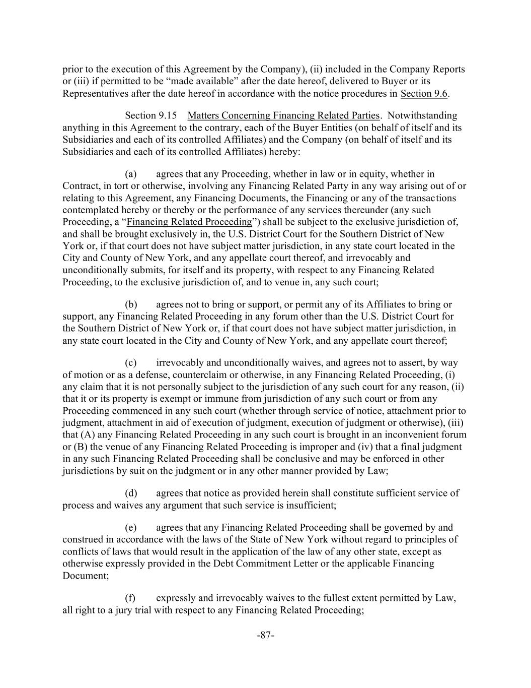 -87- prior to the execution of this Agreement by the Company), (ii) included in the Company Reports or (iii) if permitted to be “made available” after the date hereof, delivered to Buyer or its Representatives after the date hereof in accordance with the notice procedures in Section 9.6. Section 9.15 Matters Concerning Financing Related Parties. Notwithstanding anything in this Agreement to the contrary, each of the Buyer Entities (on behalf of itself and its Subsidiaries and each of its controlled Affiliates) and the Company (on behalf of itself and its Subsidiaries and each of its controlled Affiliates) hereby: (a) agrees that any Proceeding, whether in law or in equity, whether in Contract, in tort or otherwise, involving any Financing Related Party in any way arising out of or relating to this Agreement, any Financing Documents, the Financing or any of the transactions contemplated hereby or thereby or the performance of any services thereunder (any such Proceeding, a “Financing Related Proceeding”) shall be subject to the exclusive jurisdiction of, and shall be brought exclusively in, the U.S. District Court for the Southern District of New York or, if that court does not have subject matter jurisdiction, in any state court located in the City and County of New York, and any appellate court thereof, and irrevocably and unconditionally submits, for itself and its property, with respect to any Financing Related Proceeding, to the exclusive jurisdiction of, and to venue in, any such court; (b) agrees not to bring or support, or permit any of its Affiliates to bring or support, any Financing Related Proceeding in any forum other than the U.S. District Court for the Southern District of New York or, if that court does not have subject matter jurisdiction, in any state court located in the City and County of New York, and any appellate court thereof; (c) irrevocably and unconditionally waives, and agrees not to assert, by way of motion or as a defense, counterclaim or otherwise, in any Financing Related Proceeding, (i) any claim that it is not personally subject to the jurisdiction of any such court for any reason, (ii) that it or its property is exempt or immune from jurisdiction of any such court or from any Proceeding commenced in any such court (whether through service of notice, attachment prior to judgment, attachment in aid of execution of judgment, execution of judgment or otherwise), (iii) that (A) any Financing Related Proceeding in any such court is brought in an inconvenient forum or (B) the venue of any Financing Related Proceeding is improper and (iv) that a final judgment in any such Financing Related Proceeding shall be conclusive and may be enforced in other jurisdictions by suit on the judgment or in any other manner provided by Law; (d) agrees that notice as provided herein shall constitute sufficient service of process and waives any argument that such service is insufficient; (e) agrees that any Financing Related Proceeding shall be governed by and construed in accordance with the laws of the State of New York without regard to principles of conflicts of laws that would result in the application of the law of any other state, except as otherwise expressly provided in the Debt Commitment Letter or the applicable Financing Document; (f) expressly and irrevocably waives to the fullest extent permitted by Law, all right to a jury trial with respect to any Financing Related Proceeding;
