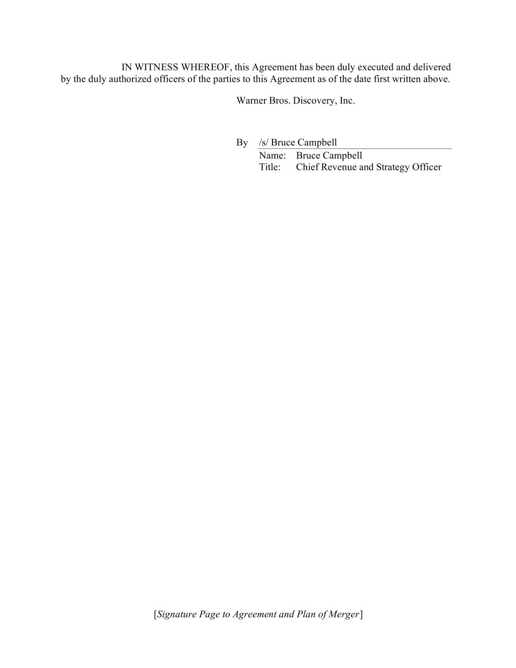 [Signature Page to Agreement and Plan of Merger] IN WITNESS WHEREOF, this Agreement has been duly executed and delivered by the duly authorized officers of the parties to this Agreement as of the date first written above. Warner Bros. Discovery, Inc. By /s/ Bruce Campbell Name: Bruce Campbell Title: Chief Revenue and Strategy Officer