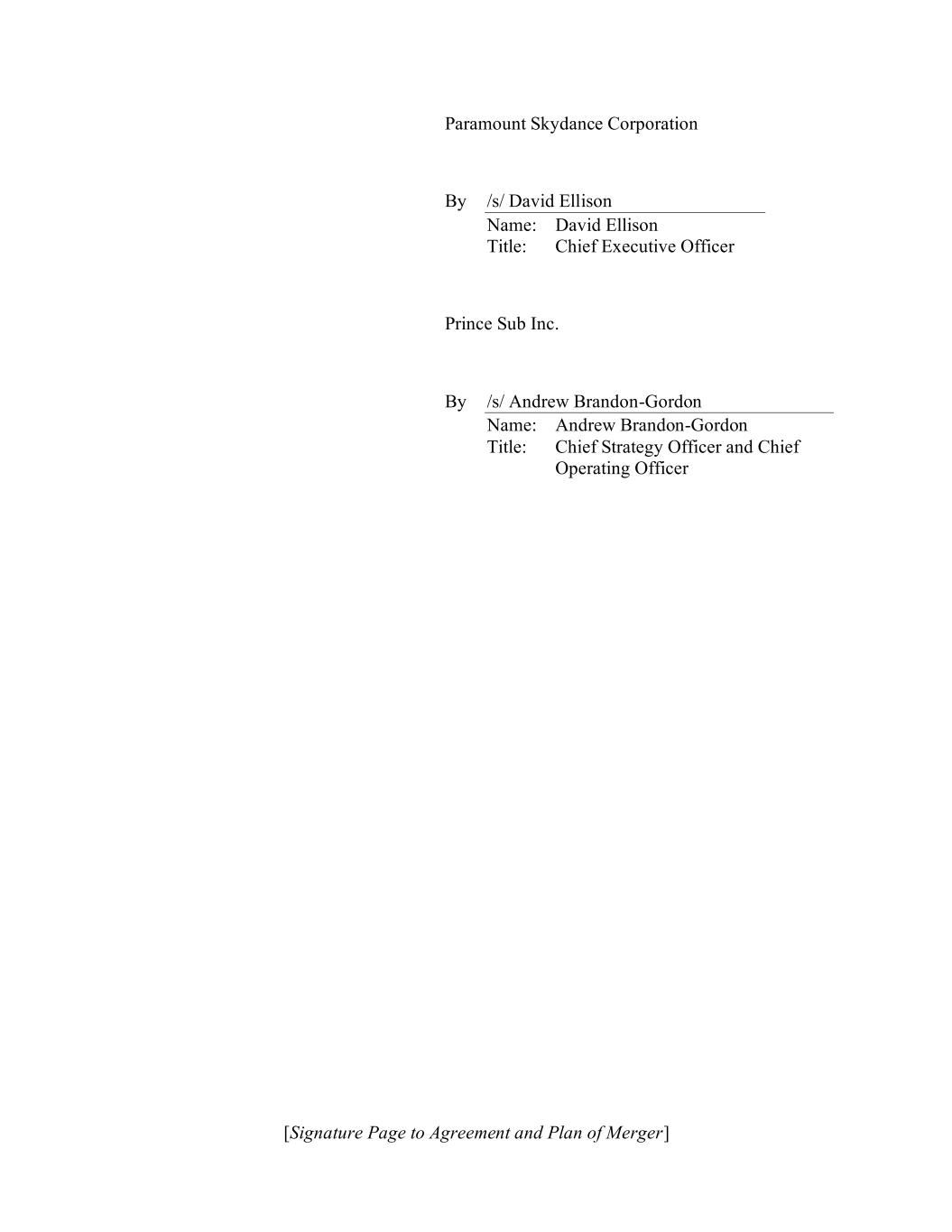 [Signature Page to Agreement and Plan of Merger] Paramount Skydance Corporation By /s/ David Ellison Name: David Ellison Title: Chief Executive Officer Prince Sub Inc. By /s/ Andrew Brandon-Gordon Name: Andrew Brandon-Gordon Title: Chief Strategy Officer and Chief Operating Officer