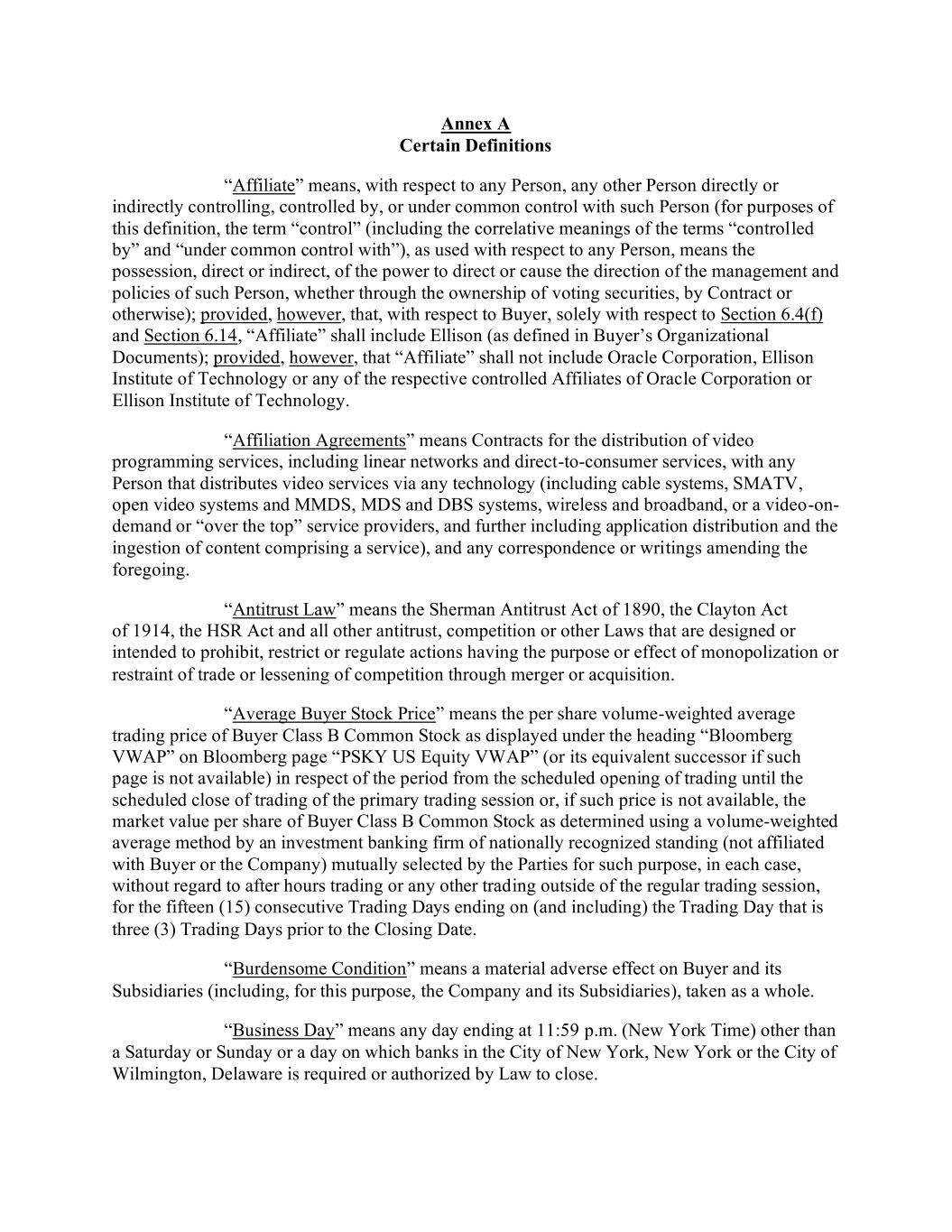Annex A Certain Definitions “Affiliate” means, with respect to any Person, any other Person directly or indirectly controlling, controlled by, or under common control with such Person (for purposes of this definition, the term “control” (including the correlative meanings of the terms “controlled by” and “under common control with”), as used with respect to any Person, means the possession, direct or indirect, of the power to direct or cause the direction of the management and policies of such Person, whether through the ownership of voting securities, by Contract or otherwise); provided, however, that, with respect to Buyer, solely with respect to Section 6.4(f) and Section 6.14, “Affiliate” shall include Ellison (as defined in Buyer’s Organizational Documents); provided, however, that “Affiliate” shall not include Oracle Corporation, Ellison Institute of Technology or any of the respective controlled Affiliates of Oracle Corporation or Ellison Institute of Technology. “Affiliation Agreements” means Contracts for the distribution of video programming services, including linear networks and direct-to-consumer services, with any Person that distributes video services via any technology (including cable systems, SMATV, open video systems and MMDS, MDS and DBS systems, wireless and broadband, or a video-on- demand or “over the top” service providers, and further including application distribution and the ingestion of content comprising a service), and any correspondence or writings amending the foregoing. “Antitrust Law” means the Sherman Antitrust Act of 1890, the Clayton Act of 1914, the HSR Act and all other antitrust, competition or other Laws that are designed or intended to prohibit, restrict or regulate actions having the purpose or effect of monopolization or restraint of trade or lessening of competition through merger or acquisition. “Average Buyer Stock Price” means the per share volume-weighted average trading price of Buyer Class B Common Stock as displayed under the heading “Bloomberg VWAP” on Bloomberg page “PSKY US Equity VWAP” (or its equivalent successor if such page is not available) in respect of the period from the scheduled opening of trading until the scheduled close of trading of the primary trading session or, if such price is not available, the market value per share of Buyer Class B Common Stock as determined using a volume-weighted average method by an investment banking firm of nationally recognized standing (not affiliated with Buyer or the Company) mutually selected by the Parties for such purpose, in each case, without regard to after hours trading or any other trading outside of the regular trading session, for the fifteen (15) consecutive Trading Days ending on (and including) the Trading Day that is three (3) Trading Days prior to the Closing Date. “Burdensome Condition” means a material adverse effect on Buyer and its Subsidiaries (including, for this purpose, the Company and its Subsidiaries), taken as a whole. “Business Day” means any day ending at 11:59 p.m. (New York Time) other than a Saturday or Sunday or a day on which banks in the City of New York, New York or the City of Wilmington, Delaware is required or authorized by Law to close.