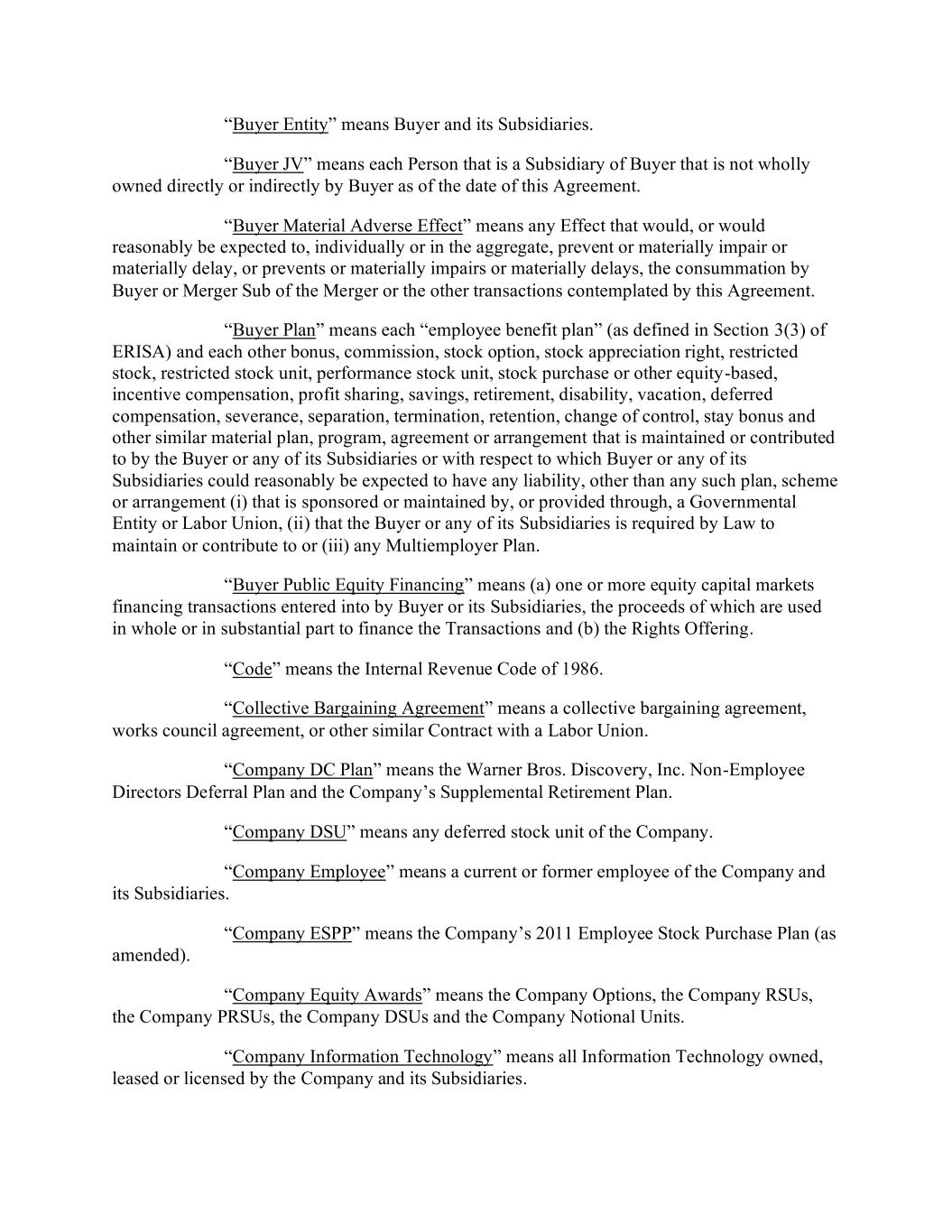 “Buyer Entity” means Buyer and its Subsidiaries. “Buyer JV” means each Person that is a Subsidiary of Buyer that is not wholly owned directly or indirectly by Buyer as of the date of this Agreement. “Buyer Material Adverse Effect” means any Effect that would, or would reasonably be expected to, individually or in the aggregate, prevent or materially impair or materially delay, or prevents or materially impairs or materially delays, the consummation by Buyer or Merger Sub of the Merger or the other transactions contemplated by this Agreement. “Buyer Plan” means each “employee benefit plan” (as defined in Section 3(3) of ERISA) and each other bonus, commission, stock option, stock appreciation right, restricted stock, restricted stock unit, performance stock unit, stock purchase or other equity-based, incentive compensation, profit sharing, savings, retirement, disability, vacation, deferred compensation, severance, separation, termination, retention, change of control, stay bonus and other similar material plan, program, agreement or arrangement that is maintained or contributed to by the Buyer or any of its Subsidiaries or with respect to which Buyer or any of its Subsidiaries could reasonably be expected to have any liability, other than any such plan, scheme or arrangement (i) that is sponsored or maintained by, or provided through, a Governmental Entity or Labor Union, (ii) that the Buyer or any of its Subsidiaries is required by Law to maintain or contribute to or (iii) any Multiemployer Plan. “Buyer Public Equity Financing” means (a) one or more equity capital markets financing transactions entered into by Buyer or its Subsidiaries, the proceeds of which are used in whole or in substantial part to finance the Transactions and (b) the Rights Offering. “Code” means the Internal Revenue Code of 1986. “Collective Bargaining Agreement” means a collective bargaining agreement, works council agreement, or other similar Contract with a Labor Union. “Company DC Plan” means the Warner Bros. Discovery, Inc. Non-Employee Directors Deferral Plan and the Company’s Supplemental Retirement Plan. “Company DSU” means any deferred stock unit of the Company. “Company Employee” means a current or former employee of the Company and its Subsidiaries. “Company ESPP” means the Company’s 2011 Employee Stock Purchase Plan (as amended). “Company Equity Awards” means the Company Options, the Company RSUs, the Company PRSUs, the Company DSUs and the Company Notional Units. “Company Information Technology” means all Information Technology owned, leased or licensed by the Company and its Subsidiaries.