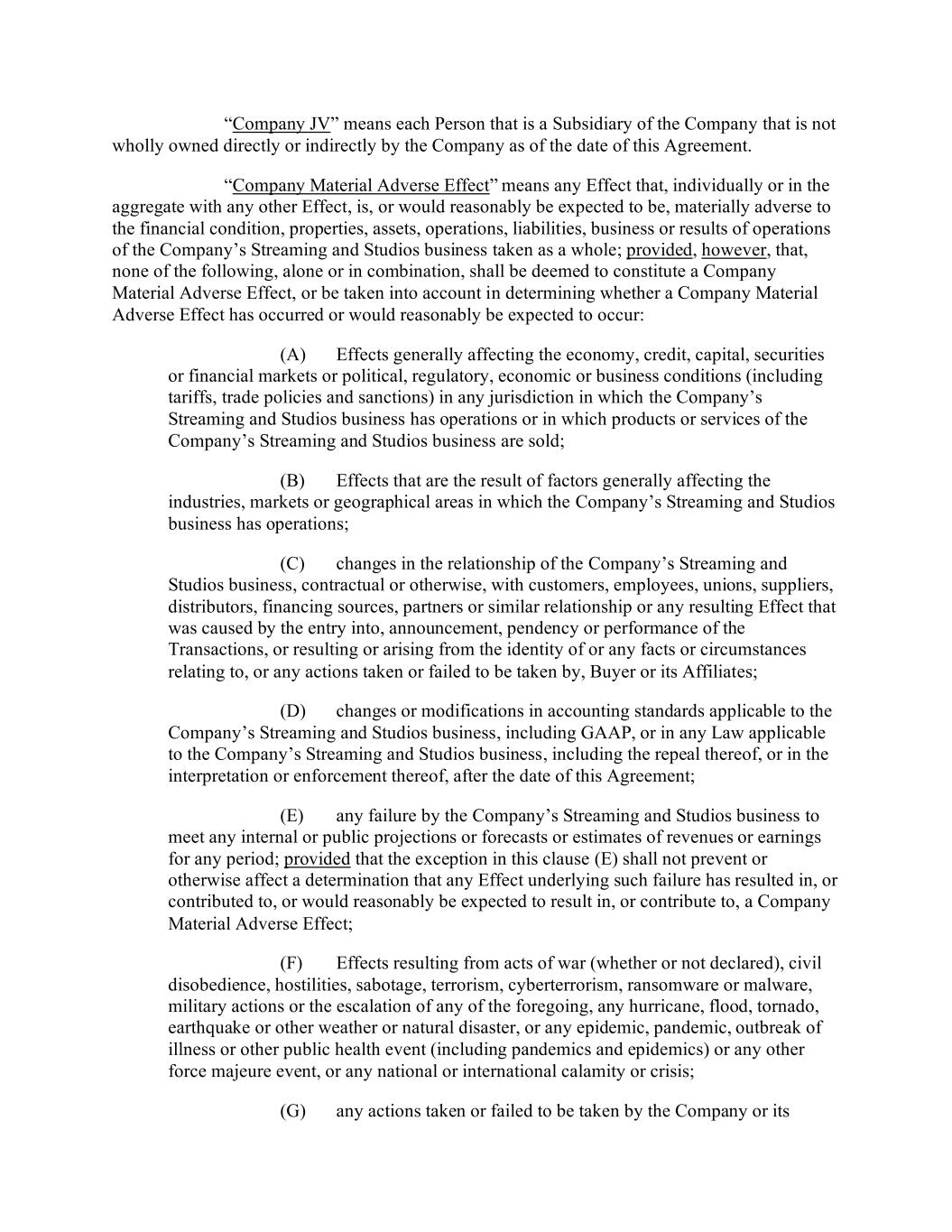 “Company JV” means each Person that is a Subsidiary of the Company that is not wholly owned directly or indirectly by the Company as of the date of this Agreement. “Company Material Adverse Effect” means any Effect that, individually or in the aggregate with any other Effect, is, or would reasonably be expected to be, materially adverse to the financial condition, properties, assets, operations, liabilities, business or results of operations of the Company’s Streaming and Studios business taken as a whole; provided, however, that, none of the following, alone or in combination, shall be deemed to constitute a Company Material Adverse Effect, or be taken into account in determining whether a Company Material Adverse Effect has occurred or would reasonably be expected to occur: (A) Effects generally affecting the economy, credit, capital, securities or financial markets or political, regulatory, economic or business conditions (including tariffs, trade policies and sanctions) in any jurisdiction in which the Company’s Streaming and Studios business has operations or in which products or services of the Company’s Streaming and Studios business are sold; (B) Effects that are the result of factors generally affecting the industries, markets or geographical areas in which the Company’s Streaming and Studios business has operations; (C) changes in the relationship of the Company’s Streaming and Studios business, contractual or otherwise, with customers, employees, unions, suppliers, distributors, financing sources, partners or similar relationship or any resulting Effect that was caused by the entry into, announcement, pendency or performance of the Transactions, or resulting or arising from the identity of or any facts or circumstances relating to, or any actions taken or failed to be taken by, Buyer or its Affiliates; (D) changes or modifications in accounting standards applicable to the Company’s Streaming and Studios business, including GAAP, or in any Law applicable to the Company’s Streaming and Studios business, including the repeal thereof, or in the interpretation or enforcement thereof, after the date of this Agreement; (E) any failure by the Company’s Streaming and Studios business to meet any internal or public projections or forecasts or estimates of revenues or earnings for any period; provided that the exception in this clause (E) shall not prevent or otherwise affect a determination that any Effect underlying such failure has resulted in, or contributed to, or would reasonably be expected to result in, or contribute to, a Company Material Adverse Effect; (F) Effects resulting from acts of war (whether or not declared), civil disobedience, hostilities, sabotage, terrorism, cyberterrorism, ransomware or malware, military actions or the escalation of any of the foregoing, any hurricane, flood, tornado, earthquake or other weather or natural disaster, or any epidemic, pandemic, outbreak of illness or other public health event (including pandemics and epidemics) or any other force majeure event, or any national or international calamity or crisis; (G) any actions taken or failed to be taken by the Company or its