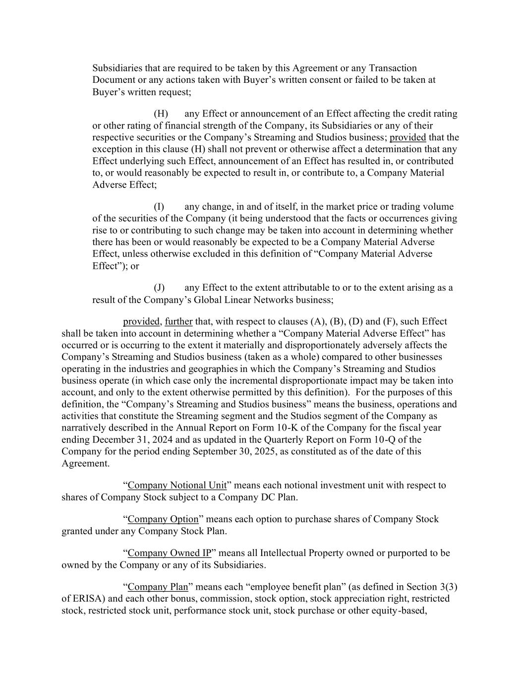 Subsidiaries that are required to be taken by this Agreement or any Transaction Document or any actions taken with Buyer’s written consent or failed to be taken at Buyer’s written request; (H) any Effect or announcement of an Effect affecting the credit rating or other rating of financial strength of the Company, its Subsidiaries or any of their respective securities or the Company’s Streaming and Studios business; provided that the exception in this clause (H) shall not prevent or otherwise affect a determination that any Effect underlying such Effect, announcement of an Effect has resulted in, or contributed to, or would reasonably be expected to result in, or contribute to, a Company Material Adverse Effect; (I) any change, in and of itself, in the market price or trading volume of the securities of the Company (it being understood that the facts or occurrences giving rise to or contributing to such change may be taken into account in determining whether there has been or would reasonably be expected to be a Company Material Adverse Effect, unless otherwise excluded in this definition of “Company Material Adverse Effect”); or (J) any Effect to the extent attributable to or to the extent arising as a result of the Company’s Global Linear Networks business; provided, further that, with respect to clauses (A), (B), (D) and (F), such Effect shall be taken into account in determining whether a “Company Material Adverse Effect” has occurred or is occurring to the extent it materially and disproportionately adversely affects the Company’s Streaming and Studios business (taken as a whole) compared to other businesses operating in the industries and geographies in which the Company’s Streaming and Studios business operate (in which case only the incremental disproportionate impact may be taken into account, and only to the extent otherwise permitted by this definition). For the purposes of this definition, the “Company’s Streaming and Studios business” means the business, operations and activities that constitute the Streaming segment and the Studios segment of the Company as narratively described in the Annual Report on Form 10-K of the Company for the fiscal year ending December 31, 2024 and as updated in the Quarterly Report on Form 10-Q of the Company for the period ending September 30, 2025, as constituted as of the date of this Agreement. “Company Notional Unit” means each notional investment unit with respect to shares of Company Stock subject to a Company DC Plan. “Company Option” means each option to purchase shares of Company Stock granted under any Company Stock Plan. “Company Owned IP” means all Intellectual Property owned or purported to be owned by the Company or any of its Subsidiaries. “Company Plan” means each “employee benefit plan” (as defined in Section 3(3) of ERISA) and each other bonus, commission, stock option, stock appreciation right, restricted stock, restricted stock unit, performance stock unit, stock purchase or other equity-based,