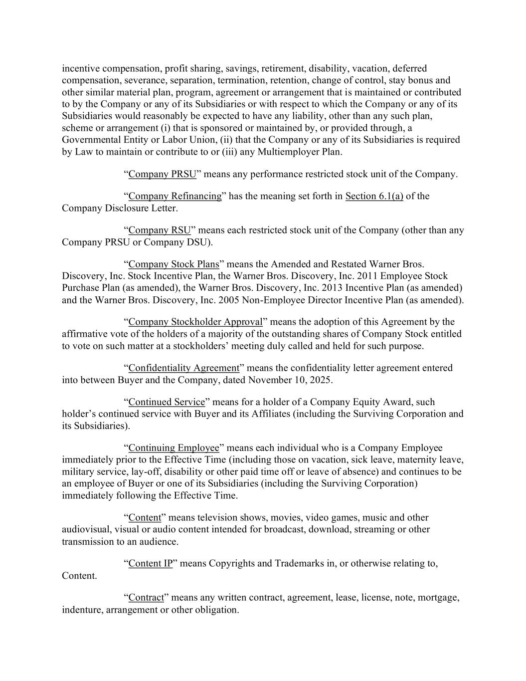 incentive compensation, profit sharing, savings, retirement, disability, vacation, deferred compensation, severance, separation, termination, retention, change of control, stay bonus and other similar material plan, program, agreement or arrangement that is maintained or contributed to by the Company or any of its Subsidiaries or with respect to which the Company or any of its Subsidiaries would reasonably be expected to have any liability, other than any such plan, scheme or arrangement (i) that is sponsored or maintained by, or provided through, a Governmental Entity or Labor Union, (ii) that the Company or any of its Subsidiaries is required by Law to maintain or contribute to or (iii) any Multiemployer Plan. “Company PRSU” means any performance restricted stock unit of the Company. “Company Refinancing” has the meaning set forth in Section 6.1(a) of the Company Disclosure Letter. “Company RSU” means each restricted stock unit of the Company (other than any Company PRSU or Company DSU). “Company Stock Plans” means the Amended and Restated Warner Bros. Discovery, Inc. Stock Incentive Plan, the Warner Bros. Discovery, Inc. 2011 Employee Stock Purchase Plan (as amended), the Warner Bros. Discovery, Inc. 2013 Incentive Plan (as amended) and the Warner Bros. Discovery, Inc. 2005 Non-Employee Director Incentive Plan (as amended). “Company Stockholder Approval” means the adoption of this Agreement by the affirmative vote of the holders of a majority of the outstanding shares of Company Stock entitled to vote on such matter at a stockholders’ meeting duly called and held for such purpose. “Confidentiality Agreement” means the confidentiality letter agreement entered into between Buyer and the Company, dated November 10, 2025. “Continued Service” means for a holder of a Company Equity Award, such holder’s continued service with Buyer and its Affiliates (including the Surviving Corporation and its Subsidiaries). “Continuing Employee” means each individual who is a Company Employee immediately prior to the Effective Time (including those on vacation, sick leave, maternity leave, military service, lay-off, disability or other paid time off or leave of absence) and continues to be an employee of Buyer or one of its Subsidiaries (including the Surviving Corporation) immediately following the Effective Time. “Content” means television shows, movies, video games, music and other audiovisual, visual or audio content intended for broadcast, download, streaming or other transmission to an audience. “Content IP” means Copyrights and Trademarks in, or otherwise relating to, Content. “Contract” means any written contract, agreement, lease, license, note, mortgage, indenture, arrangement or other obligation.