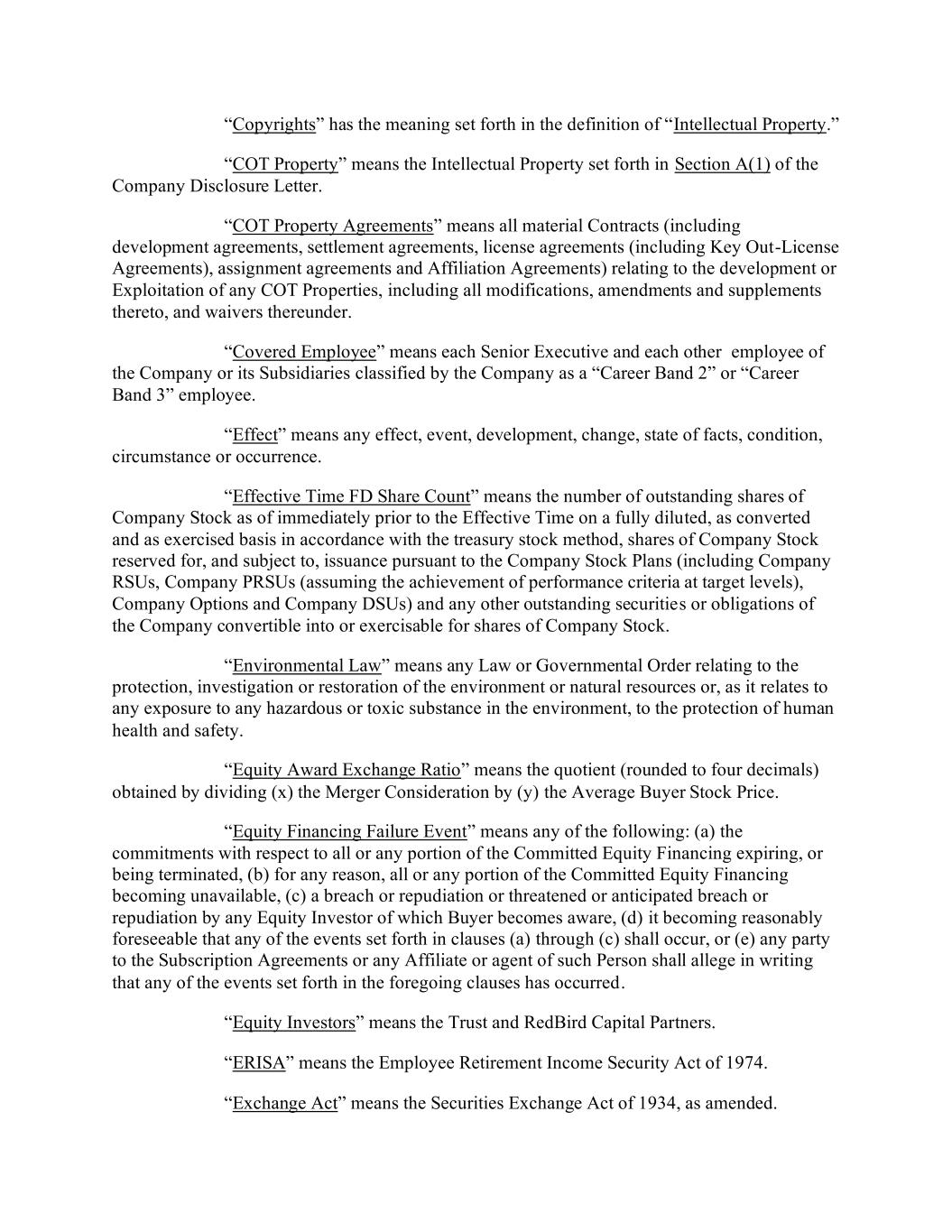 “Copyrights” has the meaning set forth in the definition of “Intellectual Property.” “COT Property” means the Intellectual Property set forth in Section A(1) of the Company Disclosure Letter. “COT Property Agreements” means all material Contracts (including development agreements, settlement agreements, license agreements (including Key Out-License Agreements), assignment agreements and Affiliation Agreements) relating to the development or Exploitation of any COT Properties, including all modifications, amendments and supplements thereto, and waivers thereunder. “Covered Employee” means each Senior Executive and each other employee of the Company or its Subsidiaries classified by the Company as a “Career Band 2” or “Career Band 3” employee. “Effect” means any effect, event, development, change, state of facts, condition, circumstance or occurrence. “Effective Time FD Share Count” means the number of outstanding shares of Company Stock as of immediately prior to the Effective Time on a fully diluted, as converted and as exercised basis in accordance with the treasury stock method, shares of Company Stock reserved for, and subject to, issuance pursuant to the Company Stock Plans (including Company RSUs, Company PRSUs (assuming the achievement of performance criteria at target levels), Company Options and Company DSUs) and any other outstanding securities or obligations of the Company convertible into or exercisable for shares of Company Stock. “Environmental Law” means any Law or Governmental Order relating to the protection, investigation or restoration of the environment or natural resources or, as it relates to any exposure to any hazardous or toxic substance in the environment, to the protection of human health and safety. “Equity Award Exchange Ratio” means the quotient (rounded to four decimals) obtained by dividing (x) the Merger Consideration by (y) the Average Buyer Stock Price. “Equity Financing Failure Event” means any of the following: (a) the commitments with respect to all or any portion of the Committed Equity Financing expiring, or being terminated, (b) for any reason, all or any portion of the Committed Equity Financing becoming unavailable, (c) a breach or repudiation or threatened or anticipated breach or repudiation by any Equity Investor of which Buyer becomes aware, (d) it becoming reasonably foreseeable that any of the events set forth in clauses (a) through (c) shall occur, or (e) any party to the Subscription Agreements or any Affiliate or agent of such Person shall allege in writing that any of the events set forth in the foregoing clauses has occurred. “Equity Investors” means the Trust and RedBird Capital Partners. “ERISA” means the Employee Retirement Income Security Act of 1974. “Exchange Act” means the Securities Exchange Act of 1934, as amended.