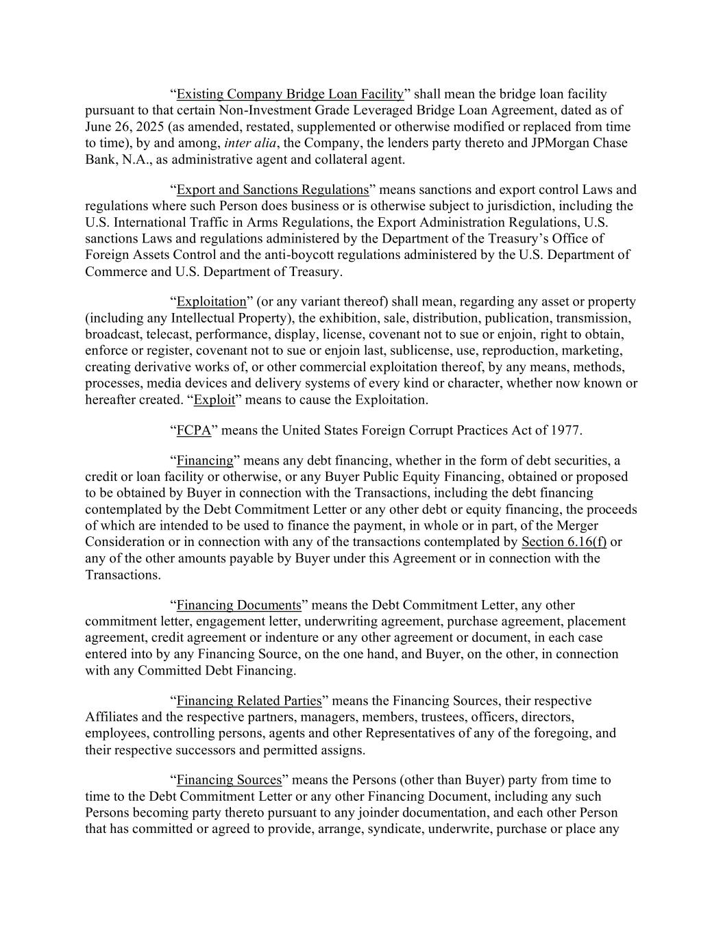 “Existing Company Bridge Loan Facility” shall mean the bridge loan facility pursuant to that certain Non-Investment Grade Leveraged Bridge Loan Agreement, dated as of June 26, 2025 (as amended, restated, supplemented or otherwise modified or replaced from time to time), by and among, inter alia, the Company, the lenders party thereto and JPMorgan Chase Bank, N.A., as administrative agent and collateral agent. “Export and Sanctions Regulations” means sanctions and export control Laws and regulations where such Person does business or is otherwise subject to jurisdiction, including the U.S. International Traffic in Arms Regulations, the Export Administration Regulations, U.S. sanctions Laws and regulations administered by the Department of the Treasury’s Office of Foreign Assets Control and the anti-boycott regulations administered by the U.S. Department of Commerce and U.S. Department of Treasury. “Exploitation” (or any variant thereof) shall mean, regarding any asset or property (including any Intellectual Property), the exhibition, sale, distribution, publication, transmission, broadcast, telecast, performance, display, license, covenant not to sue or enjoin, right to obtain, enforce or register, covenant not to sue or enjoin last, sublicense, use, reproduction, marketing, creating derivative works of, or other commercial exploitation thereof, by any means, methods, processes, media devices and delivery systems of every kind or character, whether now known or hereafter created. “Exploit” means to cause the Exploitation. “FCPA” means the United States Foreign Corrupt Practices Act of 1977. “Financing” means any debt financing, whether in the form of debt securities, a credit or loan facility or otherwise, or any Buyer Public Equity Financing, obtained or proposed to be obtained by Buyer in connection with the Transactions, including the debt financing contemplated by the Debt Commitment Letter or any other debt or equity financing, the proceeds of which are intended to be used to finance the payment, in whole or in part, of the Merger Consideration or in connection with any of the transactions contemplated by Section 6.16(f) or any of the other amounts payable by Buyer under this Agreement or in connection with the Transactions. “Financing Documents” means the Debt Commitment Letter, any other commitment letter, engagement letter, underwriting agreement, purchase agreement, placement agreement, credit agreement or indenture or any other agreement or document, in each case entered into by any Financing Source, on the one hand, and Buyer, on the other, in connection with any Committed Debt Financing. “Financing Related Parties” means the Financing Sources, their respective Affiliates and the respective partners, managers, members, trustees, officers, directors, employees, controlling persons, agents and other Representatives of any of the foregoing, and their respective successors and permitted assigns.  “Financing Sources” means the Persons (other than Buyer) party from time to time to the Debt Commitment Letter or any other Financing Document, including any such Persons becoming party thereto pursuant to any joinder documentation, and each other Person that has committed or agreed to provide, arrange, syndicate, underwrite, purchase or place any