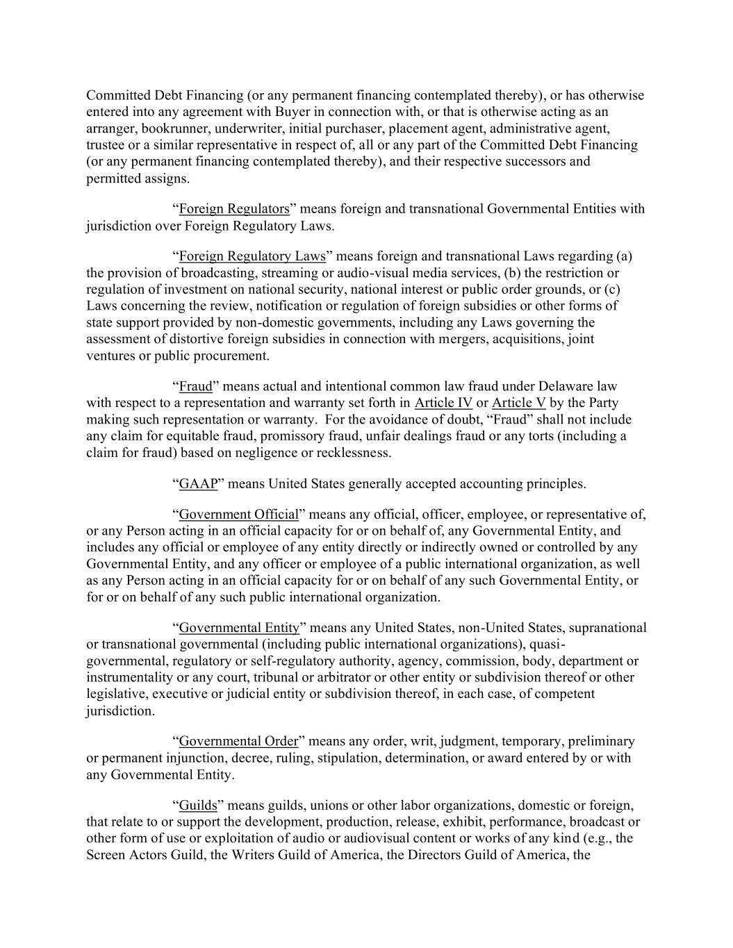 Committed Debt Financing (or any permanent financing contemplated thereby), or has otherwise entered into any agreement with Buyer in connection with, or that is otherwise acting as an arranger, bookrunner, underwriter, initial purchaser, placement agent, administrative agent, trustee or a similar representative in respect of, all or any part of the Committed Debt Financing (or any permanent financing contemplated thereby), and their respective successors and permitted assigns. “Foreign Regulators” means foreign and transnational Governmental Entities with jurisdiction over Foreign Regulatory Laws. “Foreign Regulatory Laws” means foreign and transnational Laws regarding (a) the provision of broadcasting, streaming or audio-visual media services, (b) the restriction or regulation of investment on national security, national interest or public order grounds, or (c) Laws concerning the review, notification or regulation of foreign subsidies or other forms of state support provided by non-domestic governments, including any Laws governing the assessment of distortive foreign subsidies in connection with mergers, acquisitions, joint ventures or public procurement. “Fraud” means actual and intentional common law fraud under Delaware law with respect to a representation and warranty set forth in Article IV or Article V by the Party making such representation or warranty. For the avoidance of doubt, “Fraud” shall not include any claim for equitable fraud, promissory fraud, unfair dealings fraud or any torts (including a claim for fraud) based on negligence or recklessness. “GAAP” means United States generally accepted accounting principles. “Government Official” means any official, officer, employee, or representative of, or any Person acting in an official capacity for or on behalf of, any Governmental Entity, and includes any official or employee of any entity directly or indirectly owned or controlled by any Governmental Entity, and any officer or employee of a public international organization, as well as any Person acting in an official capacity for or on behalf of any such Governmental Entity, or for or on behalf of any such public international organization. “Governmental Entity” means any United States, non-United States, supranational or transnational governmental (including public international organizations), quasi- governmental, regulatory or self-regulatory authority, agency, commission, body, department or instrumentality or any court, tribunal or arbitrator or other entity or subdivision thereof or other legislative, executive or judicial entity or subdivision thereof, in each case, of competent jurisdiction. “Governmental Order” means any order, writ, judgment, temporary, preliminary or permanent injunction, decree, ruling, stipulation, determination, or award entered by or with any Governmental Entity. “Guilds” means guilds, unions or other labor organizations, domestic or foreign, that relate to or support the development, production, release, exhibit, performance, broadcast or other form of use or exploitation of audio or audiovisual content or works of any kind (e.g., the Screen Actors Guild, the Writers Guild of America, the Directors Guild of America, the