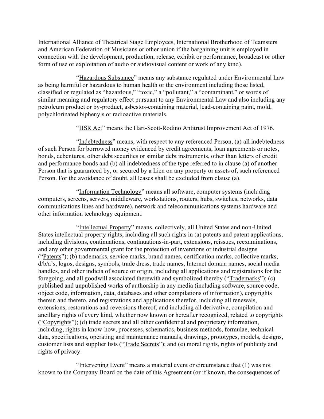 International Alliance of Theatrical Stage Employees, International Brotherhood of Teamsters and American Federation of Musicians or other union if the bargaining unit is employed in connection with the development, production, release, exhibit or performance, broadcast or other form of use or exploitation of audio or audiovisual content or work of any kind). “Hazardous Substance” means any substance regulated under Environmental Law as being harmful or hazardous to human health or the environment including those listed, classified or regulated as “hazardous,” “toxic,” a “pollutant,” a “contaminant,” or words of similar meaning and regulatory effect pursuant to any Environmental Law and also including any petroleum product or by-product, asbestos-containing material, lead-containing paint, mold, polychlorinated biphenyls or radioactive materials. “HSR Act” means the Hart-Scott-Rodino Antitrust Improvement Act of 1976. “Indebtedness” means, with respect to any referenced Person, (a) all indebtedness of such Person for borrowed money evidenced by credit agreements, loan agreements or notes, bonds, debentures, other debt securities or similar debt instruments, other than letters of credit and performance bonds and (b) all indebtedness of the type referred to in clause (a) of another Person that is guaranteed by, or secured by a Lien on any property or assets of, such referenced Person. For the avoidance of doubt, all leases shall be excluded from clause (a). “Information Technology” means all software, computer systems (including computers, screens, servers, middleware, workstations, routers, hubs, switches, networks, data communications lines and hardware), network and telecommunications systems hardware and other information technology equipment. “Intellectual Property” means, collectively, all United States and non-United States intellectual property rights, including all such rights in (a) patents and patent applications, including divisions, continuations, continuations-in-part, extensions, reissues, reexaminations, and any other governmental grant for the protection of inventions or industrial designs (“Patents”); (b) trademarks, service marks, brand names, certification marks, collective marks, d/b/a’s, logos, designs, symbols, trade dress, trade names, Internet domain names, social media handles, and other indicia of source or origin, including all applications and registrations for the foregoing, and all goodwill associated therewith and symbolized thereby (“Trademarks”); (c) published and unpublished works of authorship in any media (including software, source code, object code, information, data, databases and other compilations of information), copyrights therein and thereto, and registrations and applications therefor, including all renewals, extensions, restorations and reversions thereof, and including all derivative, compilation and ancillary rights of every kind, whether now known or hereafter recognized, related to copyrights (“Copyrights”); (d) trade secrets and all other confidential and proprietary information, including, rights in know-how, processes, schematics, business methods, formulae, technical data, specifications, operating and maintenance manuals, drawings, prototypes, models, designs, customer lists and supplier lists (“Trade Secrets”); and (e) moral rights, rights of publicity and rights of privacy. “Intervening Event” means a material event or circumstance that (1) was not known to the Company Board on the date of this Agreement (or if known, the consequences of