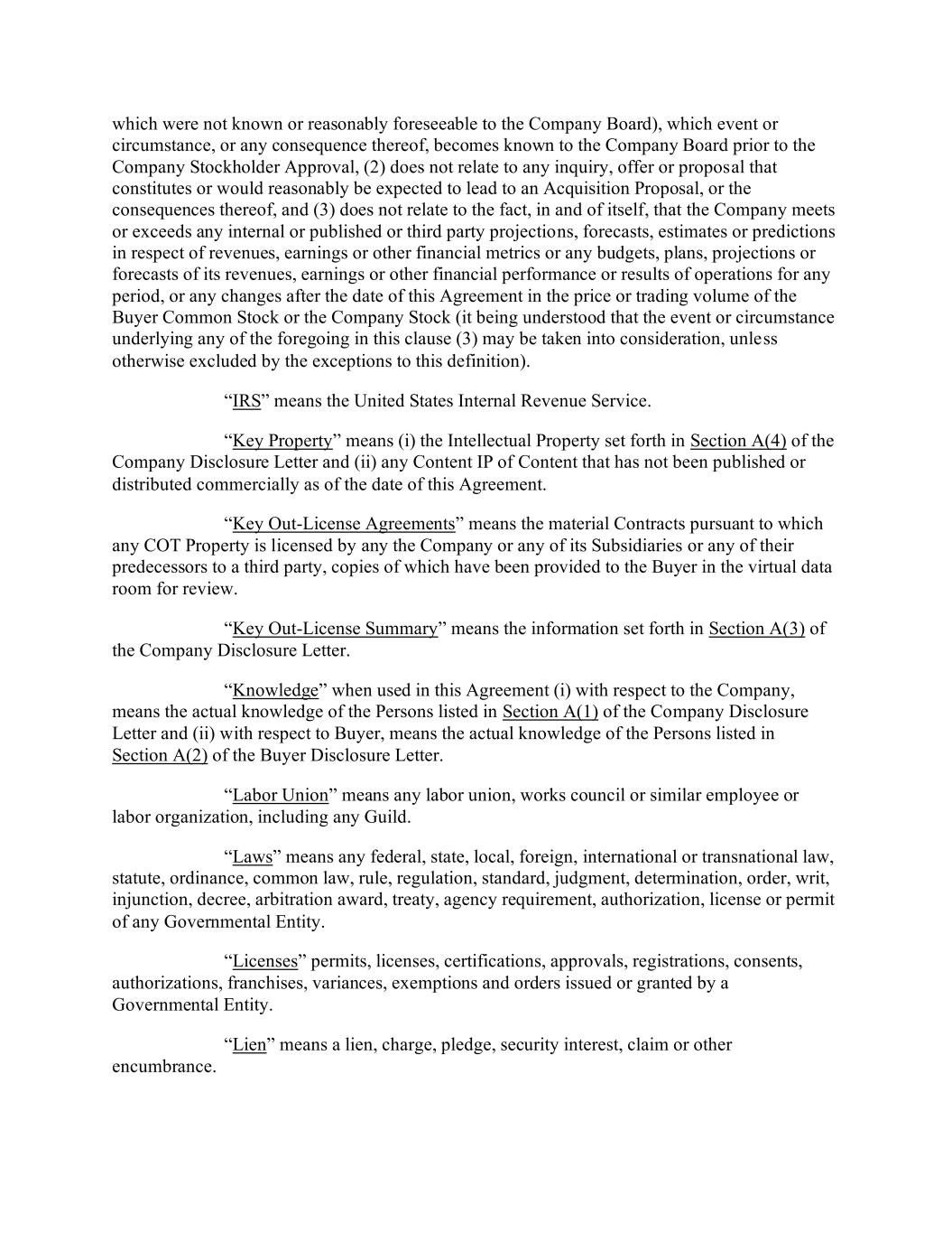 which were not known or reasonably foreseeable to the Company Board), which event or circumstance, or any consequence thereof, becomes known to the Company Board prior to the Company Stockholder Approval, (2) does not relate to any inquiry, offer or proposal that constitutes or would reasonably be expected to lead to an Acquisition Proposal, or the consequences thereof, and (3) does not relate to the fact, in and of itself, that the Company meets or exceeds any internal or published or third party projections, forecasts, estimates or predictions in respect of revenues, earnings or other financial metrics or any budgets, plans, projections or forecasts of its revenues, earnings or other financial performance or results of operations for any period, or any changes after the date of this Agreement in the price or trading volume of the Buyer Common Stock or the Company Stock (it being understood that the event or circumstance underlying any of the foregoing in this clause (3) may be taken into consideration, unless otherwise excluded by the exceptions to this definition). “IRS” means the United States Internal Revenue Service. “Key Property” means (i) the Intellectual Property set forth in Section A(4) of the Company Disclosure Letter and (ii) any Content IP of Content that has not been published or distributed commercially as of the date of this Agreement. “Key Out-License Agreements” means the material Contracts pursuant to which any COT Property is licensed by any the Company or any of its Subsidiaries or any of their predecessors to a third party, copies of which have been provided to the Buyer in the virtual data room for review. “Key Out-License Summary” means the information set forth in Section A(3) of the Company Disclosure Letter. “Knowledge” when used in this Agreement (i) with respect to the Company, means the actual knowledge of the Persons listed in Section A(1) of the Company Disclosure Letter and (ii) with respect to Buyer, means the actual knowledge of the Persons listed in Section A(2) of the Buyer Disclosure Letter. “Labor Union” means any labor union, works council or similar employee or labor organization, including any Guild. “Laws” means any federal, state, local, foreign, international or transnational law, statute, ordinance, common law, rule, regulation, standard, judgment, determination, order, writ, injunction, decree, arbitration award, treaty, agency requirement, authorization, license or permit of any Governmental Entity. “Licenses” permits, licenses, certifications, approvals, registrations, consents, authorizations, franchises, variances, exemptions and orders issued or granted by a Governmental Entity. “Lien” means a lien, charge, pledge, security interest, claim or other encumbrance.
