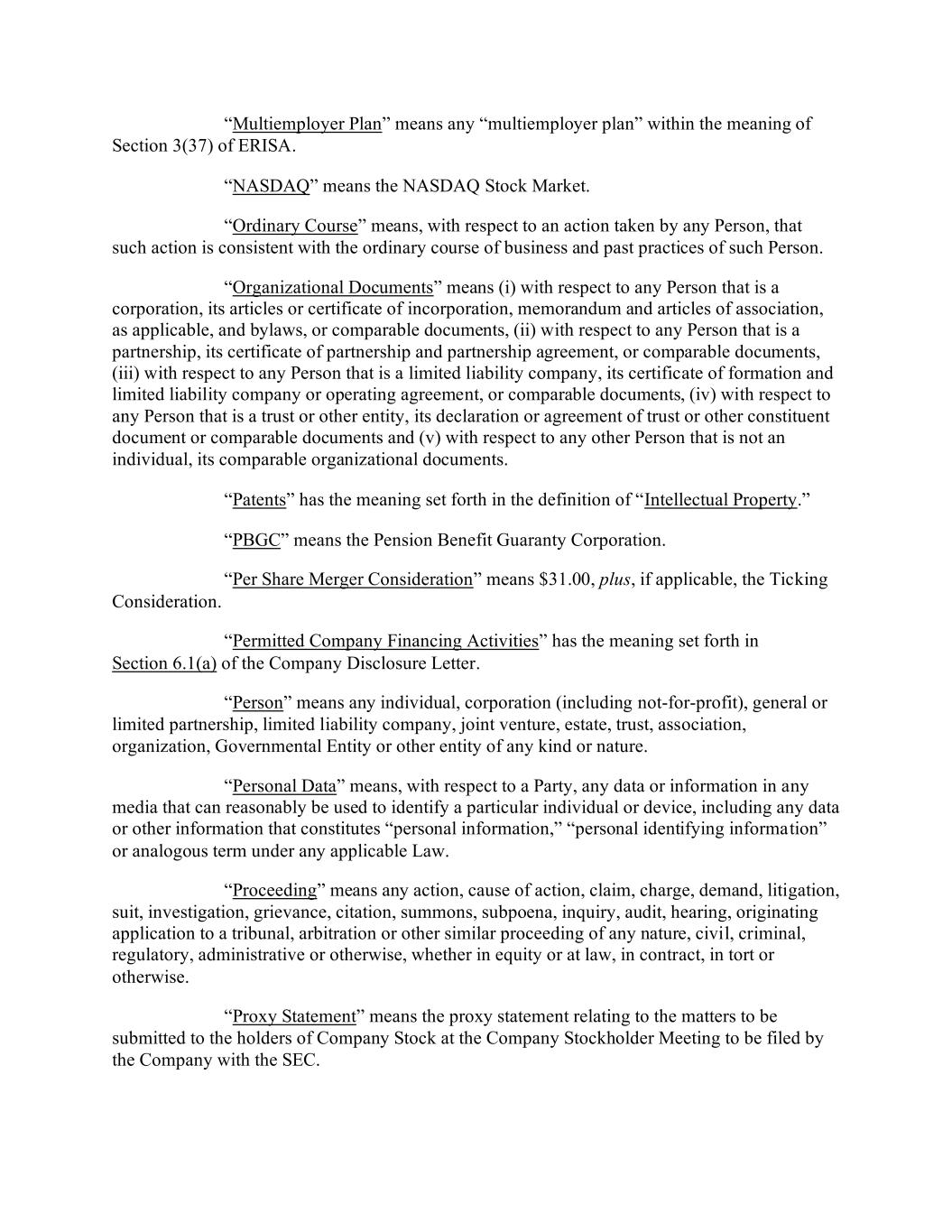 “Multiemployer Plan” means any “multiemployer plan” within the meaning of Section 3(37) of ERISA. “NASDAQ” means the NASDAQ Stock Market. “Ordinary Course” means, with respect to an action taken by any Person, that such action is consistent with the ordinary course of business and past practices of such Person. “Organizational Documents” means (i) with respect to any Person that is a corporation, its articles or certificate of incorporation, memorandum and articles of association, as applicable, and bylaws, or comparable documents, (ii) with respect to any Person that is a partnership, its certificate of partnership and partnership agreement, or comparable documents, (iii) with respect to any Person that is a limited liability company, its certificate of formation and limited liability company or operating agreement, or comparable documents, (iv) with respect to any Person that is a trust or other entity, its declaration or agreement of trust or other constituent document or comparable documents and (v) with respect to any other Person that is not an individual, its comparable organizational documents. “Patents” has the meaning set forth in the definition of “Intellectual Property.” “PBGC” means the Pension Benefit Guaranty Corporation. “Per Share Merger Consideration” means $31.00, plus, if applicable, the Ticking Consideration. “Permitted Company Financing Activities” has the meaning set forth in Section 6.1(a) of the Company Disclosure Letter. “Person” means any individual, corporation (including not-for-profit), general or limited partnership, limited liability company, joint venture, estate, trust, association, organization, Governmental Entity or other entity of any kind or nature. “Personal Data” means, with respect to a Party, any data or information in any media that can reasonably be used to identify a particular individual or device, including any data or other information that constitutes “personal information,” “personal identifying information” or analogous term under any applicable Law. “Proceeding” means any action, cause of action, claim, charge, demand, litigation, suit, investigation, grievance, citation, summons, subpoena, inquiry, audit, hearing, originating application to a tribunal, arbitration or other similar proceeding of any nature, civil, criminal, regulatory, administrative or otherwise, whether in equity or at law, in contract, in tort or otherwise. “Proxy Statement” means the proxy statement relating to the matters to be submitted to the holders of Company Stock at the Company Stockholder Meeting to be filed by the Company with the SEC.