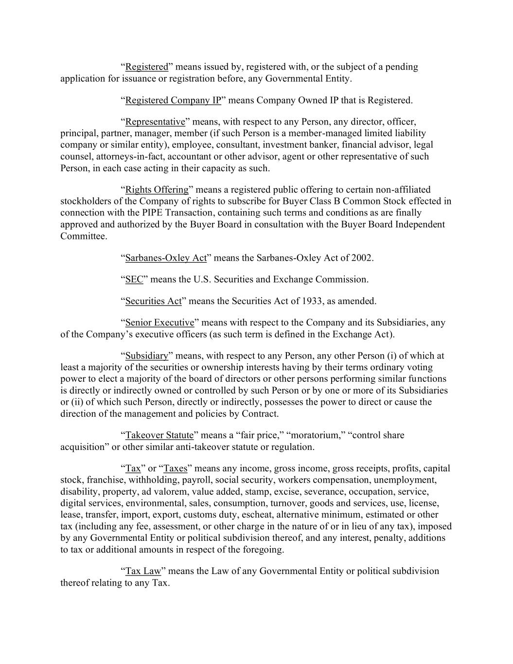 “Registered” means issued by, registered with, or the subject of a pending application for issuance or registration before, any Governmental Entity. “Registered Company IP” means Company Owned IP that is Registered. “Representative” means, with respect to any Person, any director, officer, principal, partner, manager, member (if such Person is a member-managed limited liability company or similar entity), employee, consultant, investment banker, financial advisor, legal counsel, attorneys-in-fact, accountant or other advisor, agent or other representative of such Person, in each case acting in their capacity as such. “Rights Offering” means a registered public offering to certain non-affiliated stockholders of the Company of rights to subscribe for Buyer Class B Common Stock effected in connection with the PIPE Transaction, containing such terms and conditions as are finally approved and authorized by the Buyer Board in consultation with the Buyer Board Independent Committee. “Sarbanes-Oxley Act” means the Sarbanes-Oxley Act of 2002. “SEC” means the U.S. Securities and Exchange Commission. “Securities Act” means the Securities Act of 1933, as amended. “Senior Executive” means with respect to the Company and its Subsidiaries, any of the Company’s executive officers (as such term is defined in the Exchange Act). “Subsidiary” means, with respect to any Person, any other Person (i) of which at least a majority of the securities or ownership interests having by their terms ordinary voting power to elect a majority of the board of directors or other persons performing similar functions is directly or indirectly owned or controlled by such Person or by one or more of its Subsidiaries or (ii) of which such Person, directly or indirectly, possesses the power to direct or cause the direction of the management and policies by Contract. “Takeover Statute” means a “fair price,” “moratorium,” “control share acquisition” or other similar anti-takeover statute or regulation. “Tax” or “Taxes” means any income, gross income, gross receipts, profits, capital stock, franchise, withholding, payroll, social security, workers compensation, unemployment, disability, property, ad valorem, value added, stamp, excise, severance, occupation, service, digital services, environmental, sales, consumption, turnover, goods and services, use, license, lease, transfer, import, export, customs duty, escheat, alternative minimum, estimated or other tax (including any fee, assessment, or other charge in the nature of or in lieu of any tax), imposed by any Governmental Entity or political subdivision thereof, and any interest, penalty, additions to tax or additional amounts in respect of the foregoing. “Tax Law” means the Law of any Governmental Entity or political subdivision thereof relating to any Tax.