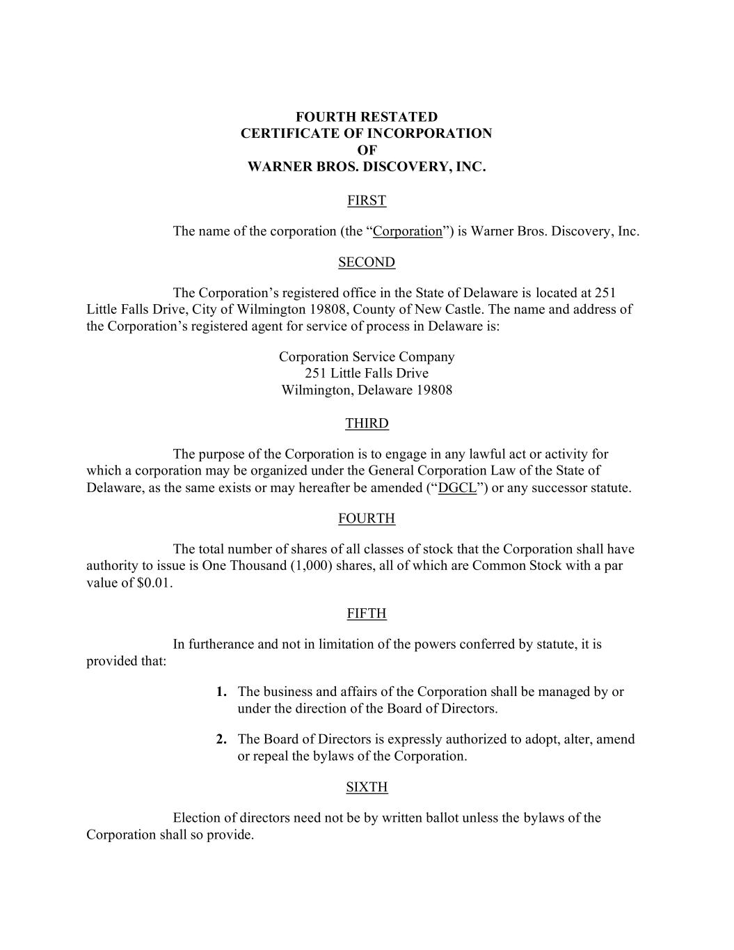 FOURTH RESTATED CERTIFICATE OF INCORPORATION OF WARNER BROS. DISCOVERY, INC. FIRST The name of the corporation (the “Corporation”) is Warner Bros. Discovery, Inc. SECOND The Corporation’s registered office in the State of Delaware is located at 251 Little Falls Drive, City of Wilmington 19808, County of New Castle. The name and address of the Corporation’s registered agent for service of process in Delaware is: Corporation Service Company 251 Little Falls Drive Wilmington, Delaware 19808 THIRD The purpose of the Corporation is to engage in any lawful act or activity for which a corporation may be organized under the General Corporation Law of the State of Delaware, as the same exists or may hereafter be amended (“DGCL”) or any successor statute. FOURTH The total number of shares of all classes of stock that the Corporation shall have authority to issue is One Thousand (1,000) shares, all of which are Common Stock with a par value of $0.01. FIFTH In furtherance and not in limitation of the powers conferred by statute, it is provided that: 1. The business and affairs of the Corporation shall be managed by or under the direction of the Board of Directors. 2. The Board of Directors is expressly authorized to adopt, alter, amend or repeal the bylaws of the Corporation. SIXTH Election of directors need not be by written ballot unless the bylaws of the Corporation shall so provide.