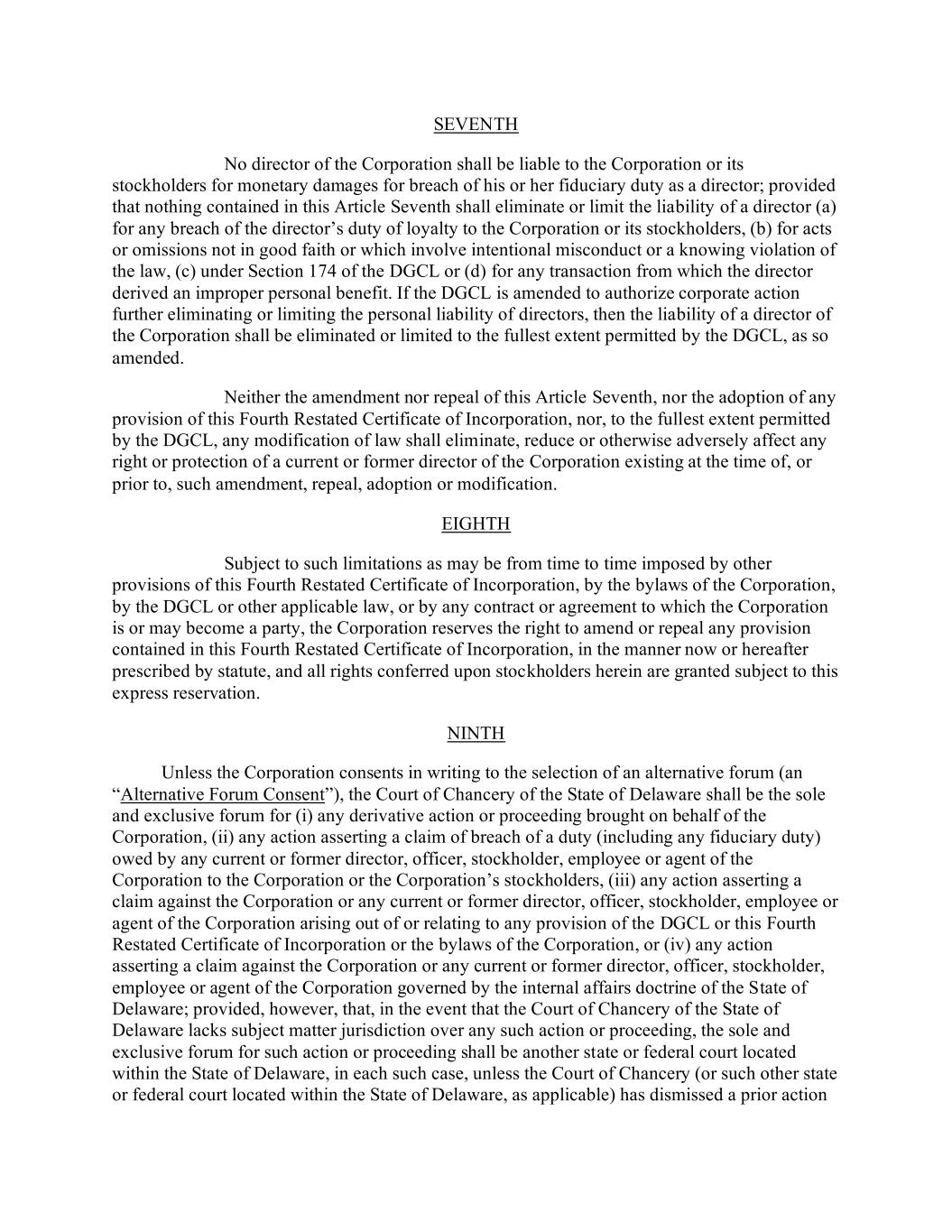 SEVENTH No director of the Corporation shall be liable to the Corporation or its stockholders for monetary damages for breach of his or her fiduciary duty as a director; provided that nothing contained in this Article Seventh shall eliminate or limit the liability of a director (a) for any breach of the director’s duty of loyalty to the Corporation or its stockholders, (b) for acts or omissions not in good faith or which involve intentional misconduct or a knowing violation of the law, (c) under Section 174 of the DGCL or (d) for any transaction from which the director derived an improper personal benefit. If the DGCL is amended to authorize corporate action further eliminating or limiting the personal liability of directors, then the liability of a director of the Corporation shall be eliminated or limited to the fullest extent permitted by the DGCL, as so amended. Neither the amendment nor repeal of this Article Seventh, nor the adoption of any provision of this Fourth Restated Certificate of Incorporation, nor, to the fullest extent permitted by the DGCL, any modification of law shall eliminate, reduce or otherwise adversely affect any right or protection of a current or former director of the Corporation existing at the time of, or prior to, such amendment, repeal, adoption or modification. EIGHTH Subject to such limitations as may be from time to time imposed by other provisions of this Fourth Restated Certificate of Incorporation, by the bylaws of the Corporation, by the DGCL or other applicable law, or by any contract or agreement to which the Corporation is or may become a party, the Corporation reserves the right to amend or repeal any provision contained in this Fourth Restated Certificate of Incorporation, in the manner now or hereafter prescribed by statute, and all rights conferred upon stockholders herein are granted subject to this express reservation. NINTH Unless the Corporation consents in writing to the selection of an alternative forum (an “Alternative Forum Consent”), the Court of Chancery of the State of Delaware shall be the sole and exclusive forum for (i) any derivative action or proceeding brought on behalf of the Corporation, (ii) any action asserting a claim of breach of a duty (including any fiduciary duty) owed by any current or former director, officer, stockholder, employee or agent of the Corporation to the Corporation or the Corporation’s stockholders, (iii) any action asserting a claim against the Corporation or any current or former director, officer, stockholder, employee or agent of the Corporation arising out of or relating to any provision of the DGCL or this Fourth Restated Certificate of Incorporation or the bylaws of the Corporation, or (iv) any action asserting a claim against the Corporation or any current or former director, officer, stockholder, employee or agent of the Corporation governed by the internal affairs doctrine of the State of Delaware; provided, however, that, in the event that the Court of Chancery of the State of Delaware lacks subject matter jurisdiction over any such action or proceeding, the sole and exclusive forum for such action or proceeding shall be another state or federal court located within the State of Delaware, in each such case, unless the Court of Chancery (or such other state or federal court located within the State of Delaware, as applicable) has dismissed a prior action