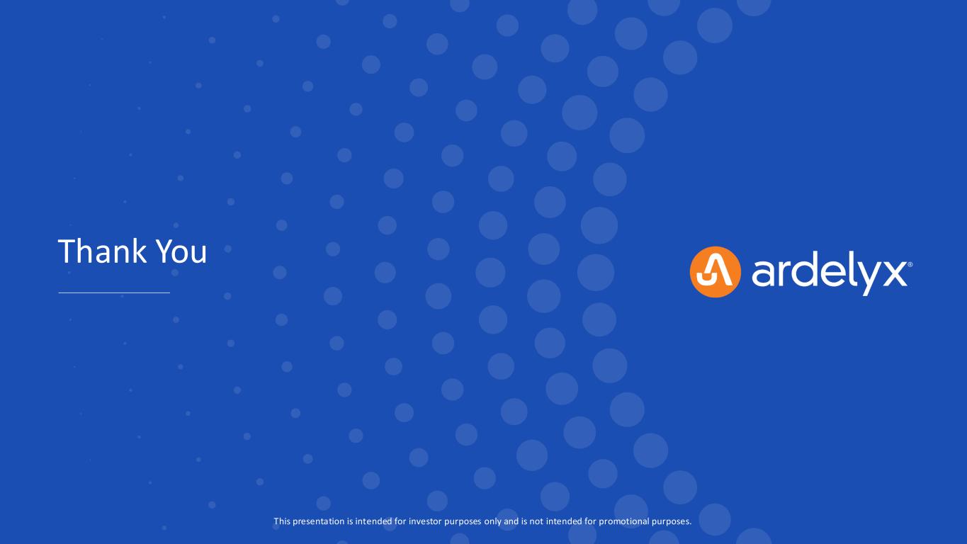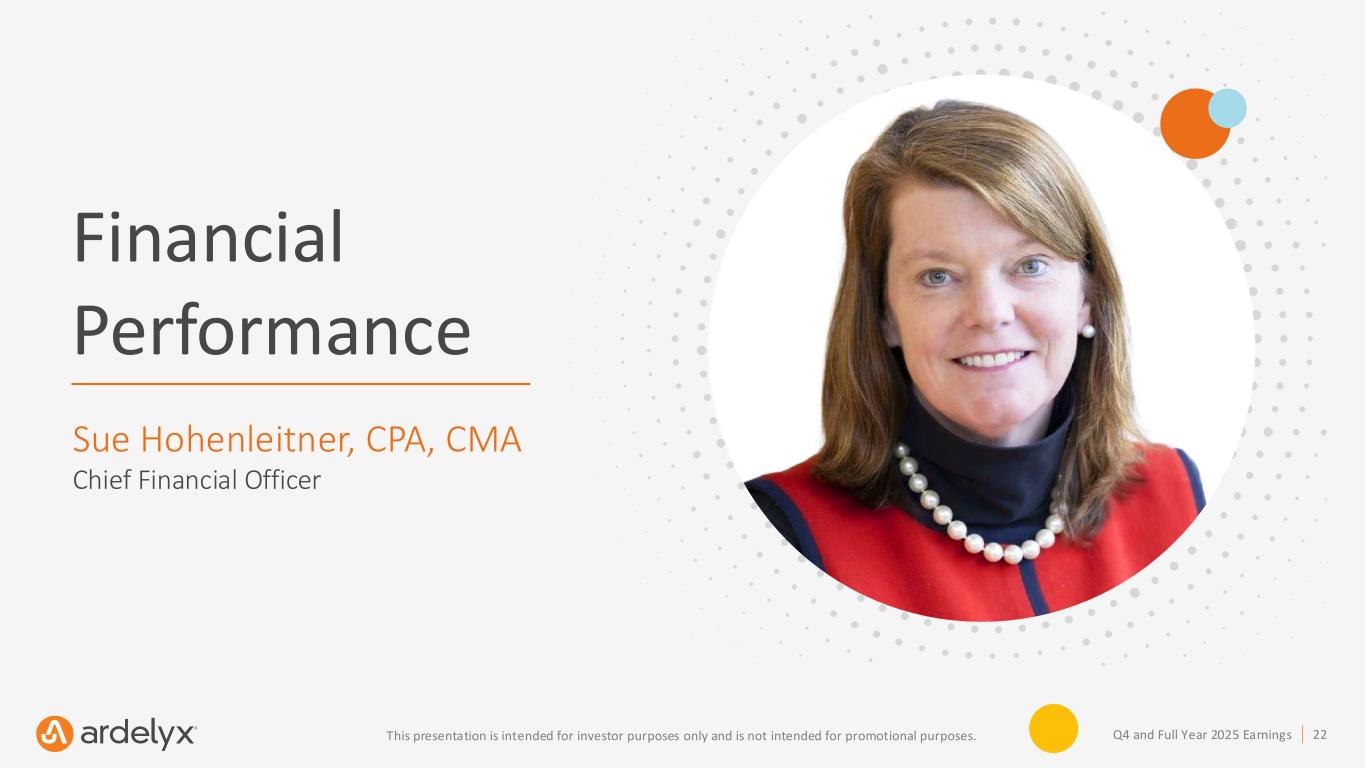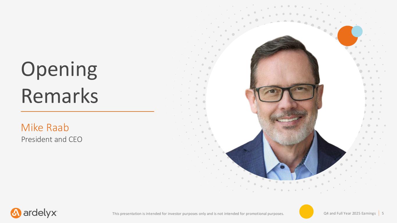 3Q4 and Full Year 2025 EarningsThis presentation is intended for investor purposes only and is not intended for promotional purposes. Forward-Looking Statements To the extent that statements contained in this presentation are not descriptions of historical facts regarding Ardelyx, they are forward-looking statements reflecting the current beliefs and expectations of management made pursuant to the safe harbor of the Private Securities Reform Act of 1995, including Ardelyx’s current expectations regarding: the company’s 2026 strategic priorities; the company’s planned label expansion for IBSRELA (tenapanor) to include patients with CIC, pending FDA approval; revenue for IBSRELA and XPHOZAH for 2026; the year in which IBSRELA will achieve annual U.S. net product sales revenue of $1 billion; the timing of the completion of enrollment in the CIC Phase 3 clinical trial, release of topline results, submission of a supplemental new drug application and the timing for when a CIC indication, if approved, may contribute to IBSRELA growth; an d the timing of an investigational new drug application and initiation of a Phase 1 clinical trial for RDX10531. Such forward -looking statements involve substantial risks and uncertainties that could cause Ardelyx's future results, performance or achievements to differ significantly from those expressed or implied by the forward-looking statements. Such risks and uncertainties include, among others, uncertainties associated with the commercialization of drugs and uncertainties regarding the FDA and foreign regulatory processes. Ardelyx undertakes no obligation to update or revise any forward-looking statements. For a further description of the risks and uncertainties that could cause actual results to differ from those expressed in these forward-looking statements, as well as risks relating to Ardelyx's business in general, please refer to Ardelyx’s annual report on Form 10 -K filed with the Securities and Exchange Commission on February 19, 2026, and its future current and periodic reports to be filed with the Securities and Exchange Commission.