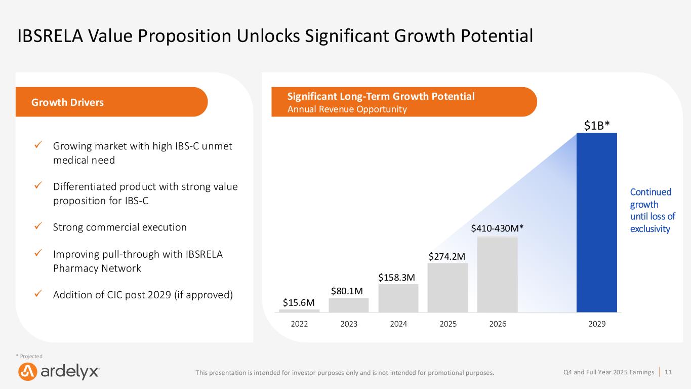 11Q4 and Full Year 2025 EarningsThis presentation is intended for investor purposes only and is not intended for promotional purposes. IBSRELA Value Proposition Unlocks Significant Growth Potential Growth Drivers ✓ Growing market with high IBS-C unmet medical need ✓ Differentiated product with strong value proposition for IBS-C ✓ Strong commercial execution ✓ Improving pull-through with IBSRELA Pharmacy Network ✓ Addition of CIC post 2029 (if approved) Significant Long-Term Growth Potential Annual Revenue Opportunity $158.3M $80.1M $15.6M $274.2M $410-430M* $1B* * Projected 2022 2023 2024 2025 2026 2029 Continued growth until loss of exclusivity