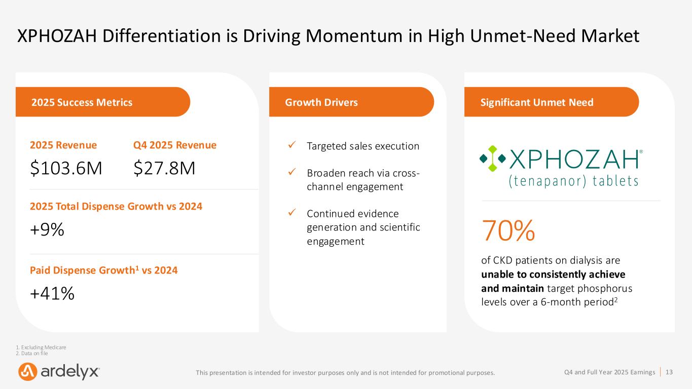 13Q4 and Full Year 2025 EarningsThis presentation is intended for investor purposes only and is not intended for promotional purposes. 2025 Success Metrics 2025 Revenue $103.6M 2025 Total Dispense Growth vs 2024 +9% Paid Dispense Growth1 vs 2024 +41% XPHOZAH Differentiation is Driving Momentum in High Unmet-Need Market Growth Drivers ✓ Targeted sales execution ✓ Broaden reach via cross- channel engagement ✓ Continued evidence generation and scientific engagement Q4 2025 Revenue $27.8M Significant Unmet Need 70% of CKD patients on dialysis are unable to consistently achieve and maintain target phosphorus levels over a 6-month period2 1. Excluding Medicare 2. Data on file