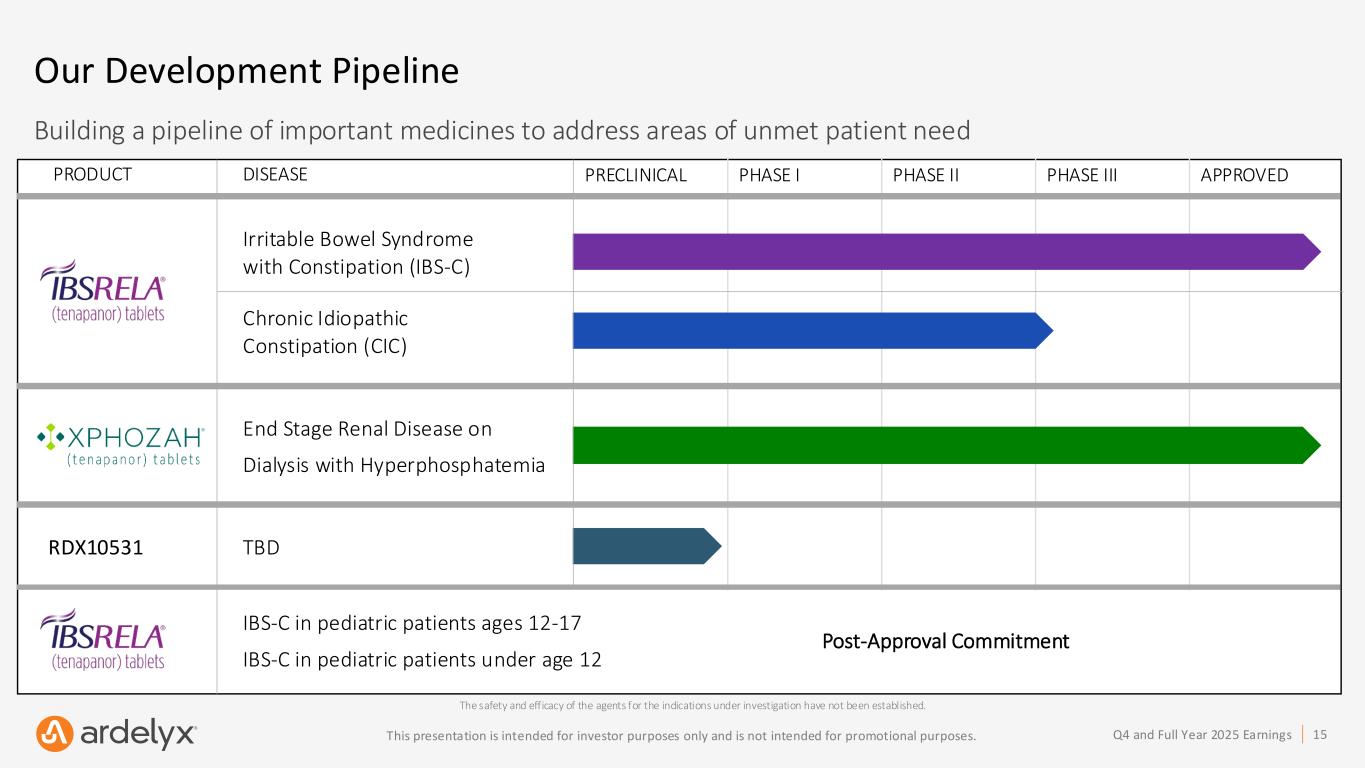 15Q4 and Full Year 2025 EarningsThis presentation is intended for investor purposes only and is not intended for promotional purposes. PRECLINICAL PHASE I PHASE II PHASE III APPROVED Our Development Pipeline The safety and efficacy of the agents for the indications under investigation have not been established. Building a pipeline of important medicines to address areas of unmet patient need PRODUCT DISEASE RDX10531 TBD End Stage Renal Disease on Dialysis with Hyperphosphatemia Irritable Bowel Syndrome with Constipation (IBS-C) Chronic Idiopathic Constipation (CIC) IBS-C in pediatric patients ages 12-17 IBS-C in pediatric patients under age 12 Post-Approval Commitment