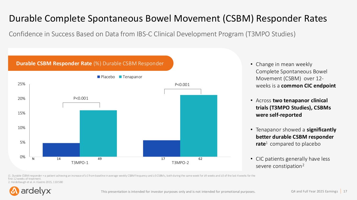 17Q4 and Full Year 2025 EarningsThis presentation is intended for investor purposes only and is not intended for promotional purposes. Durable Complete Spontaneous Bowel Movement (CSBM) Responder Rates Confidence in Success Based on Data from IBS-C Clinical Development Program (T3MPO Studies) • Change in mean weekly Complete Spontaneous Bowel Movement (CSBM) over 12- weeks is a common CIC endpoint • Across two tenapanor clinical trials (T3MPO Studies), CSBMs were self-reported • Tenapanor showed a significantly better durable CSBM responder rate1 compared to placebo • CIC patients generally have less severe constipation2 Durable CSBM Responder Rate (%) Durable CSBM Responder 0% 5% 10% 15% 20% 25% T3MPO-1 T3MPO-2 Placebo Tenapanor P<0.001 P<0.001 (1. Durable CSBM responder = a patient achieving an increase of ≥1 from baseline in average weekly CSBM frequency and ≥3 CSBMs, both during the same week for ≥9 weeks and ≥3 of the last 4 weeks for the first 12 weeks of treatment. 2. Heidelbaugh et al. A J Gastro 2015, 110:580 N 14 49 17 62