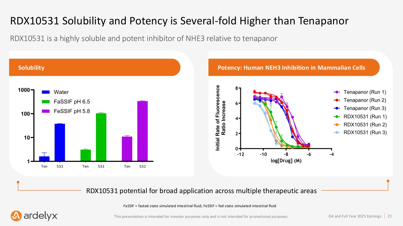 21Q4 and Full Year 2025 EarningsThis presentation is intended for investor purposes only and is not intended for promotional purposes. RDX10531 potential for broad application across multiple therapeutic areas RDX10531 is a highly soluble and potent inhibitor of NHE3 relative to tenapanor RDX10531 Solubility and Potency is Several-fold Higher than Tenapanor Solubility Potency: Human NEH3 Inhibition in Mammalian Cells Ten ap an or R D X 10 53 1 Ten ap an or R D X 10 53 1 Ten ap an or R D X 10 53 1 1 10 100 1000 Solubility C o n c e n tr a ti o n ( µ M ) Water FaSSIF pH 6.5 FeSSIF pH 5.8 Human NHE3 Inhibition in Mammalian Cells -12 -10 -8 -6 -4 0 2 4 6 8 log[Drug] (M) In it ia l R a te o f F lu o re s c e n c e R a ti o I n c re a s e Tenapanor (Run 2) Tenapanor (Run 1) Tenapanor (Run 3) RDX10531 (Run 1) RDX10531 (Run 2) RDX10531 (Run 3) Ten 531 Ten 531 Ten 531 FaSSIF = fasted state simulated intestinal fluid; FeSSIF = fed state simulated intestinal fluid