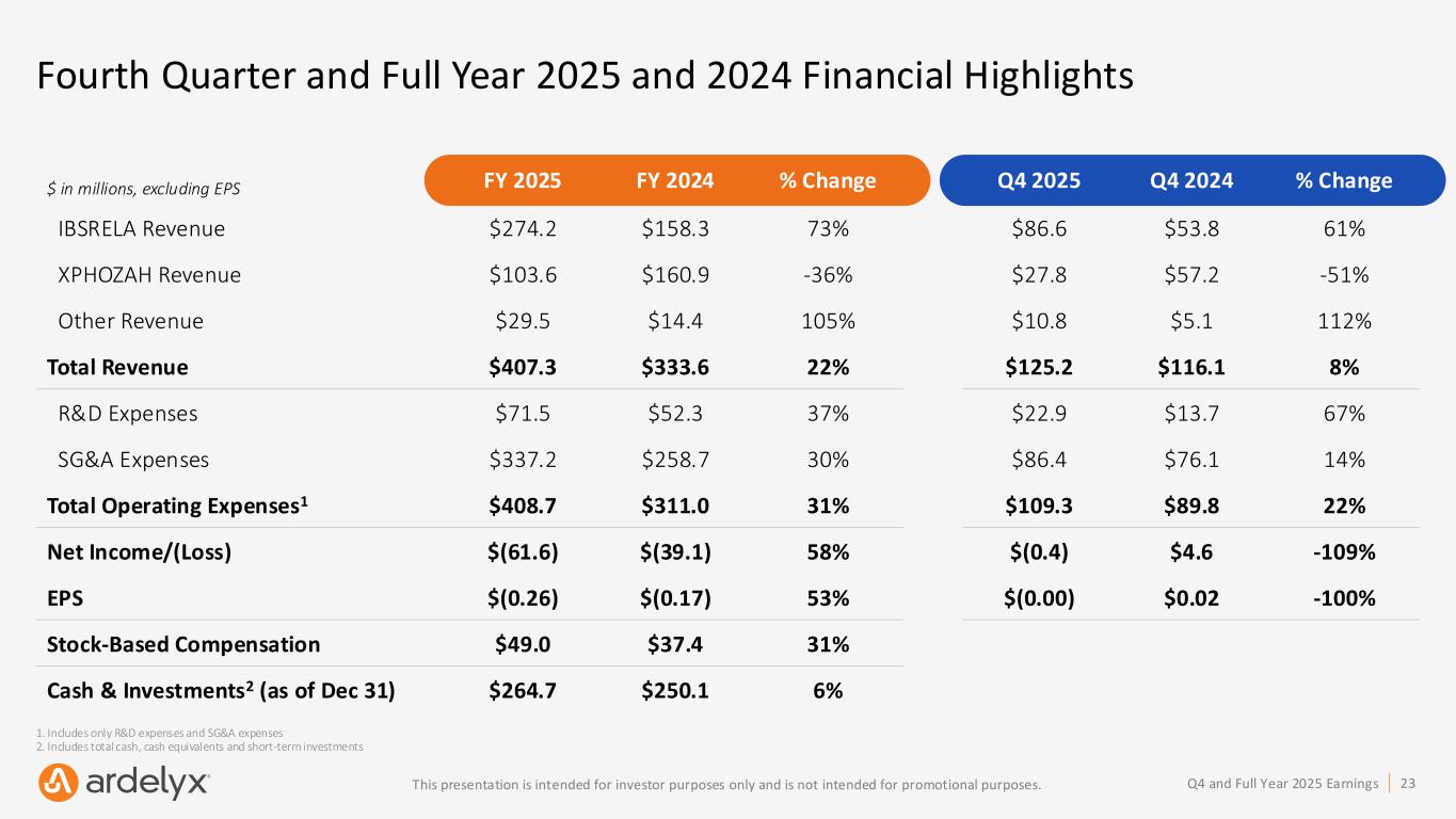 23Q4 and Full Year 2025 EarningsThis presentation is intended for investor purposes only and is not intended for promotional purposes. Fourth Quarter and Full Year 2025 and 2024 Financial Highlights $ in millions, excluding EPS FY 2025 FY 2024 % Change Q4 2025 Q4 2024 % Change IBSRELA Revenue $274.2 $158.3 73% $86.6 $53.8 61% XPHOZAH Revenue $103.6 $160.9 -36% $27.8 $57.2 -51% Other Revenue $29.5 $14.4 105% $10.8 $5.1 112% Total Revenue $407.3 $333.6 22% $125.2 $116.1 8% R&D Expenses $71.5 $52.3 37% $22.9 $13.7 67% SG&A Expenses $337.2 $258.7 30% $86.4 $76.1 14% Total Operating Expenses1 $408.7 $311.0 31% $109.3 $89.8 22% Net Income/(Loss) $(61.6) $(39.1) 58% $(0.4) $4.6 -109% EPS $(0.26) $(0.17) 53% $(0.00) $0.02 -100% Stock-Based Compensation $49.0 $37.4 31% Cash & Investments2 (as of Dec 31) $264.7 $250.1 6% 1. Includes only R&D expenses and SG&A expenses 2. Includes total cash, cash equivalents and short-term investments