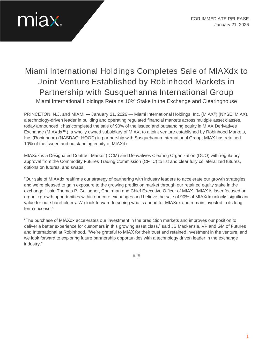 FOR IMMEDIATE RELEASE January 21, 2026 1 Miami International Holdings Completes Sale of MIAXdx to Joint Venture Established by Robinhood Markets in Partnership with Susquehanna International Group Miami International Holdings Retains 10% Stake in the Exchange and Clearinghouse PRINCETON, N.J. and MIAMI — January 21, 2026 — Miami International Holdings, Inc. (MIAX®) (NYSE: MIAX), a technology-driven leader in building and operating regulated financial markets across multiple asset classes, today announced it has completed the sale of 90% of the issued and outstanding equity in MIAX Derivatives Exchange (MIAXdx™), a wholly owned subsidiary of MIAX, to a joint venture established by Robinhood Markets, Inc. (Robinhood) (NASDAQ: HOOD) in partnership with Susquehanna International Group. MIAX has retained 10% of the issued and outstanding equity of MIAXdx. MIAXdx is a Designated Contract Market (DCM) and Derivatives Clearing Organization (DCO) with regulatory approval from the Commodity Futures Trading Commission (CFTC) to list and clear fully collateralized futures, options on futures, and swaps. “Our sale of MIAXdx reaffirms our strategy of partnering with industry leaders to accelerate our growth strategies and we’re pleased to gain exposure to the growing prediction market through our retained equity stake in the exchange,” said Thomas P. Gallagher, Chairman and Chief Executive Officer of MIAX. “MIAX is laser focused on organic growth opportunities within our core exchanges and believe the sale of 90% of MIAXdx unlocks significant value for our shareholders. We look forward to seeing what’s ahead for MIAXdx and remain invested in its long- term success.” “The purchase of MIAXdx accelerates our investment in the prediction markets and improves our position to deliver a better experience for customers in this growing asset class,” said JB Mackenzie, VP and GM of Futures and International at Robinhood. “We’re grateful to MIAX for their trust and retained investment in the venture, and we look forward to exploring future partnership opportunities with a technology driven leader in the exchange industry.” ###