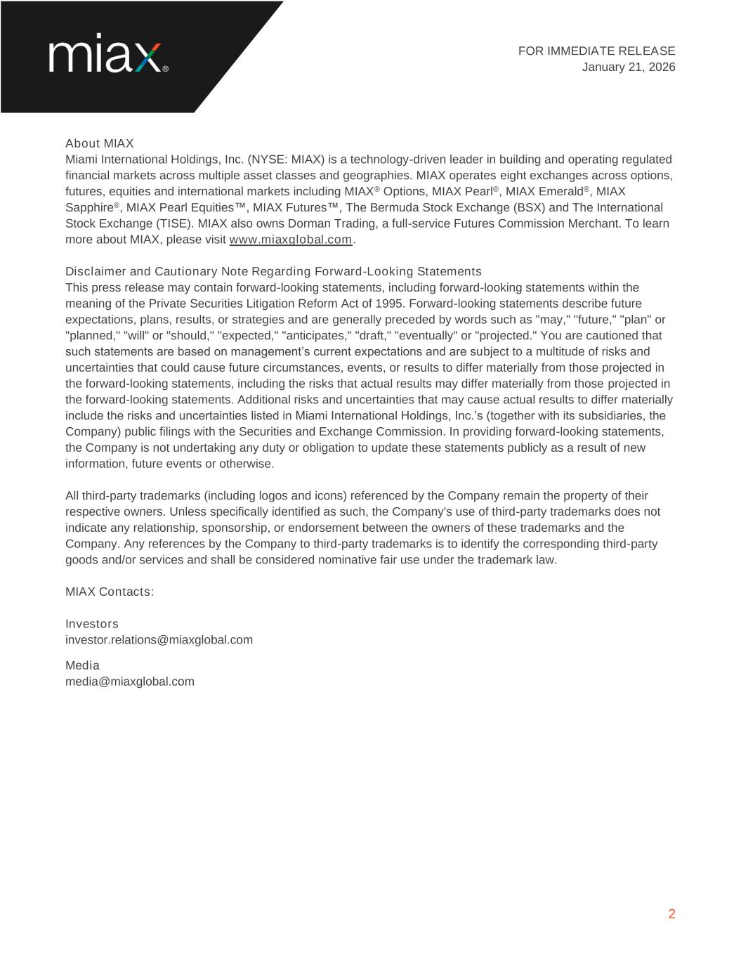 FOR IMMEDIATE RELEASE January 21, 2026 2 About MIAX Miami International Holdings, Inc. (NYSE: MIAX) is a technology-driven leader in building and operating regulated financial markets across multiple asset classes and geographies. MIAX operates eight exchanges across options, futures, equities and international markets including MIAX® Options, MIAX Pearl®, MIAX Emerald®, MIAX Sapphire®, MIAX Pearl Equities™, MIAX Futures™, The Bermuda Stock Exchange (BSX) and The International Stock Exchange (TISE). MIAX also owns Dorman Trading, a full-service Futures Commission Merchant. To learn more about MIAX, please visit www.miaxglobal.com. Disclaimer and Cautionary Note Regarding Forward-Looking Statements This press release may contain forward-looking statements, including forward-looking statements within the meaning of the Private Securities Litigation Reform Act of 1995. Forward-looking statements describe future expectations, plans, results, or strategies and are generally preceded by words such as "may," "future," "plan" or "planned," "will" or "should," "expected," "anticipates," "draft," "eventually" or "projected." You are cautioned that such statements are based on management’s current expectations and are subject to a multitude of risks and uncertainties that could cause future circumstances, events, or results to differ materially from those projected in the forward-looking statements, including the risks that actual results may differ materially from those projected in the forward-looking statements. Additional risks and uncertainties that may cause actual results to differ materially include the risks and uncertainties listed in Miami International Holdings, Inc.’s (together with its subsidiaries, the Company) public filings with the Securities and Exchange Commission. In providing forward-looking statements, the Company is not undertaking any duty or obligation to update these statements publicly as a result of new information, future events or otherwise. All third-party trademarks (including logos and icons) referenced by the Company remain the property of their respective owners. Unless specifically identified as such, the Company's use of third-party trademarks does not indicate any relationship, sponsorship, or endorsement between the owners of these trademarks and the Company. Any references by the Company to third-party trademarks is to identify the corresponding third-party goods and/or services and shall be considered nominative fair use under the trademark law. MIAX Contacts: Investors investor.relations@miaxglobal.com Media media@miaxglobal.com