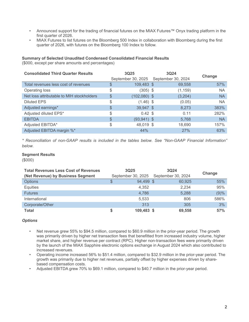 • Announced support for the trading of financial futures on the MIAX Futures™ Onyx trading platform in the first quarter of 2026. • MIAX Futures to list futures on the Bloomberg 500 Index in collaboration with Bloomberg during the first quarter of 2026, with futures on the Bloomberg 100 Index to follow. Summary of Selected Unaudited Condensed Consolidated Financial Results ($000, except per share amounts and percentages) Consolidated Third Quarter Results 3Q25 September 30, 2025 3Q24 September 30, 2024 Change Total revenues less cost of revenues $ 109,483 $ 69,558 57% Operating loss $ (305) $ (1,159) NA Net loss attributable to MIH stockholders $ (102,080) $ (3,204) NA Diluted EPS $ (1.46) $ (0.05) NA Adjusted earnings* $ 39,947 $ 8,273 383% Adjusted diluted EPS* $ 0.42 $ 0.11 282% EBITDA $ (93,941) $ 5,768 NA Adjusted EBITDA* $ 48,019 $ 18,690 157% Adjusted EBITDA margin %* 44% 27% 63% * Reconciliation of non-GAAP results is included in the tables below. See “Non-GAAP Financial Information” below. Segment Results ($000) Total Revenues Less Cost of Revenues (Net Revenue) by Business Segment 3Q25 September 30, 2025 3Q24 September 30, 2024 Change Options $ 94,499 $ 60,925 55% Equities 4,352 2,234 95% Futures 4,786 5,288 (9)% International 5,533 806 586% Corporate/Other 313 305 3% Total $ 109,483 $ 69,558 57% Options • Net revenue grew 55% to $94.5 million, compared to $60.9 million in the prior-year period. The growth was primarily driven by higher net transaction fees that benefitted from increased industry volume, higher market share, and higher revenue per contract (RPC). Higher non-transaction fees were primarily driven by the launch of the MIAX Sapphire electronic options exchange in August 2024 which also contributed to increased revenues. • Operating income increased 56% to $51.4 million, compared to $32.9 million in the prior-year period. The growth was primarily due to higher net revenues, partially offset by higher expenses driven by share- based compensation costs. • Adjusted EBITDA grew 70% to $69.1 million, compared to $40.7 million in the prior-year period. 2