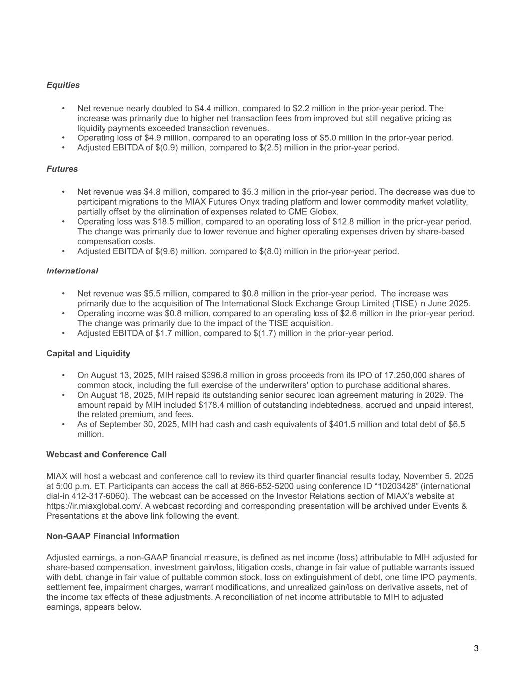 Equities • Net revenue nearly doubled to $4.4 million, compared to $2.2 million in the prior-year period. The increase was primarily due to higher net transaction fees from improved but still negative pricing as liquidity payments exceeded transaction revenues. • Operating loss of $4.9 million, compared to an operating loss of $5.0 million in the prior-year period. • Adjusted EBITDA of $(0.9) million, compared to $(2.5) million in the prior-year period. Futures • Net revenue was $4.8 million, compared to $5.3 million in the prior-year period. The decrease was due to participant migrations to the MIAX Futures Onyx trading platform and lower commodity market volatility, partially offset by the elimination of expenses related to CME Globex. • Operating loss was $18.5 million, compared to an operating loss of $12.8 million in the prior-year period. The change was primarily due to lower revenue and higher operating expenses driven by share-based compensation costs. • Adjusted EBITDA of $(9.6) million, compared to $(8.0) million in the prior-year period. International • Net revenue was $5.5 million, compared to $0.8 million in the prior-year period. The increase was primarily due to the acquisition of The International Stock Exchange Group Limited (TISE) in June 2025. • Operating income was $0.8 million, compared to an operating loss of $2.6 million in the prior-year period. The change was primarily due to the impact of the TISE acquisition. • Adjusted EBITDA of $1.7 million, compared to $(1.7) million in the prior-year period. Capital and Liquidity • On August 13, 2025, MIH raised $396.8 million in gross proceeds from its IPO of 17,250,000 shares of common stock, including the full exercise of the underwriters' option to purchase additional shares. • On August 18, 2025, MIH repaid its outstanding senior secured loan agreement maturing in 2029. The amount repaid by MIH included $178.4 million of outstanding indebtedness, accrued and unpaid interest, the related premium, and fees. • As of September 30, 2025, MIH had cash and cash equivalents of $401.5 million and total debt of $6.5 million. Webcast and Conference Call MIAX will host a webcast and conference call to review its third quarter financial results today, November 5, 2025 at 5:00 p.m. ET. Participants can access the call at 866-652-5200 using conference ID “10203428” (international dial-in 412-317-6060). The webcast can be accessed on the Investor Relations section of MIAX’s website at https://ir.miaxglobal.com/. A webcast recording and corresponding presentation will be archived under Events & Presentations at the above link following the event. Non-GAAP Financial Information Adjusted earnings, a non-GAAP financial measure, is defined as net income (loss) attributable to MIH adjusted for share-based compensation, investment gain/loss, litigation costs, change in fair value of puttable warrants issued with debt, change in fair value of puttable common stock, loss on extinguishment of debt, one time IPO payments, settlement fee, impairment charges, warrant modifications, and unrealized gain/loss on derivative assets, net of the income tax effects of these adjustments. A reconciliation of net income attributable to MIH to adjusted earnings, appears below. 3