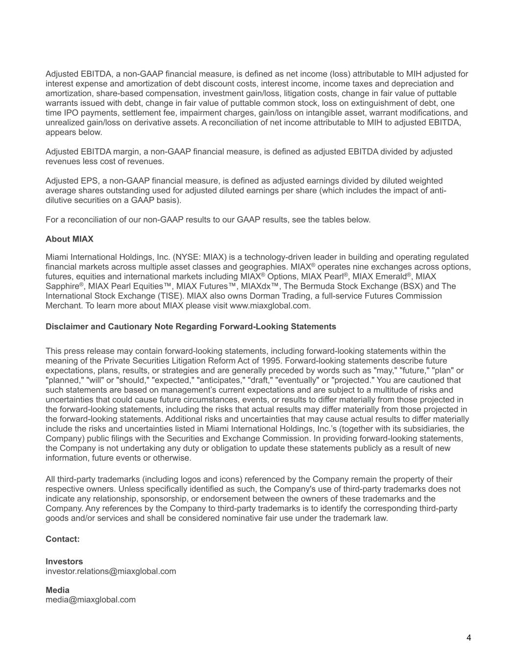 Adjusted EBITDA, a non-GAAP financial measure, is defined as net income (loss) attributable to MIH adjusted for interest expense and amortization of debt discount costs, interest income, income taxes and depreciation and amortization, share-based compensation, investment gain/loss, litigation costs, change in fair value of puttable warrants issued with debt, change in fair value of puttable common stock, loss on extinguishment of debt, one time IPO payments, settlement fee, impairment charges, gain/loss on intangible asset, warrant modifications, and unrealized gain/loss on derivative assets. A reconciliation of net income attributable to MIH to adjusted EBITDA, appears below. Adjusted EBITDA margin, a non-GAAP financial measure, is defined as adjusted EBITDA divided by adjusted revenues less cost of revenues. Adjusted EPS, a non-GAAP financial measure, is defined as adjusted earnings divided by diluted weighted average shares outstanding used for adjusted diluted earnings per share (which includes the impact of anti- dilutive securities on a GAAP basis). For a reconciliation of our non-GAAP results to our GAAP results, see the tables below. About MIAX Miami International Holdings, Inc. (NYSE: MIAX) is a technology-driven leader in building and operating regulated financial markets across multiple asset classes and geographies. MIAX® operates nine exchanges across options, futures, equities and international markets including MIAX® Options, MIAX Pearl®, MIAX Emerald®, MIAX Sapphire®, MIAX Pearl Equities™, MIAX Futures™, MIAXdx™, The Bermuda Stock Exchange (BSX) and The International Stock Exchange (TISE). MIAX also owns Dorman Trading, a full-service Futures Commission Merchant. To learn more about MIAX please visit www.miaxglobal.com. Disclaimer and Cautionary Note Regarding Forward-Looking Statements This press release may contain forward-looking statements, including forward-looking statements within the meaning of the Private Securities Litigation Reform Act of 1995. Forward-looking statements describe future expectations, plans, results, or strategies and are generally preceded by words such as "may," "future," "plan" or "planned," "will" or "should," "expected," "anticipates," "draft," "eventually" or "projected." You are cautioned that such statements are based on management’s current expectations and are subject to a multitude of risks and uncertainties that could cause future circumstances, events, or results to differ materially from those projected in the forward-looking statements, including the risks that actual results may differ materially from those projected in the forward-looking statements. Additional risks and uncertainties that may cause actual results to differ materially include the risks and uncertainties listed in Miami International Holdings, Inc.’s (together with its subsidiaries, the Company) public filings with the Securities and Exchange Commission. In providing forward-looking statements, the Company is not undertaking any duty or obligation to update these statements publicly as a result of new information, future events or otherwise. All third-party trademarks (including logos and icons) referenced by the Company remain the property of their respective owners. Unless specifically identified as such, the Company's use of third-party trademarks does not indicate any relationship, sponsorship, or endorsement between the owners of these trademarks and the Company. Any references by the Company to third-party trademarks is to identify the corresponding third-party goods and/or services and shall be considered nominative fair use under the trademark law. Contact: Investors investor.relations@miaxglobal.com Media media@miaxglobal.com 4