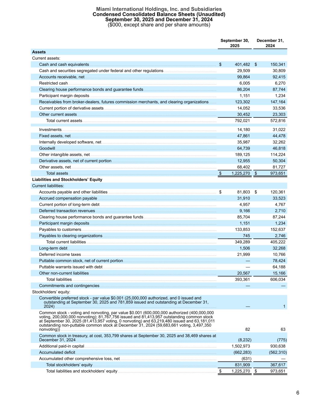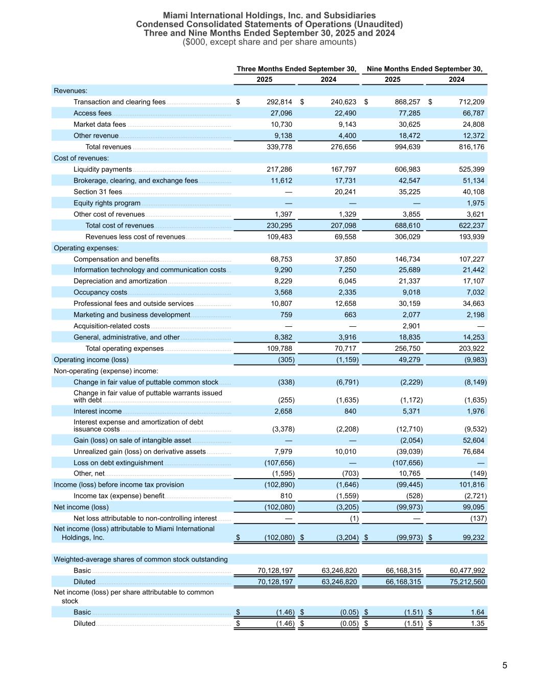 Three Months Ended September 30, Nine Months Ended September 30, 2025 2024 2025 2024 Revenues: Transaction and clearing fees ..................................... $ 292,814 $ 240,623 $ 868,257 $ 712,209 Access fees .................................................................... 27,096 22,490 77,285 66,787 Market data fees ........................................................... 10,730 9,143 30,625 24,808 Other revenue ................................................................ 9,138 4,400 18,472 12,372 Total revenues ........................................................ 339,778 276,656 994,639 816,176 Cost of revenues: Liquidity payments ........................................................ 217,286 167,797 606,983 525,399 Brokerage, clearing, and exchange fees ................... 11,612 17,731 42,547 51,134 Section 31 fees .............................................................. — 20,241 35,225 40,108 Equity rights program ................................................... — — — 1,975 Other cost of revenues ................................................. 1,397 1,329 3,855 3,621 Total cost of revenues ............................................ 230,295 207,098 688,610 622,237 Revenues less cost of revenues .......................... 109,483 69,558 306,029 193,939 Operating expenses: Compensation and benefits ......................................... 68,753 37,850 146,734 107,227 Information technology and communication costs ... 9,290 7,250 25,689 21,442 Depreciation and amortization .................................... 8,229 6,045 21,337 17,107 Occupancy costs ........................................................... 3,568 2,335 9,018 7,032 Professional fees and outside services ..................... 10,807 12,658 30,159 34,663 Marketing and business development ....................... 759 663 2,077 2,198 Acquisition-related costs .............................................. — — 2,901 — General, administrative, and other ............................. 8,382 3,916 18,835 14,253 Total operating expenses ...................................... 109,788 70,717 256,750 203,922 Operating income (loss) (305) (1,159) 49,279 (9,983) Non-operating (expense) income: Change in fair value of puttable common stock ....... (338) (6,791) (2,229) (8,149) Change in fair value of puttable warrants issued with debt ......................................................................... (255) (1,635) (1,172) (1,635) Interest income .............................................................. 2,658 840 5,371 1,976 Interest expense and amortization of debt issuance costs ............................................................... (3,378) (2,208) (12,710) (9,532) Gain (loss) on sale of intangible asset ....................... — — (2,054) 52,604 Unrealized gain (loss) on derivative assets .............. 7,979 10,010 (39,039) 76,684 Loss on debt extinguishment ...................................... (107,656) — (107,656) — Other, net ........................................................................ (1,595) (703) 10,765 (149) Income (loss) before income tax provision (102,890) (1,646) (99,445) 101,816 Income tax (expense) benefit ...................................... 810 (1,559) (528) (2,721) Net income (loss) (102,080) (3,205) (99,973) 99,095 Net loss attributable to non-controlling interest ........ — (1) — (137) Net income (loss) attributable to Miami International Holdings, Inc. $ (102,080) $ (3,204) $ (99,973) $ 99,232 Weighted-average shares of common stock outstanding Basic ............................................................................... 70,128,197 63,246,820 66,168,315 60,477,992 Diluted ............................................................................. 70,128,197 63,246,820 66,168,315 75,212,560 Net income (loss) per share attributable to common stock Basic ............................................................................... $ (1.46) $ (0.05) $ (1.51) $ 1.64 Diluted ............................................................................. $ (1.46) $ (0.05) $ (1.51) $ 1.35 Miami International Holdings, Inc. and Subsidiaries Condensed Consolidated Statements of Operations (Unaudited) Three and Nine Months Ended September 30, 2025 and 2024 ($000, except share and per share amounts) 5