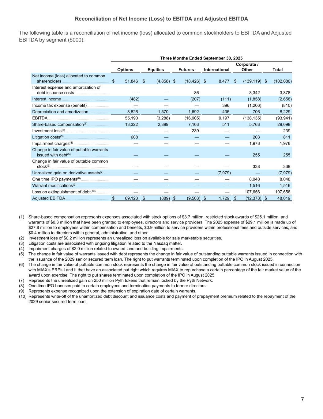 Reconciliation of Net Income (Loss) to EBITDA and Adjusted EBITDA The following table is a reconciliation of net income (loss) allocated to common stockholders to EBITDA and Adjusted EBITDA by segment ($000): Three Months Ended September 30, 2025 Options Equities Futures International Corporate / Other Total Net income (loss) allocated to common shareholders ............................................. $ 51,846 $ (4,858) $ (18,426) $ 8,477 $ (139,119) $ (102,080) Interest expense and amortization of debt issuance costs ................................. — — 36 — 3,342 3,378 Interest income ............................................. (482) — (207) (111) (1,858) (2,658) Income tax expense (benefit) ..................... — — — 396 (1,206) (810) Depreciation and amortization .................... 3,826 1,570 1,692 435 706 8,229 EBITDA .......................................................... 55,190 (3,288) (16,905) 9,197 (138,135) (93,941) Share-based compensation(1) ..................... 13,322 2,399 7,103 511 5,763 29,098 Investment loss(2) .......................................... — — 239 — — 239 Litigation costs(3) ........................................... 608 — — — 203 811 Impairment charges(4) .................................. — — — — 1,978 1,978 Change in fair value of puttable warrants issued with debt(5) .................................... — — — — 255 255 Change in fair value of puttable common stock(6) ........................................................ — — — — 338 338 Unrealized gain on derivative assets(7) ..... — — — (7,979) — (7,979) One time IPO payments(8) ........................... — — — — 8,048 8,048 Warrant modifications(9) .............................. — — — — 1,516 1,516 Loss on extinguishment of debt(10) ............. — — — — 107,656 107,656 Adjusted EBITDA .......................................... $ 69,120 $ (889) $ (9,563) $ 1,729 $ (12,378) $ 48,019 (1) Share-based compensation represents expenses associated with stock options of $3.7 million, restricted stock awards of $25.1 million, and warrants of $0.3 million that have been granted to employees, directors and service providers. The 2025 expense of $29.1 million is made up of $27.8 million to employees within compensation and benefits, $0.9 million to service providers within professional fees and outside services, and $0.4 million to directors within general, administrative, and other. (2) Investment loss of $0.2 million represents an unrealized loss on available for sale marketable securities. (3) Litigation costs are associated with ongoing litigation related to the Nasdaq matter. (4) Impairment charges of $2.0 million related to owned land and building impairments. (5) The change in fair value of warrants issued with debt represents the change in fair value of outstanding puttable warrants issued in connection with the issuance of the 2029 senior secured term loan. The right to put warrants terminated upon completion of the IPO in August 2025. (6) The change in fair value of puttable common stock represents the change in fair value of outstanding puttable common stock issued in connection with MIAX’s ERPs I and II that have an associated put right which requires MIAX to repurchase a certain percentage of the fair market value of the award upon exercise. The right to put shares terminated upon completion of the IPO in August 2025. (7) Represents the unrealized gain on 250 million Pyth tokens that remain locked by the Pyth Network. (8) One time IPO bonuses paid to certain employees and termination payments to former directors. (9) Represents expense recognized upon the extension of expiration date of certain warrants. (10) Represents write-off of the unamortized debt discount and issuance costs and payment of prepayment premium related to the repayment of the 2029 senior secured term loan. 7