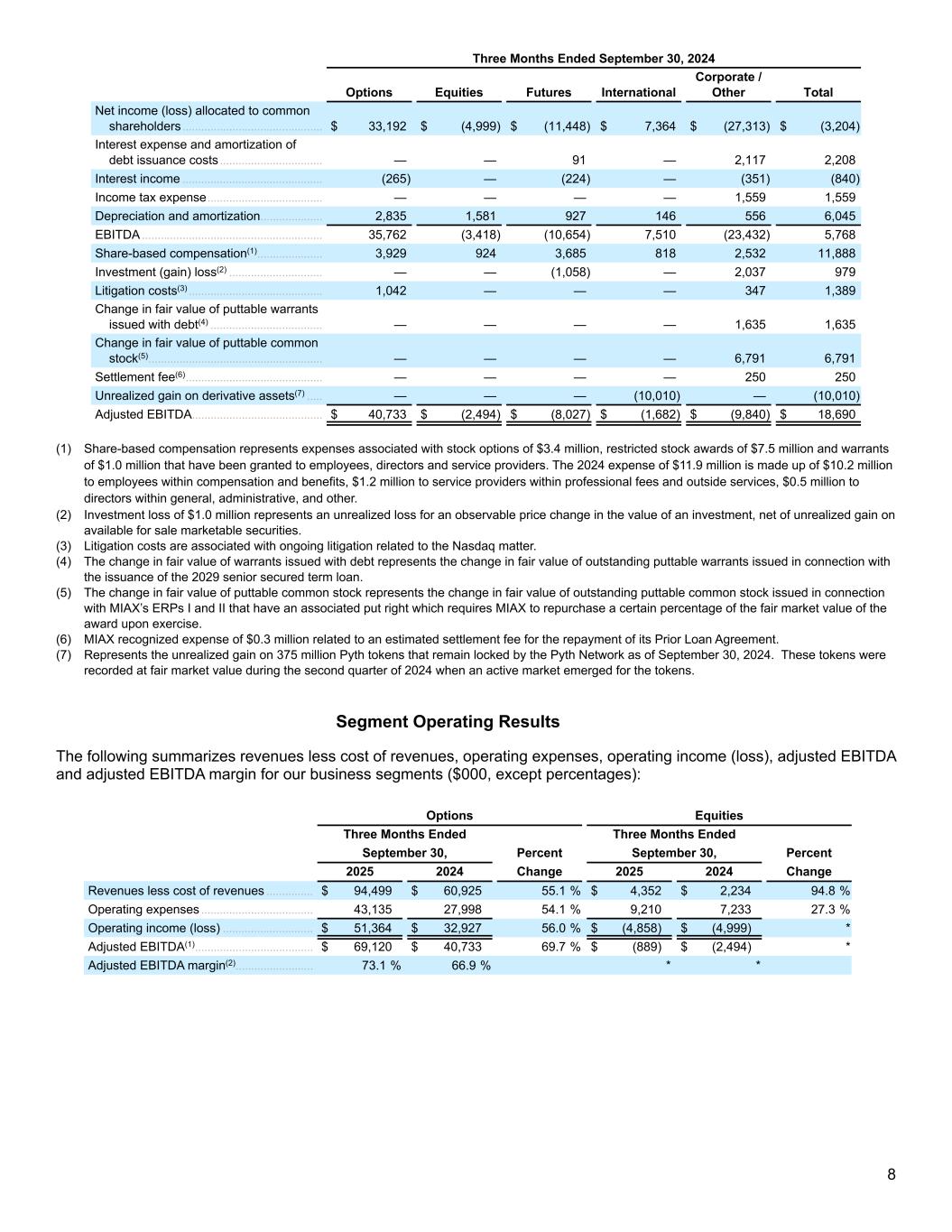 Three Months Ended September 30, 2024 Options Equities Futures International Corporate / Other Total Net income (loss) allocated to common shareholders ............................................. $ 33,192 $ (4,999) $ (11,448) $ 7,364 $ (27,313) $ (3,204) Interest expense and amortization of debt issuance costs ................................. — — 91 — 2,117 2,208 Interest income ............................................. (265) — (224) — (351) (840) Income tax expense ..................................... — — — — 1,559 1,559 Depreciation and amortization .................... 2,835 1,581 927 146 556 6,045 EBITDA .......................................................... 35,762 (3,418) (10,654) 7,510 (23,432) 5,768 Share-based compensation(1) ..................... 3,929 924 3,685 818 2,532 11,888 Investment (gain) loss(2) .............................. — — (1,058) — 2,037 979 Litigation costs(3) ........................................... 1,042 — — — 347 1,389 Change in fair value of puttable warrants issued with debt(4) .................................... — — — — 1,635 1,635 Change in fair value of puttable common stock(5) ........................................................ — — — — 6,791 6,791 Settlement fee(6) ............................................ — — — — 250 250 Unrealized gain on derivative assets(7) ..... — — — (10,010) — (10,010) Adjusted EBITDA .......................................... $ 40,733 $ (2,494) $ (8,027) $ (1,682) $ (9,840) $ 18,690 (1) Share-based compensation represents expenses associated with stock options of $3.4 million, restricted stock awards of $7.5 million and warrants of $1.0 million that have been granted to employees, directors and service providers. The 2024 expense of $11.9 million is made up of $10.2 million to employees within compensation and benefits, $1.2 million to service providers within professional fees and outside services, $0.5 million to directors within general, administrative, and other. (2) Investment loss of $1.0 million represents an unrealized loss for an observable price change in the value of an investment, net of unrealized gain on available for sale marketable securities. (3) Litigation costs are associated with ongoing litigation related to the Nasdaq matter. (4) The change in fair value of warrants issued with debt represents the change in fair value of outstanding puttable warrants issued in connection with the issuance of the 2029 senior secured term loan. (5) The change in fair value of puttable common stock represents the change in fair value of outstanding puttable common stock issued in connection with MIAX’s ERPs I and II that have an associated put right which requires MIAX to repurchase a certain percentage of the fair market value of the award upon exercise. (6) MIAX recognized expense of $0.3 million related to an estimated settlement fee for the repayment of its Prior Loan Agreement. (7) Represents the unrealized gain on 375 million Pyth tokens that remain locked by the Pyth Network as of September 30, 2024. These tokens were recorded at fair market value during the second quarter of 2024 when an active market emerged for the tokens. Segment Operating Results The following summarizes revenues less cost of revenues, operating expenses, operating income (loss), adjusted EBITDA and adjusted EBITDA margin for our business segments ($000, except percentages): Options Equities Three Months Ended Three Months Ended September 30, Percent September 30, Percent 2025 2024 Change 2025 2024 Change Revenues less cost of revenues ............... $ 94,499 $ 60,925 55.1 % $ 4,352 $ 2,234 94.8 % Operating expenses .................................... 43,135 27,998 54.1 % 9,210 7,233 27.3 % Operating income (loss) ............................. $ 51,364 $ 32,927 56.0 % $ (4,858) $ (4,999) * Adjusted EBITDA(1) ...................................... $ 69,120 $ 40,733 69.7 % $ (889) $ (2,494) * Adjusted EBITDA margin(2) ......................... 73.1 % 66.9 % * * 8