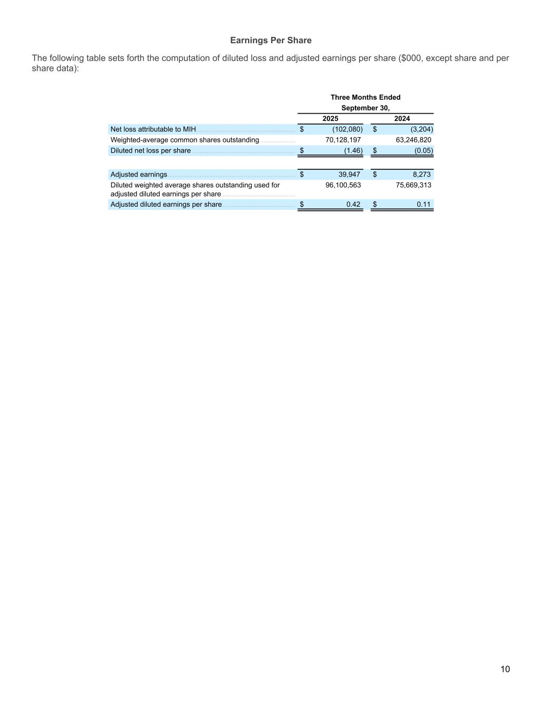 Earnings Per Share The following table sets forth the computation of diluted loss and adjusted earnings per share ($000, except share and per share data): Three Months Ended September 30, 2025 2024 Net loss attributable to MIH ........................................................ $ (102,080) $ (3,204) Weighted-average common shares outstanding .................... 70,128,197 63,246,820 Diluted net loss per share .......................................................... $ (1.46) $ (0.05) Adjusted earnings ........................................................................ $ 39,947 $ 8,273 Diluted weighted average shares outstanding used for adjusted diluted earnings per share ......................................... 96,100,563 75,669,313 Adjusted diluted earnings per share ......................................... $ 0.42 $ 0.11 10