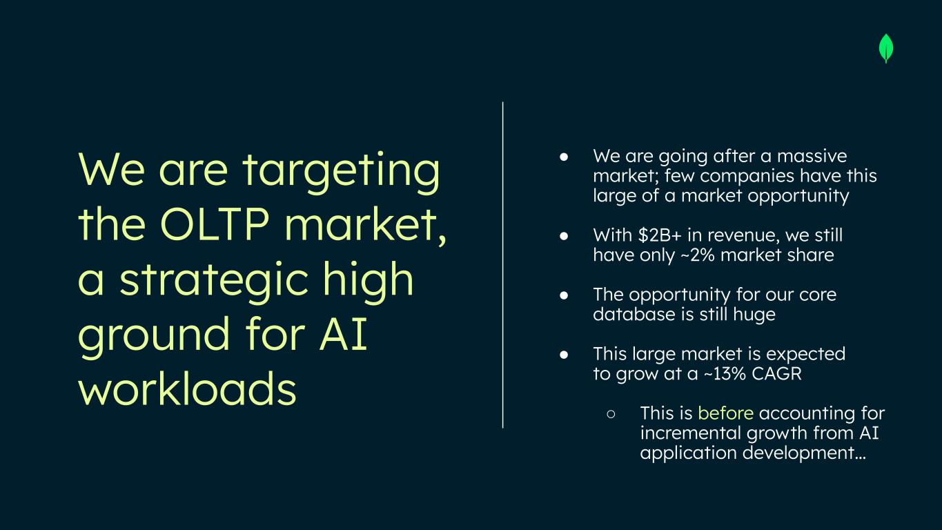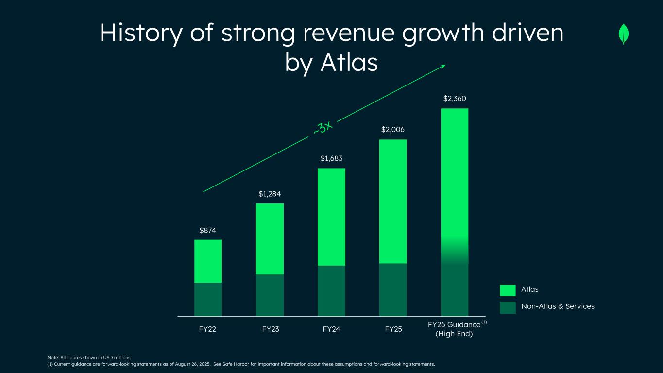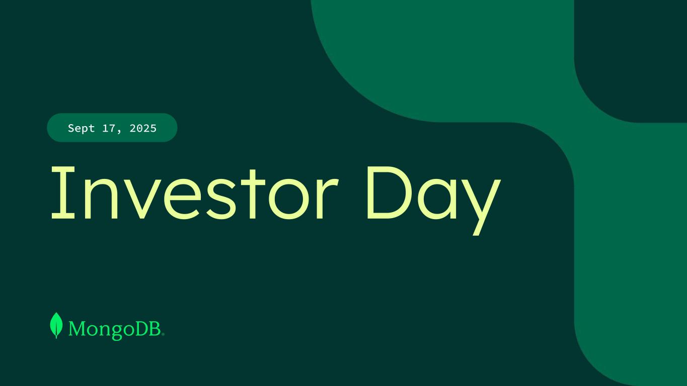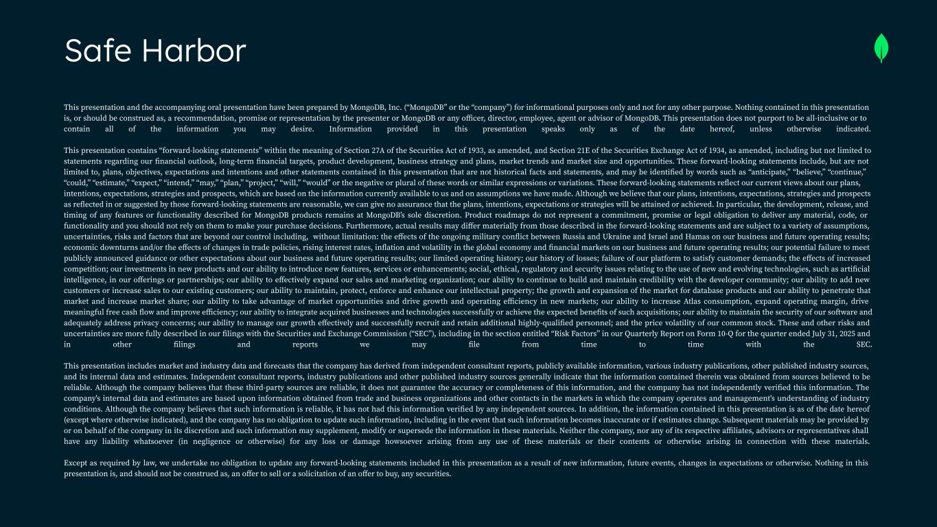 Safe Harbor This presentation and the accompanying oral presentation have been prepared by MongoDB, Inc. (“MongoDB” or the “company”) for informational purposes only and not for any other purpose. Nothing contained in this presentation is, or should be construed as, a recommendation, promise or representation by the presenter or MongoDB or any officer, director, employee, agent or advisor of MongoDB. This presentation does not purport to be all-inclusive or to contain all of the information you may desire. Information provided in this presentation speaks only as of the date hereof, unless otherwise indicated. This presentation contains “forward-looking statements” within the meaning of Section 27A of the Securities Act of 1933, as amended, and Section 21E of the Securities Exchange Act of 1934, as amended, including but not limited to statements regarding our financial outlook, long-term financial targets, product development, business strategy and plans, market trends and market size and opportunities. These forward-looking statements include, but are not limited to, plans, objectives, expectations and intentions and other statements contained in this presentation that are not historical facts and statements, and may be identified by words such as “anticipate,” “believe,” “continue,” “could,” “estimate,” “expect,” “intend,” “may,” “plan,” “project,” “will,” “would” or the negative or plural of these words or similar expressions or variations. These forward-looking statements reflect our current views about our plans, intentions, expectations, strategies and prospects, which are based on the information currently available to us and on assumptions we have made. Although we believe that our plans, intentions, expectations, strategies and prospects as reflected in or suggested by those forward-looking statements are reasonable, we can give no assurance that the plans, intentions, expectations or strategies will be attained or achieved. In particular, the development, release, and timing of any features or functionality described for MongoDB products remains at MongoDB s̓ sole discretion. Product roadmaps do not represent a commitment, promise or legal obligation to deliver any material, code, or functionality and you should not rely on them to make your purchase decisions. Furthermore, actual results may differ materially from those described in the forward-looking statements and are subject to a variety of assumptions, uncertainties, risks and factors that are beyond our control including, without limitation: the effects of the ongoing military conflict between Russia and Ukraine and Israel and Hamas on our business and future operating results; economic downturns and/or the effects of changes in trade policies, rising interest rates, inflation and volatility in the global economy and financial markets on our business and future operating results; our potential failure to meet publicly announced guidance or other expectations about our business and future operating results; our limited operating history; our history of losses; failure of our platform to satisfy customer demands; the effects of increased competition; our investments in new products and our ability to introduce new features, services or enhancements; social, ethical, regulatory and security issues relating to the use of new and evolving technologies, such as artificial intelligence, in our offerings or partnerships; our ability to effectively expand our sales and marketing organization; our ability to continue to build and maintain credibility with the developer community; our ability to add new customers or increase sales to our existing customers; our ability to maintain, protect, enforce and enhance our intellectual property; the growth and expansion of the market for database products and our ability to penetrate that market and increase market share; our ability to take advantage of market opportunities and drive growth and operating efficiency in new markets; our ability to increase Atlas consumption, expand operating margin, drive meaningful free cash flow and improve efficiency; our ability to integrate acquired businesses and technologies successfully or achieve the expected benefits of such acquisitions; our ability to maintain the security of our software and adequately address privacy concerns; our ability to manage our growth effectively and successfully recruit and retain additional highly-qualified personnel; and the price volatility of our common stock. These and other risks and uncertainties are more fully described in our filings with the Securities and Exchange Commission (“SEC”), including in the section entitled “Risk Factors” in our Quarterly Report on Form 10-Q for the quarter ended July 31, 2025 and in other filings and reports we may file from time to time with the SEC. This presentation includes market and industry data and forecasts that the company has derived from independent consultant reports, publicly available information, various industry publications, other published industry sources, and its internal data and estimates. Independent consultant reports, industry publications and other published industry sources generally indicate that the information contained therein was obtained from sources believed to be reliable. Although the company believes that these third-party sources are reliable, it does not guarantee the accuracy or completeness of this information, and the company has not independently verified this information. The company's internal data and estimates are based upon information obtained from trade and business organizations and other contacts in the markets in which the company operates and management's understanding of industry conditions. Although the company believes that such information is reliable, it has not had this information verified by any independent sources. In addition, the information contai