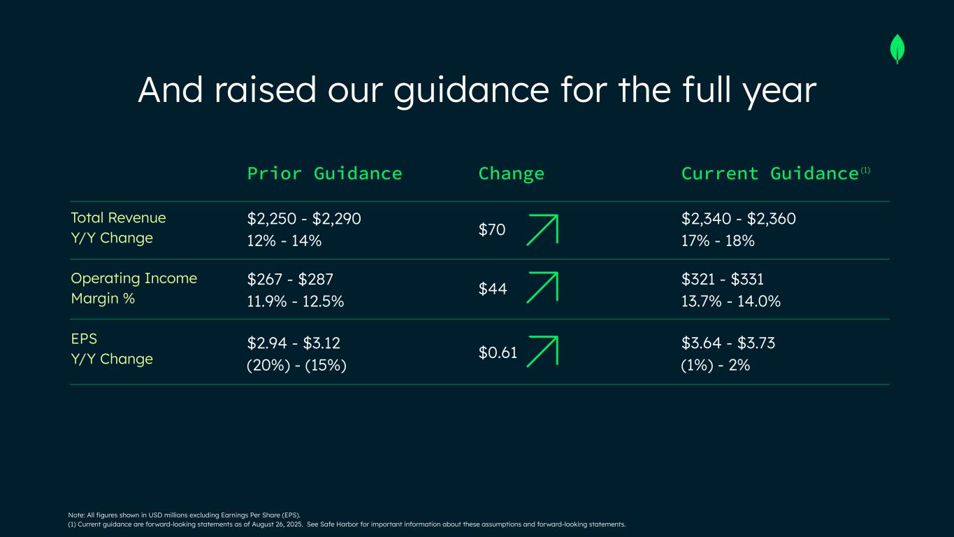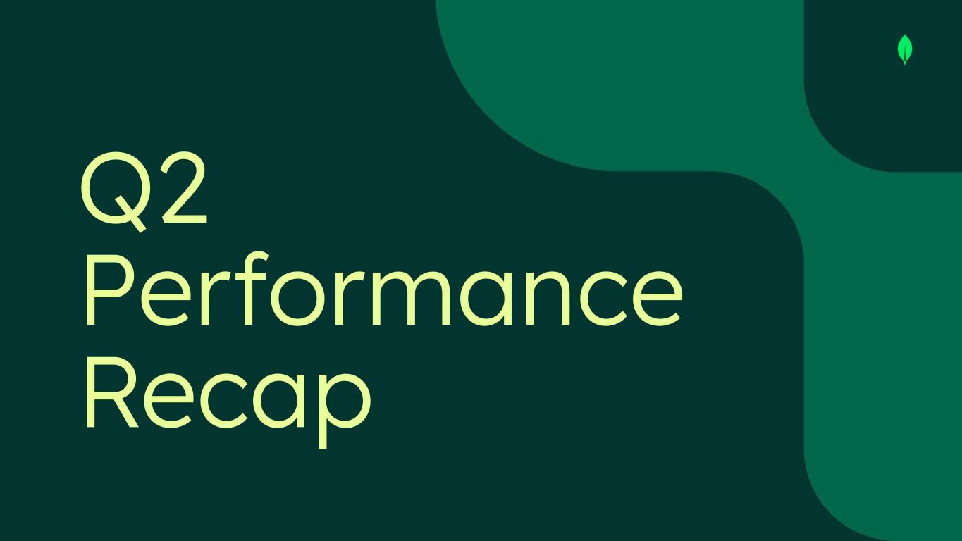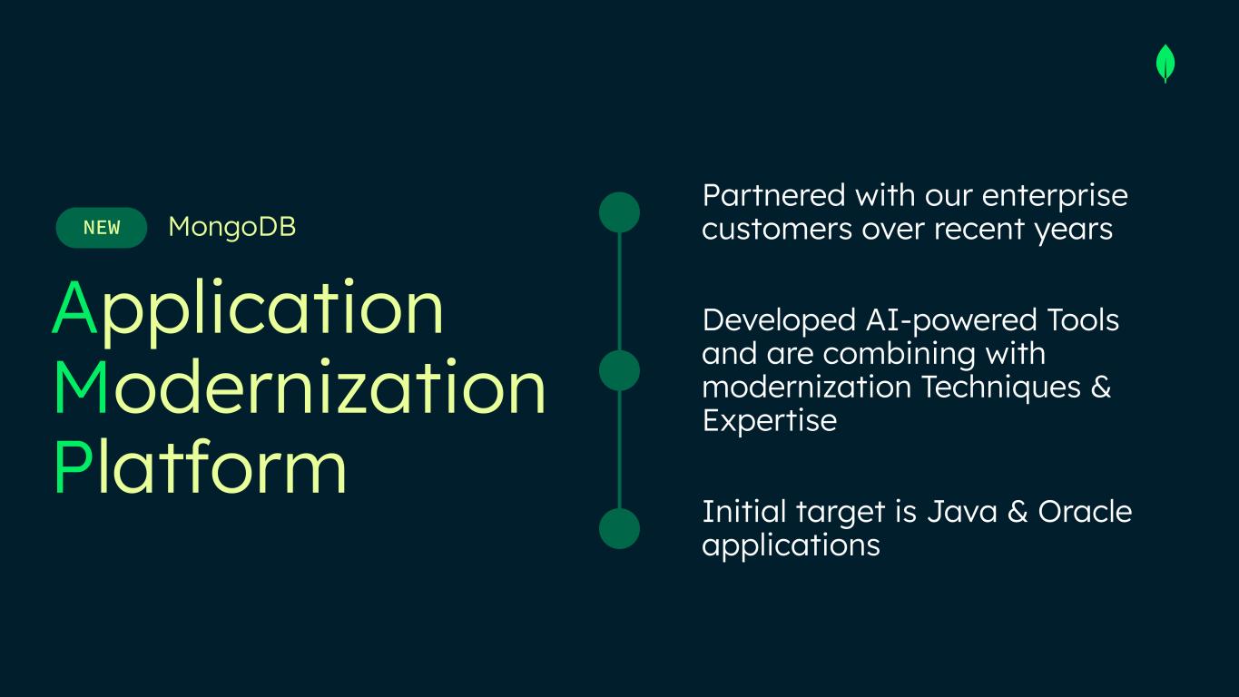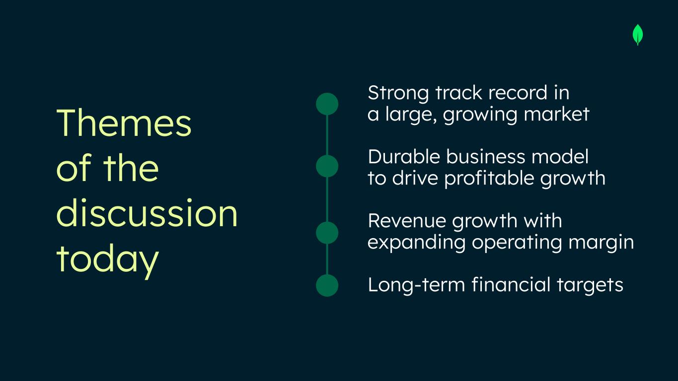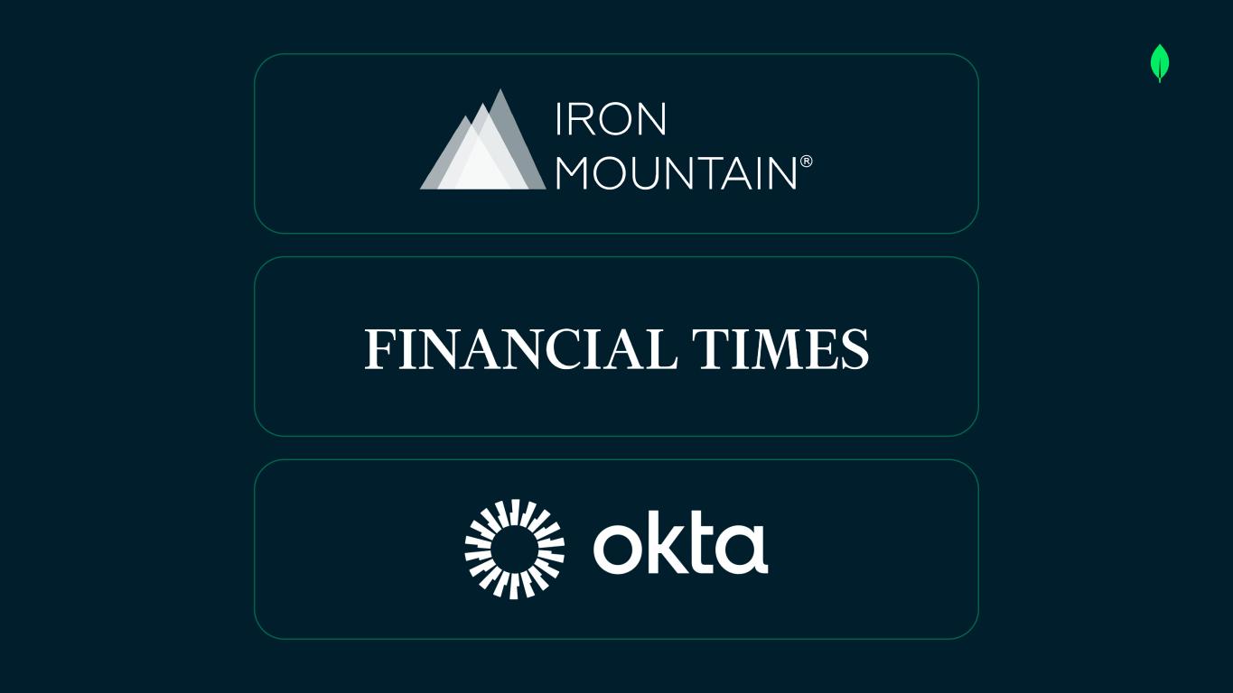 Safe Harbor This presentation and the accompanying oral presentation have been prepared by MongoDB, Inc. (“MongoDB” or the “company”) for informational purposes only and not for any other purpose. Nothing contained in this presentation is, or should be construed as, a recommendation, promise or representation by the presenter or MongoDB or any officer, director, employee, agent or advisor of MongoDB. This presentation does not purport to be all-inclusive or to contain all of the information you may desire. Information provided in this presentation speaks only as of the date hereof, unless otherwise indicated. This presentation contains “forward-looking statements” within the meaning of Section 27A of the Securities Act of 1933, as amended, and Section 21E of the Securities Exchange Act of 1934, as amended, including but not limited to statements regarding our financial outlook, long-term financial targets, product development, business strategy and plans, market trends and market size and opportunities. These forward-looking statements include, but are not limited to, plans, objectives, expectations and intentions and other statements contained in this presentation that are not historical facts and statements, and may be identified by words such as “anticipate,” “believe,” “continue,” “could,” “estimate,” “expect,” “intend,” “may,” “plan,” “project,” “will,” “would” or the negative or plural of these words or similar expressions or variations. These forward-looking statements reflect our current views about our plans, intentions, expectations, strategies and prospects, which are based on the information currently available to us and on assumptions we have made. Although we believe that our plans, intentions, expectations, strategies and prospects as reflected in or suggested by those forward-looking statements are reasonable, we can give no assurance that the plans, intentions, expectations or strategies will be attained or achieved. In particular, the development, release, and timing of any features or functionality described for MongoDB products remains at MongoDB s̓ sole discretion. Product roadmaps do not represent a commitment, promise or legal obligation to deliver any material, code, or functionality and you should not rely on them to make your purchase decisions. Furthermore, actual results may differ materially from those described in the forward-looking statements and are subject to a variety of assumptions, uncertainties, risks and factors that are beyond our control including, without limitation: the effects of the ongoing military conflict between Russia and Ukraine and Israel and Hamas on our business and future operating results; economic downturns and/or the effects of changes in trade policies, rising interest rates, inflation and volatility in the global economy and financial markets on our business and future operating results; our potential failure to meet publicly announced guidance or other expectations about our business and future operating results; our limited operating history; our history of losses; failure of our platform to satisfy customer demands; the effects of increased competition; our investments in new products and our ability to introduce new features, services or enhancements; social, ethical, regulatory and security issues relating to the use of new and evolving technologies, such as artificial intelligence, in our offerings or partnerships; our ability to effectively expand our sales and marketing organization; our ability to continue to build and maintain credibility with the developer community; our ability to add new customers or increase sales to our existing customers; our ability to maintain, protect, enforce and enhance our intellectual property; the growth and expansion of the market for database products and our ability to penetrate that market and increase market share; our ability to take advantage of market opportunities and drive growth and operating efficiency in new markets; our ability to increase Atlas consumption, expand operating margin, drive meaningful free cash flow and improve efficiency; our ability to integrate acquired businesses and technologies successfully or achieve the expected benefits of such acquisitions; our ability to maintain the security of our software and adequately address privacy concerns; our ability to manage our growth effectively and successfully recruit and retain additional highly-qualified personnel; and the price volatility of our common stock. These and other risks and uncertainties are more fully described in our filings with the Securities and Exchange Commission (“SEC”), including in the section entitled “Risk Factors” in our Quarterly Report on Form 10-Q for the quarter ended July 31, 2025 and in other filings and reports we may file from time to time with the SEC. This presentation includes market and industry data and forecasts that the company has derived from independent consultant reports, publicly available information, various industry publications, other published industry sources, and its internal data and estimates. Independent consultant reports, industry publications and other published industry sources generally indicate that the information contained therein was obtained from sources believed to be reliable. Although the company believes that these third-party sources are reliable, it does not guarantee the accuracy or completeness of this information, and the company has not independently verified this information. The company's internal data and estimates are based upon information obtained from trade and business organizations and other contacts in the markets in which the company operates and management's understanding of industry conditions. Although the company believes that such information is reliable, it has not had this information verified by any independent sources. In addition, the information contai
