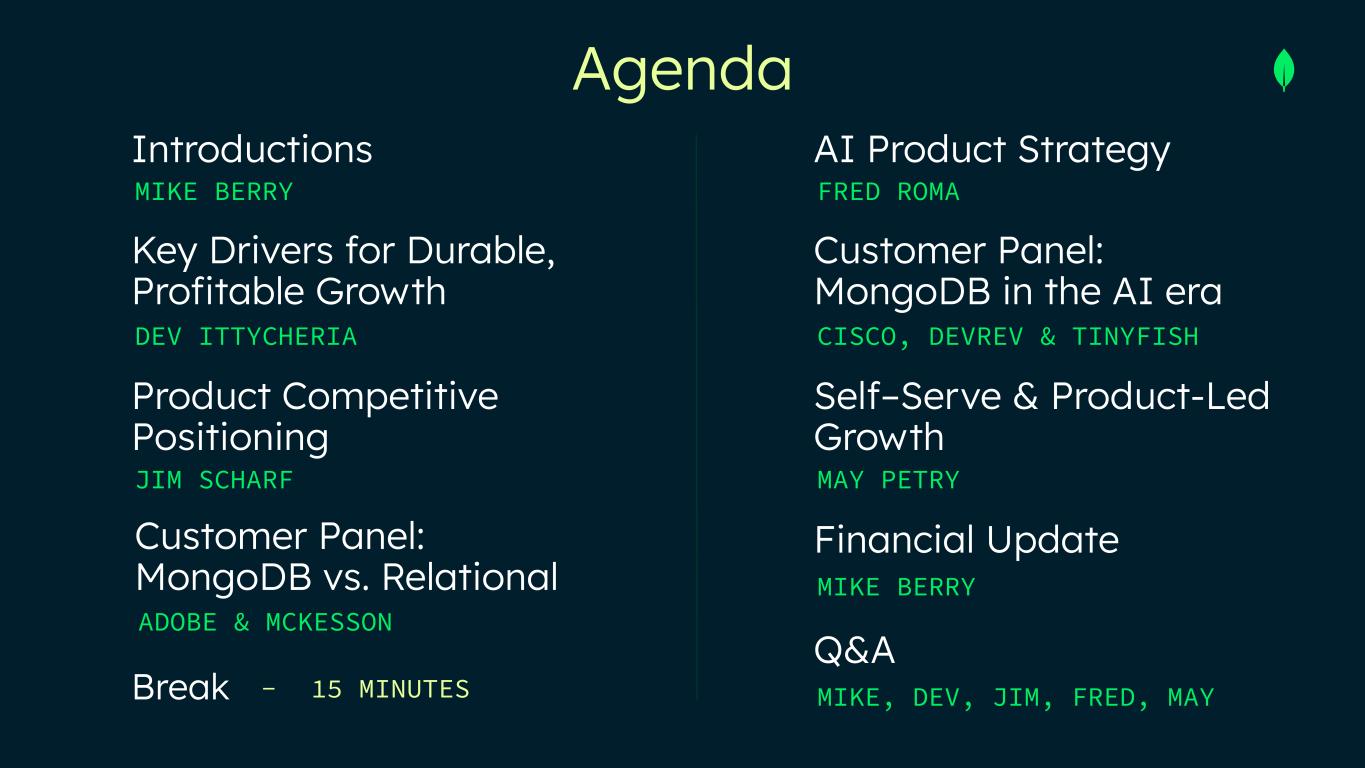 Customer Panel: MongoDB vs. Relational Key Drivers for Durable, Profitable Growth MIKE BERRY Agenda Introductions Break DEV ITTYCHERIA Product Competitive Positioning JIM SCHARF FRED ROMA AI Product Strategy Customer Panel: MongoDB in the AI era CISCO, DEVREV & TINYFISH Self–Serve & Product-Led Growth MAY PETRY Financial Update MIKE BERRY Q&A MIKE, DEV, JIM, FRED, MAY- 15 MINUTES ADOBE & MCKESSON