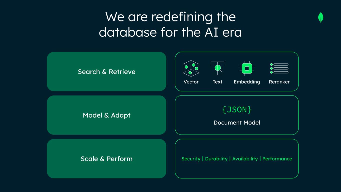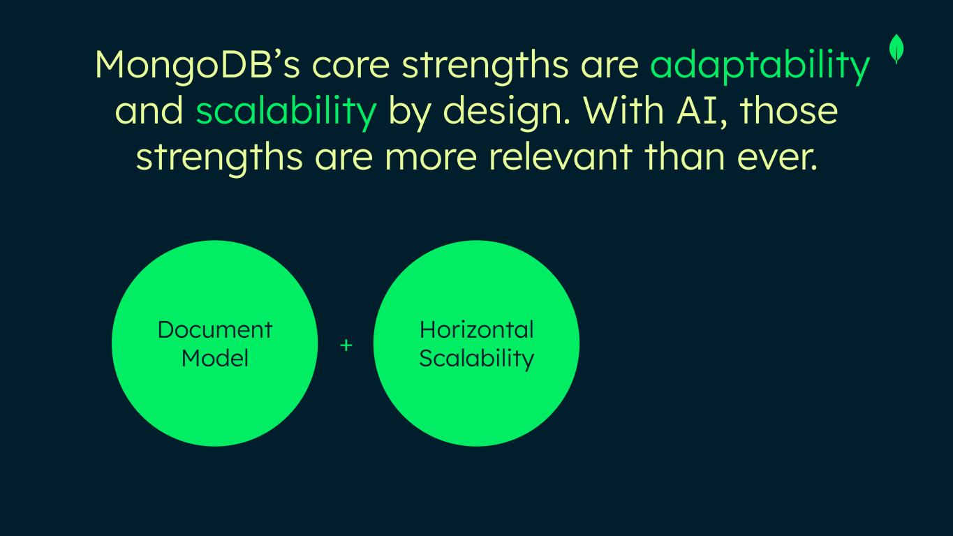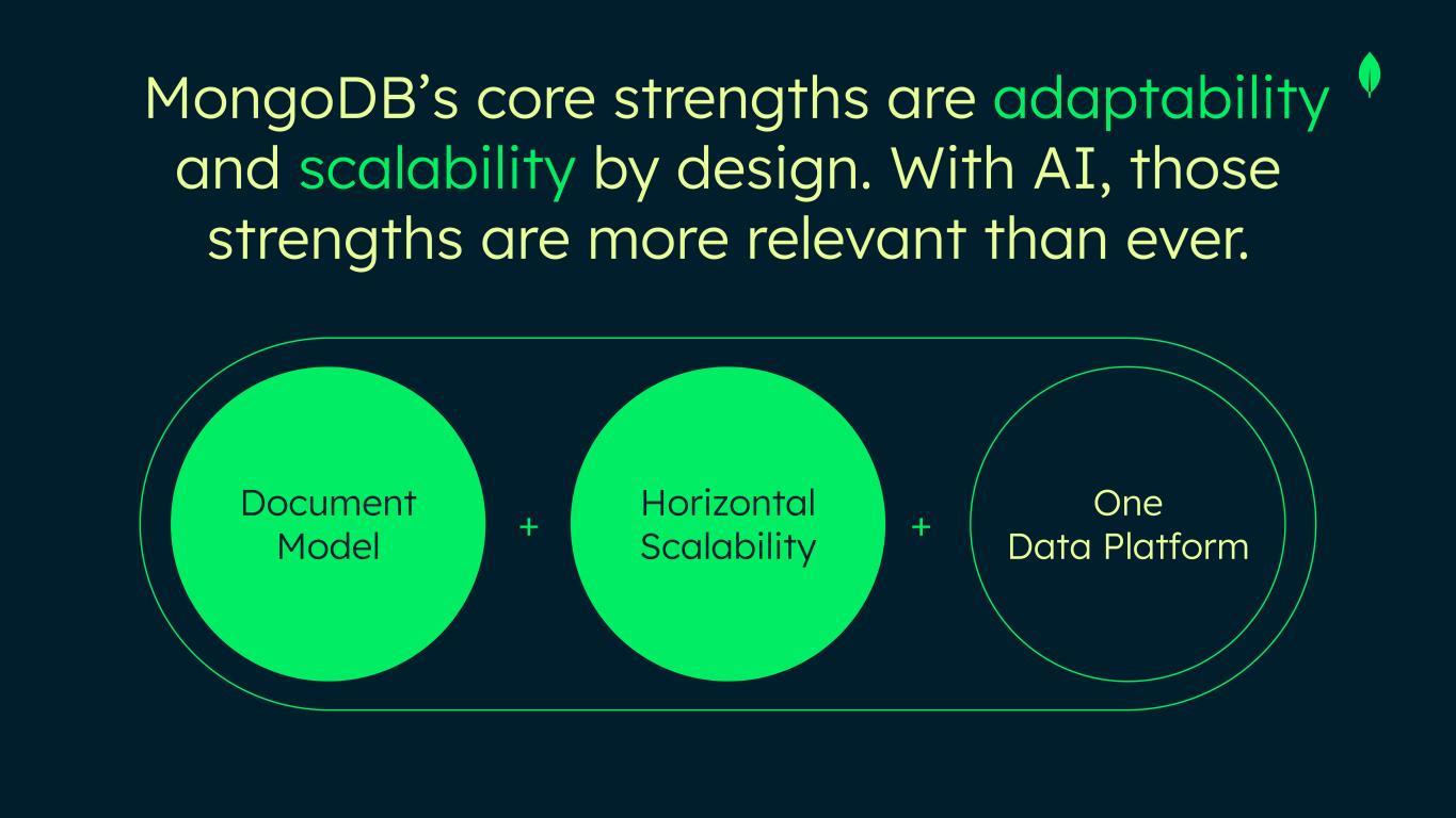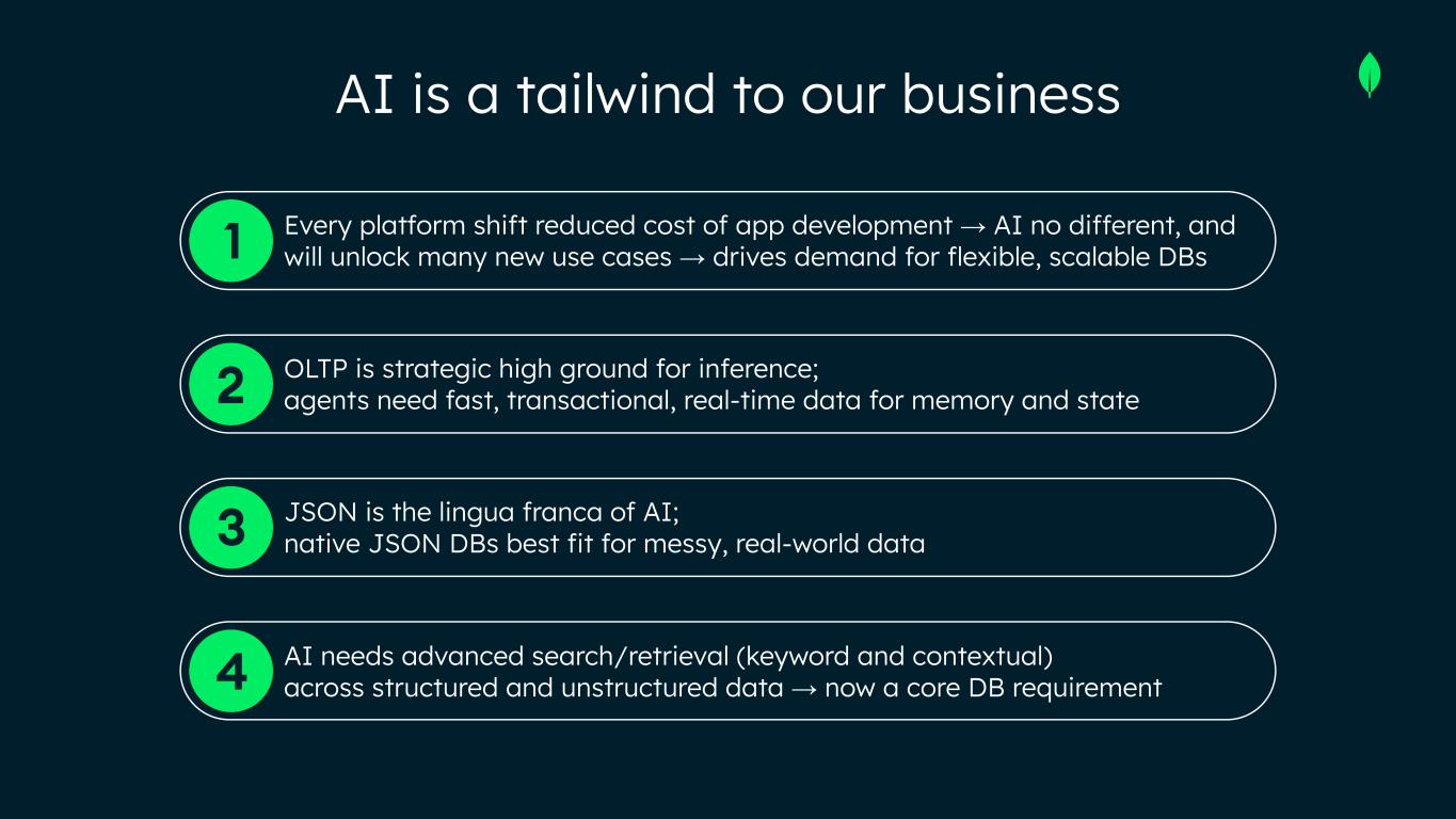 Every platform shift reduced cost of app development → AI no different, and will unlock many new use cases → drives demand for flexible, scalable DBs OLTP is strategic high ground for inference; agents need fast, transactional, real-time data for memory and state JSON is the lingua franca of AI; native JSON DBs best fit for messy, real-world data AI needs advanced search/retrieval (keyword and contextual) across structured and unstructured data → now a core DB requirement AI is a tailwind to our business